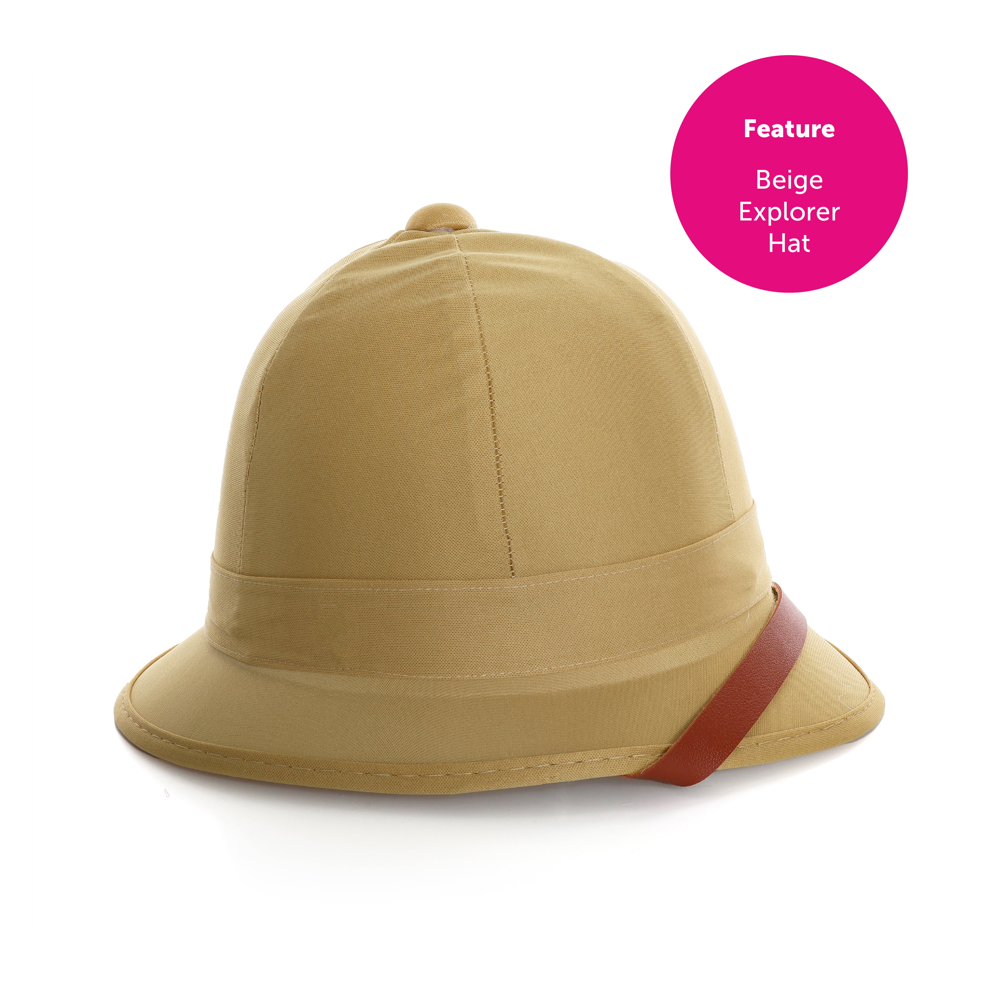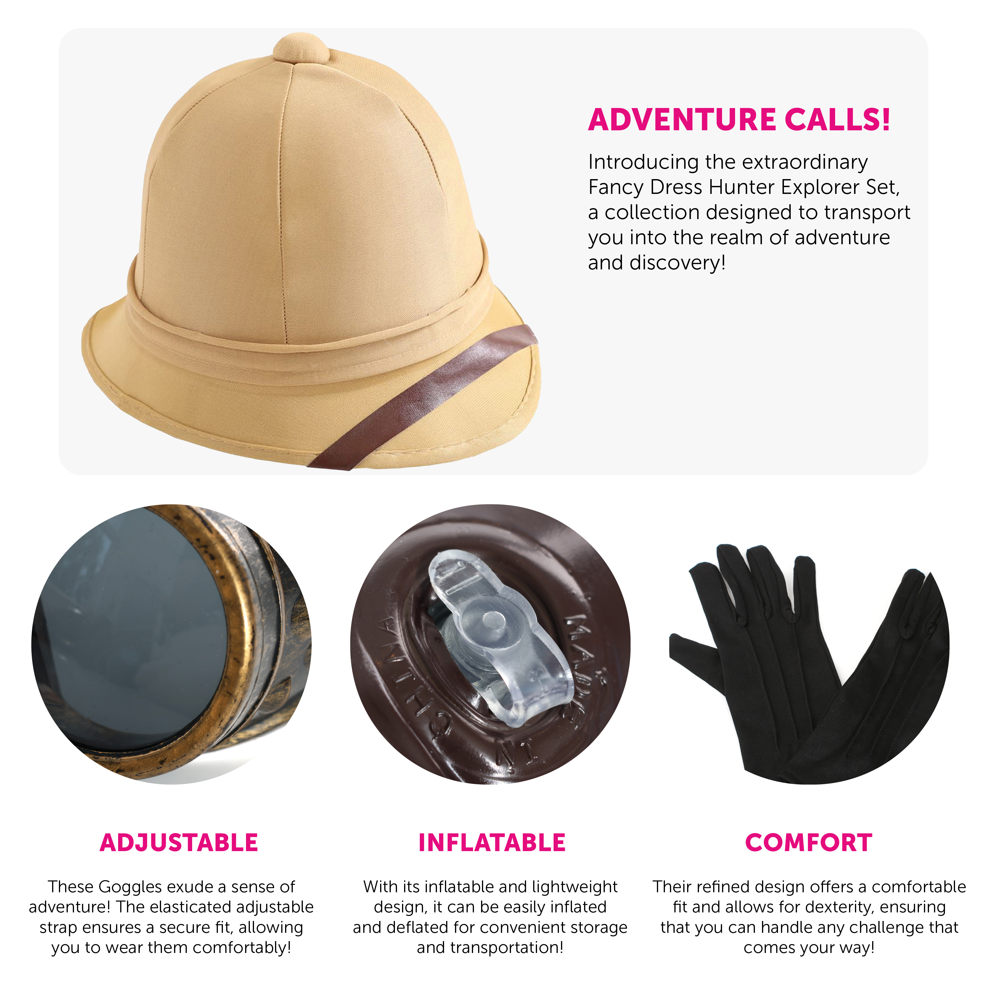 ACCESSORY SET INCLUDES: Your Adults Hunter Explorer Accessory Set includes a tall, sandy coloured Pith Hat, Bronze Goggles with an adjustable Strap, an Inflatable Tommy Gun, an adhesive Black Curled Moustache, and a pair of Black Gloves, the perfect accessories for your Costume!