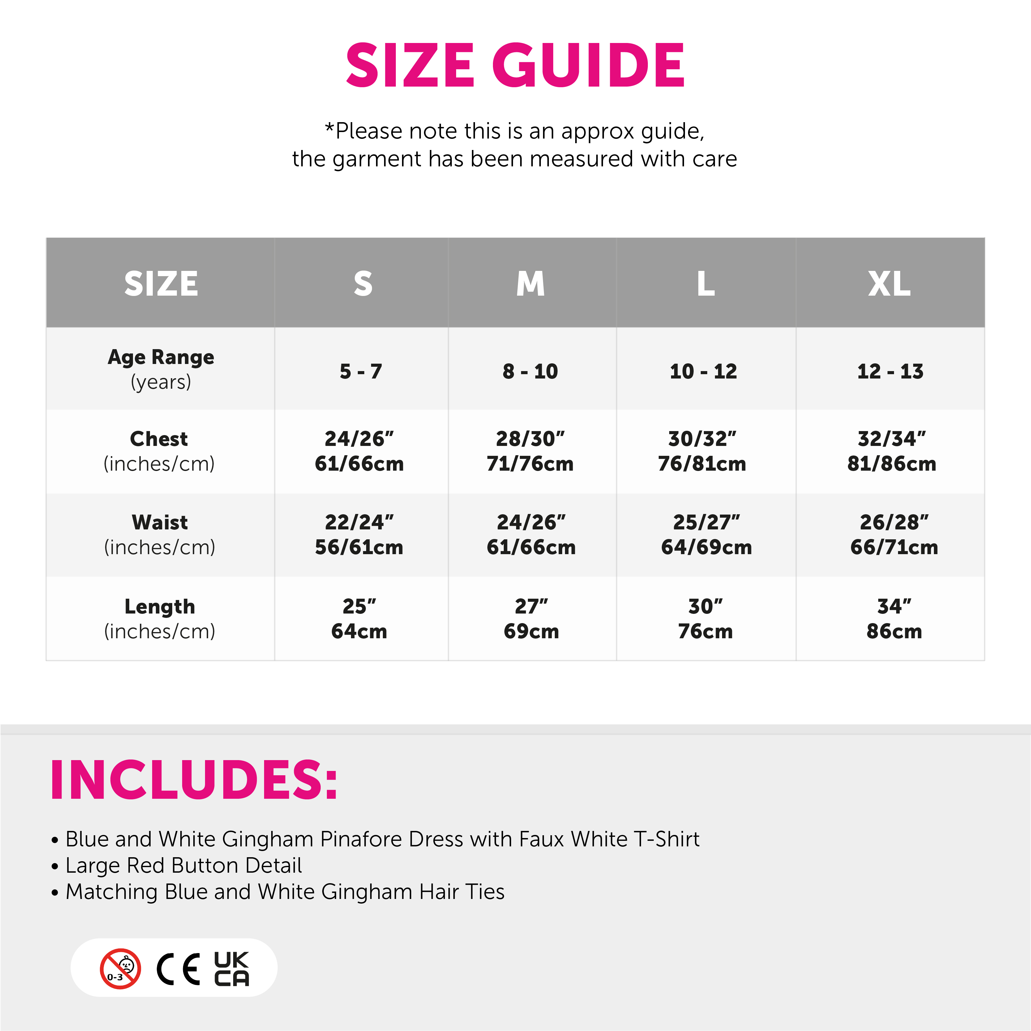 AVAILABLE IN MULTIPLE SIZES: This Kansas Girl Costume is available in multiple sizes from Small – X-Large: Small - 5-7 Years - Chest: 24-26"/61-66cm, Waist: 22-24"/56-61cm, Length: 25"/64cm | Medium - 8-10 Years - Chest: 28-30"/71-76cm, Waist: 24-26"/61-66cm, Length: 27"/69cm | Large - 10-12 Years - Chest: 30-32"/76-81cm, Waist: 25-27"/64-69cm, Length: 30"/76cm | X-Large - 12-13 Years: Chest: 32-34"/81-86cm, Waist: 26-28"/66-71cm, Length: 34"/86cm