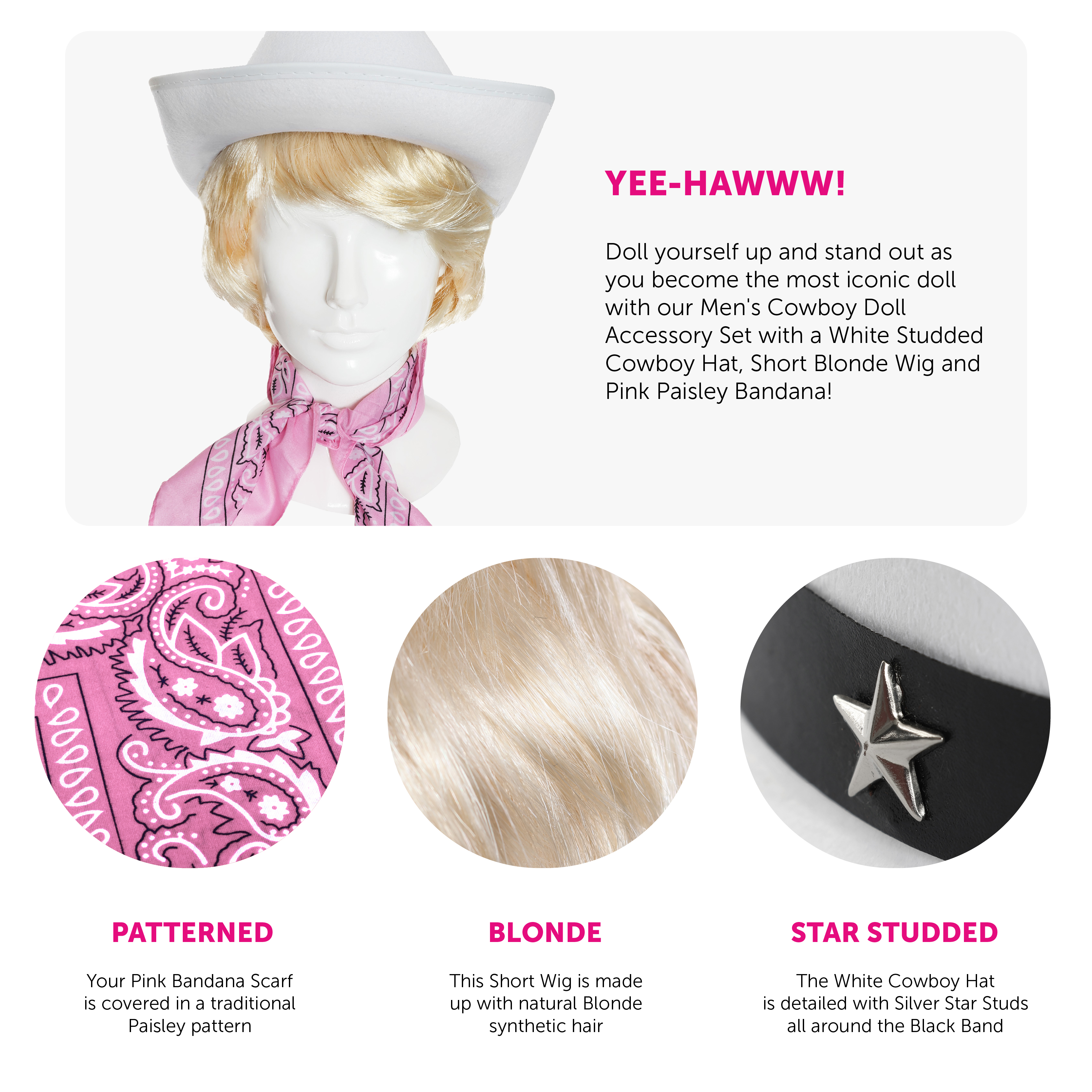 COWBOY DOLL ACCESSORY SET: Doll yourself up and stand out as you become the most iconic doll with our Men's Cowboy Doll Accessory Set with a White Studded Cowboy Hat, Short Blonde Wig and Pink Paisley Bandana!