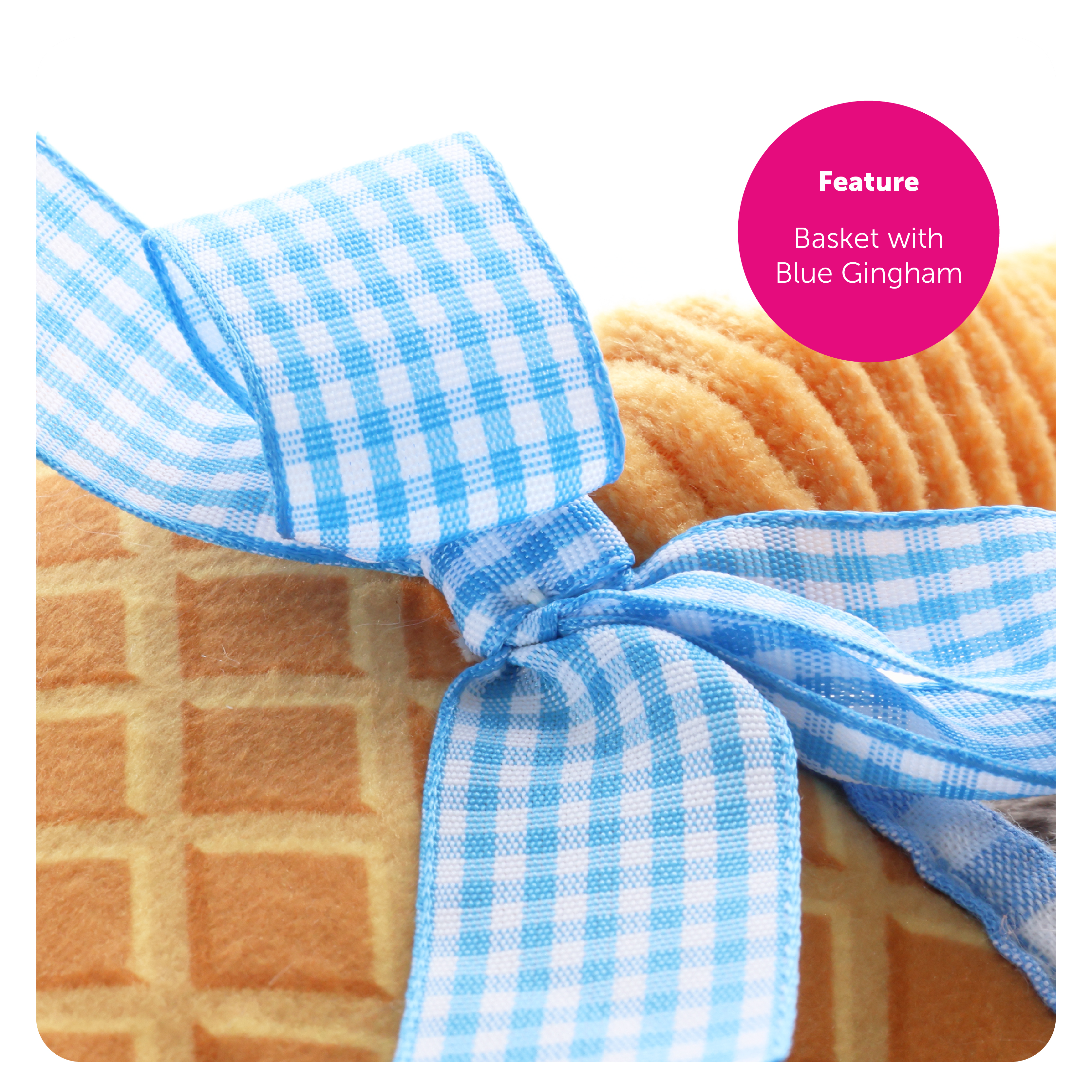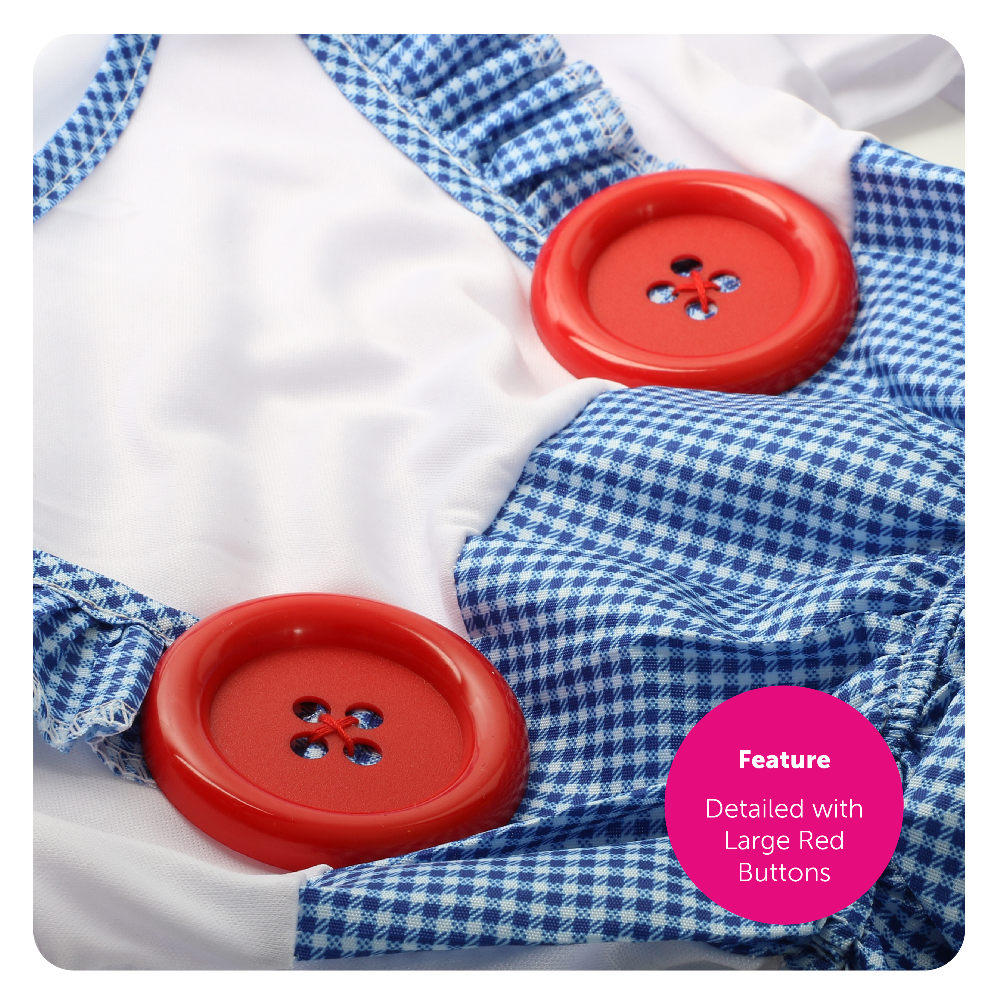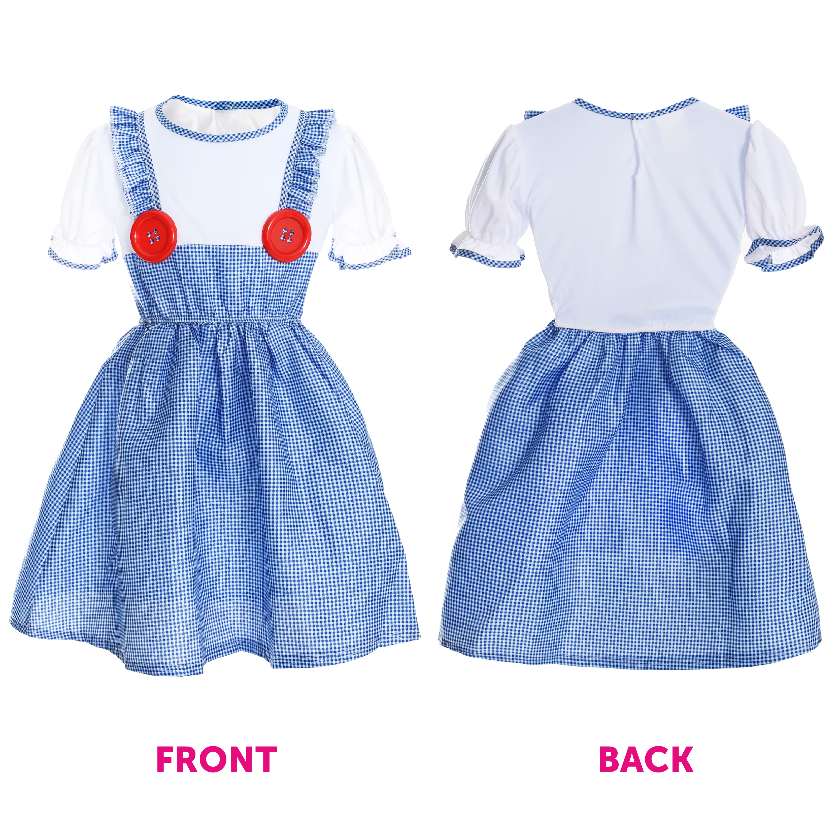 COSTUME INCLUDES: Our Child's Kansas Girl Costume includes a Blue and White Gingham Pinafore Dress with a White T-Shirt design, Large Red Plastic Buttons detailing on the straps, matching Gingham Hair Ties, and a Soft Blue Gingham Basket with a Plush Grey Terrier Dog Toy!