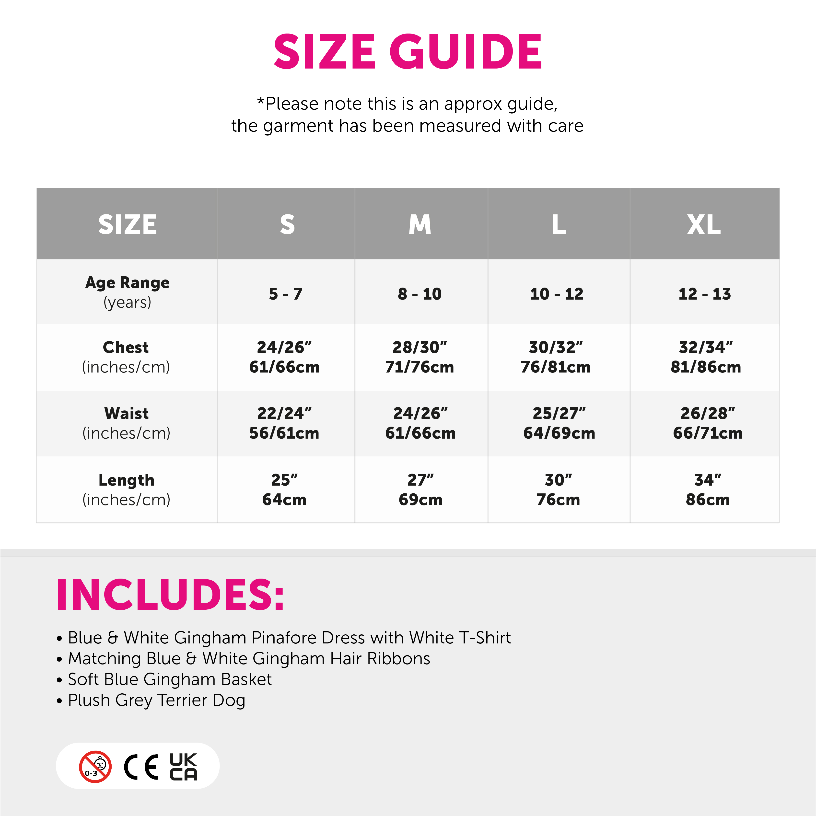 AVAILABLE IN MULTIPLE SIZES: This Kansas Girl Costume is available in multiple sizes from Small – X-Large: Small (5 - 7 years), Chest 24/26" (61/66cm), Waist 22/24" (56/61cm), Length 25" (64cm) | Medium (8 - 10 years) Chest 28/30" (71/76cm), Waist 24/26" (61/66cm), Length 27" (69cm) | Large (10 - 12 years) Chest 30/32" (76/81cm), Waist 25/27" (64/69cm), Length 30" (76cm) | X-Large (12 - 13 years) Chest 32/34" (81/86cm), Waist 26/28" (66/71cm), Length 34" (86cm)