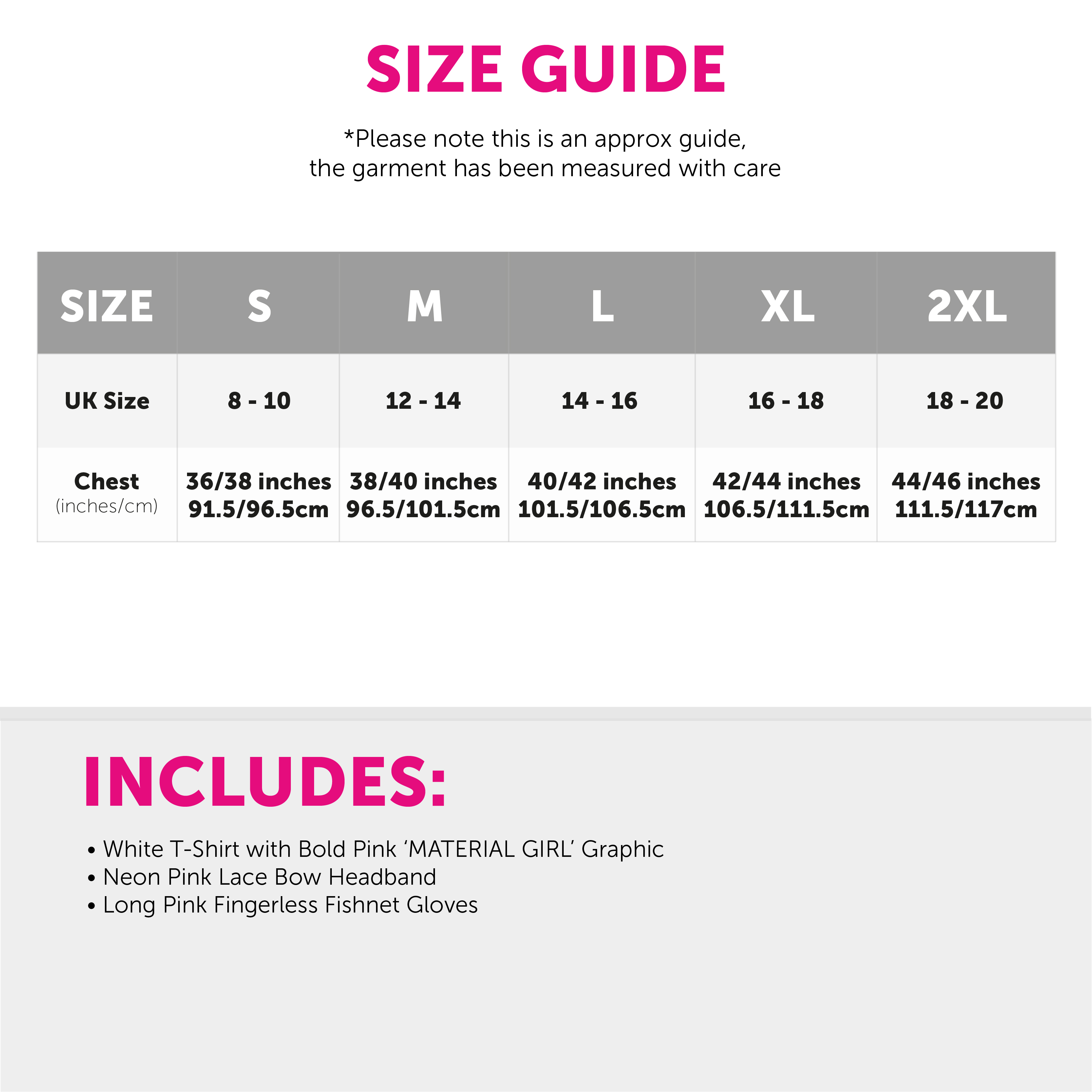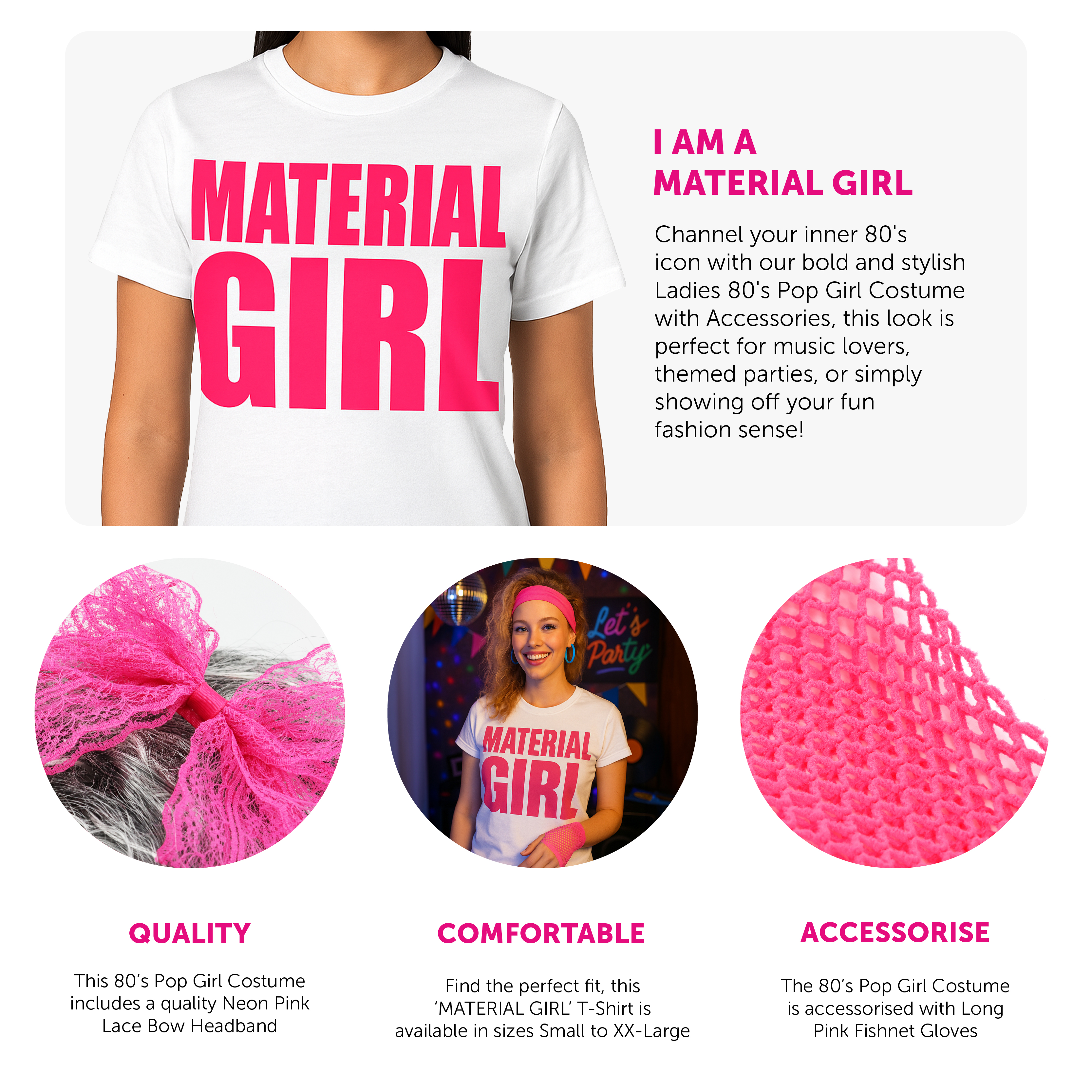 COSTUME INCLUDES: This 80's Pop Girl Costume includes a crisp White T-Shirt with a bold Pink 'Material Girl' graphic on the front, a pair of Long Hot Pink Fingerless Fishnet Gloves, and a Hot Pink Lace Bow Headband, perfect for any 80's event!