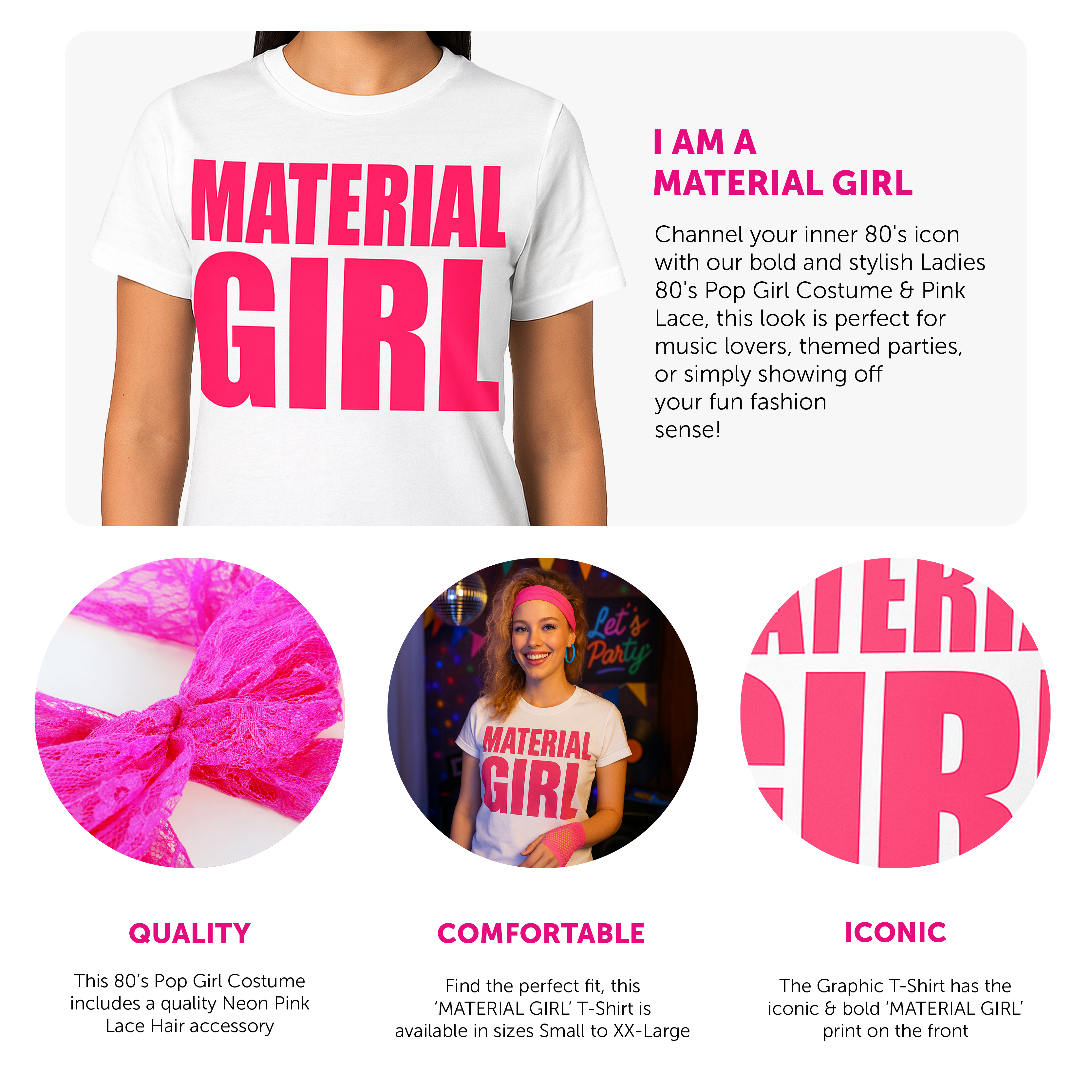 COSTUME INCLUDES: This 80's Pop Girl Costume includes a crisp White T-Shirt with a bold Pink 'Material Girl' graphic on the front, and a Hot Pink Lace Hair Tie, perfect for any 80's event!