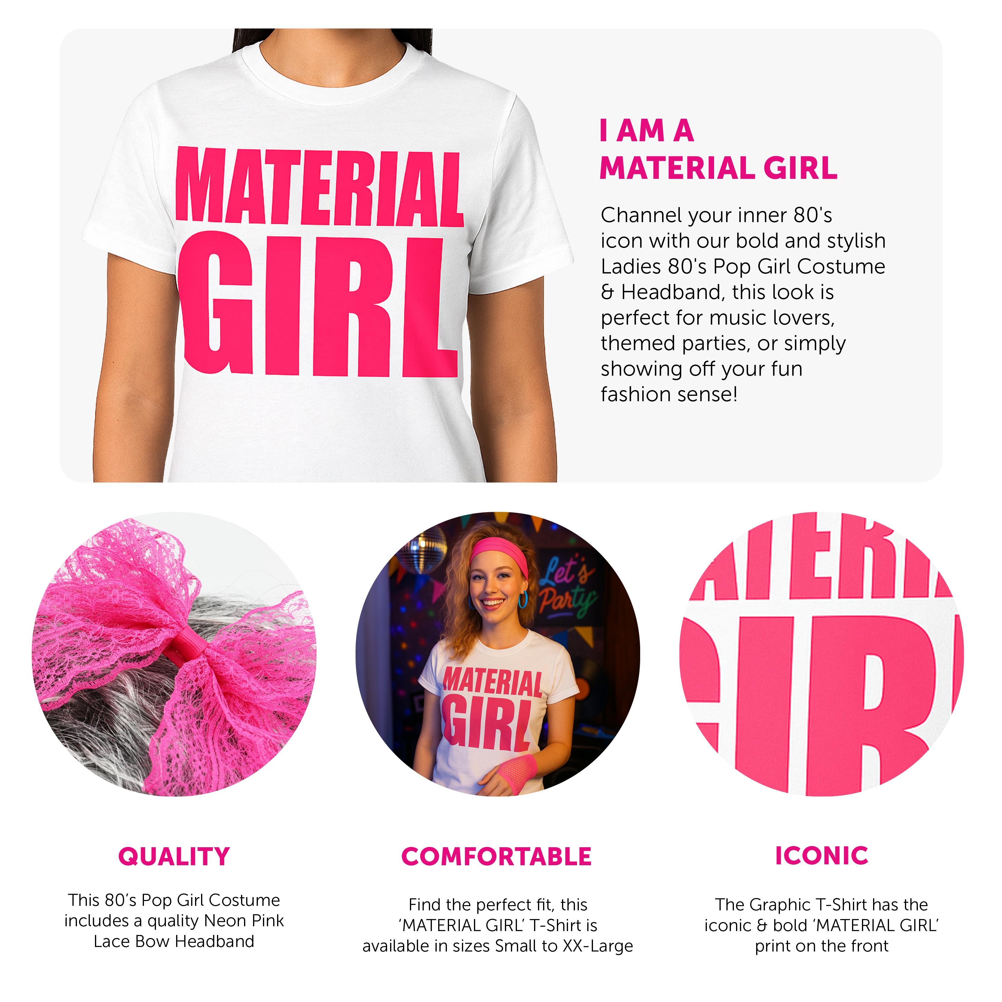 COSTUME INCLUDES: This 80's Pop Girl Costume includes a crisp White T-Shirt with a bold Pink 'Material Girl' graphic on the front, and a Hot Pink Lace Bow Headband, perfect for any 80's event!