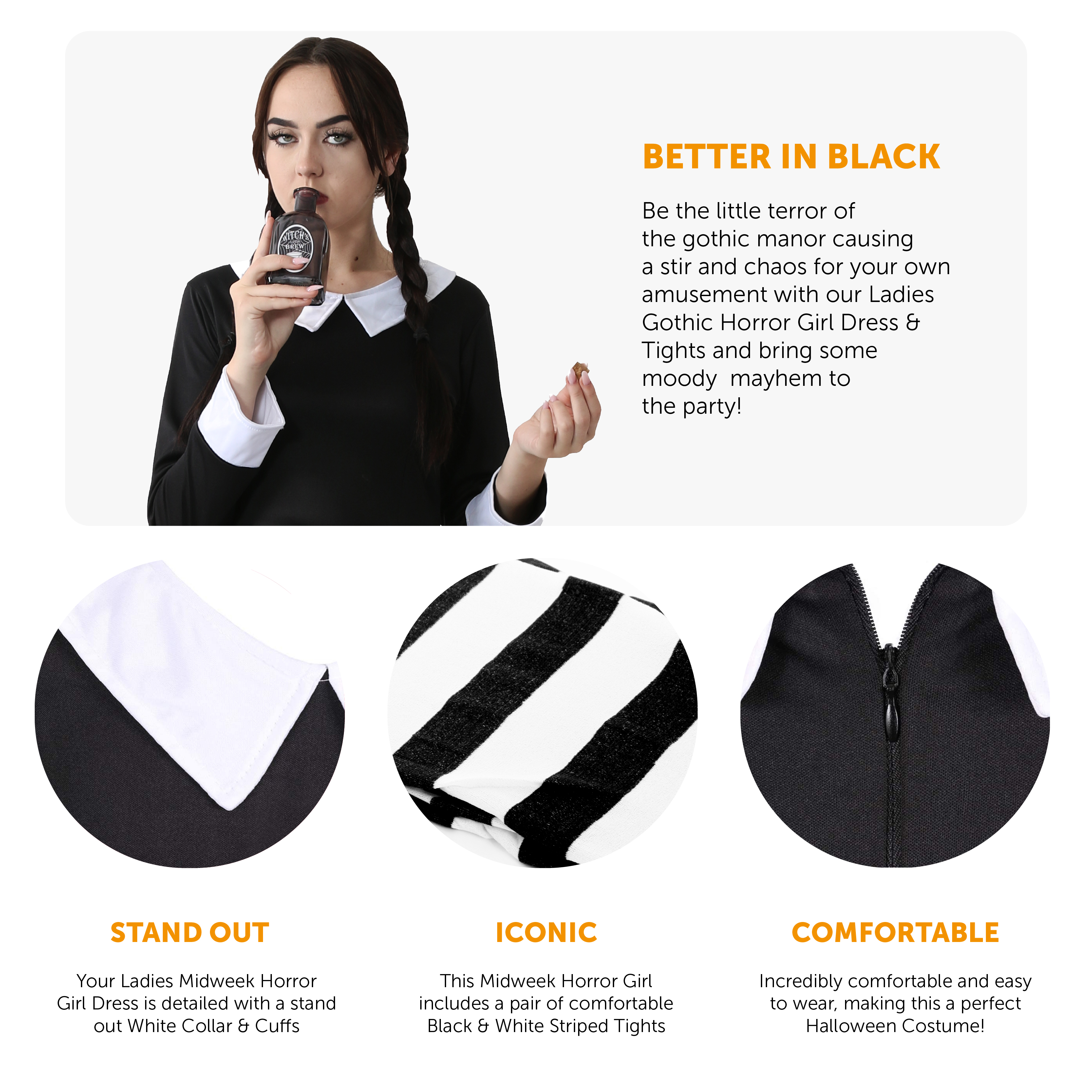 COSTUME INCLUDES: Your Ladies Midweek Horror Girl Costume includes a Long Sleeve Black zip-up Dress with a White Collar & Cuffs, and Black & White Striped Tights!