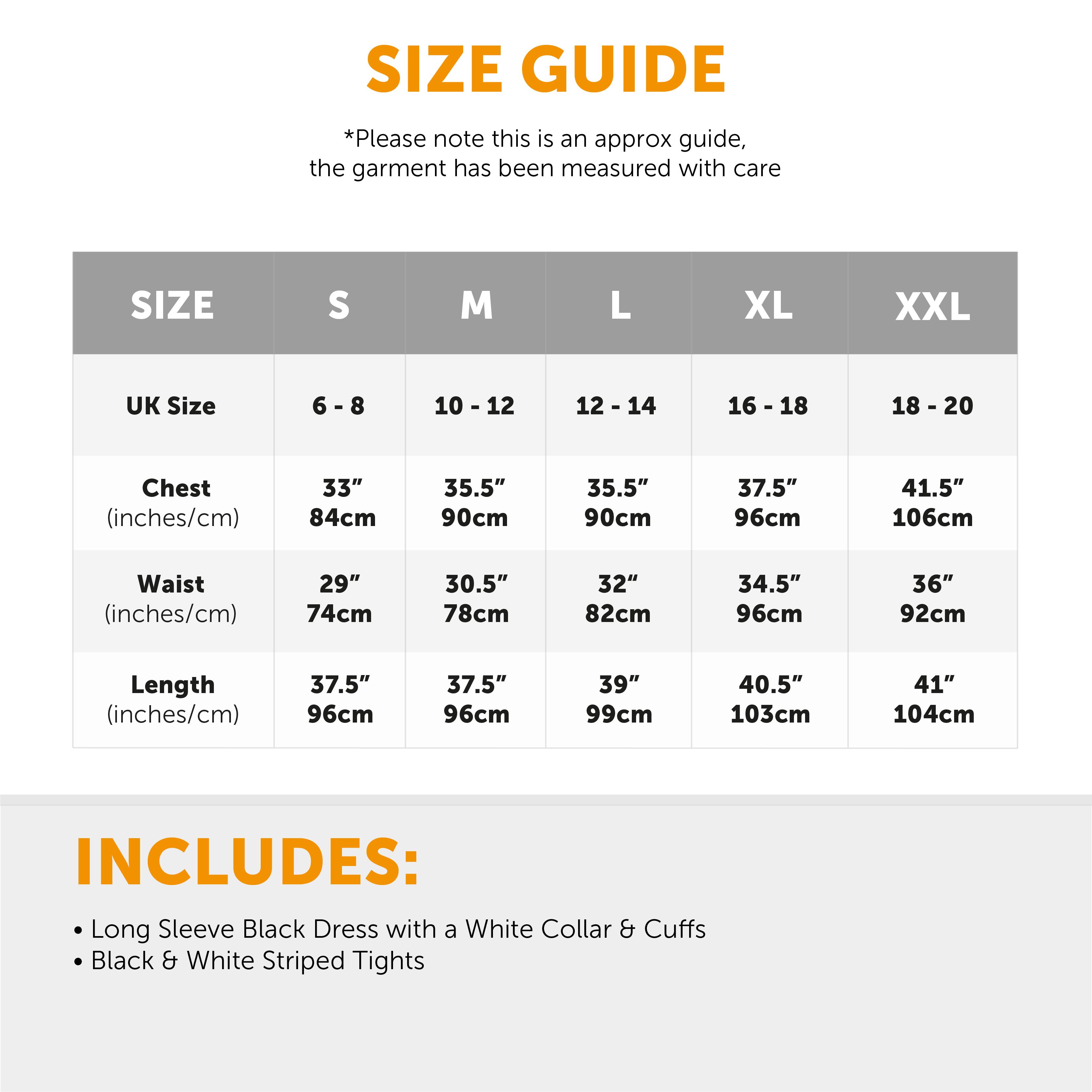 AVAILABLE IN MULTIPLE SIZES: Your Ladies Midweek Horror Girl Dress is available in multiple sizes from Small to XX-Large: Small (UK 6 - 8) Chest 33” (84cm), Waist 29” (74cm), Length 37.5” (96cm) | Medium (UK 10 - 12) Chest 35.5” (90cm), Waist 30.5" (78cm), Length 37.5” (96cm) | Large (UK 12 – 14) Chest 35.5” (90cm), Waist 32“ (82cm), Length 39” (99cm) | X-Large (UK 16 - 18) Chest 37.5” (96cm), Waist 34.5” (96cm), Length 40.5” (103cm) | XX-Large (UK 18 - 20) Chest 41.5” (106cm), Waist 36” (92cm), Length 41” (104cm)