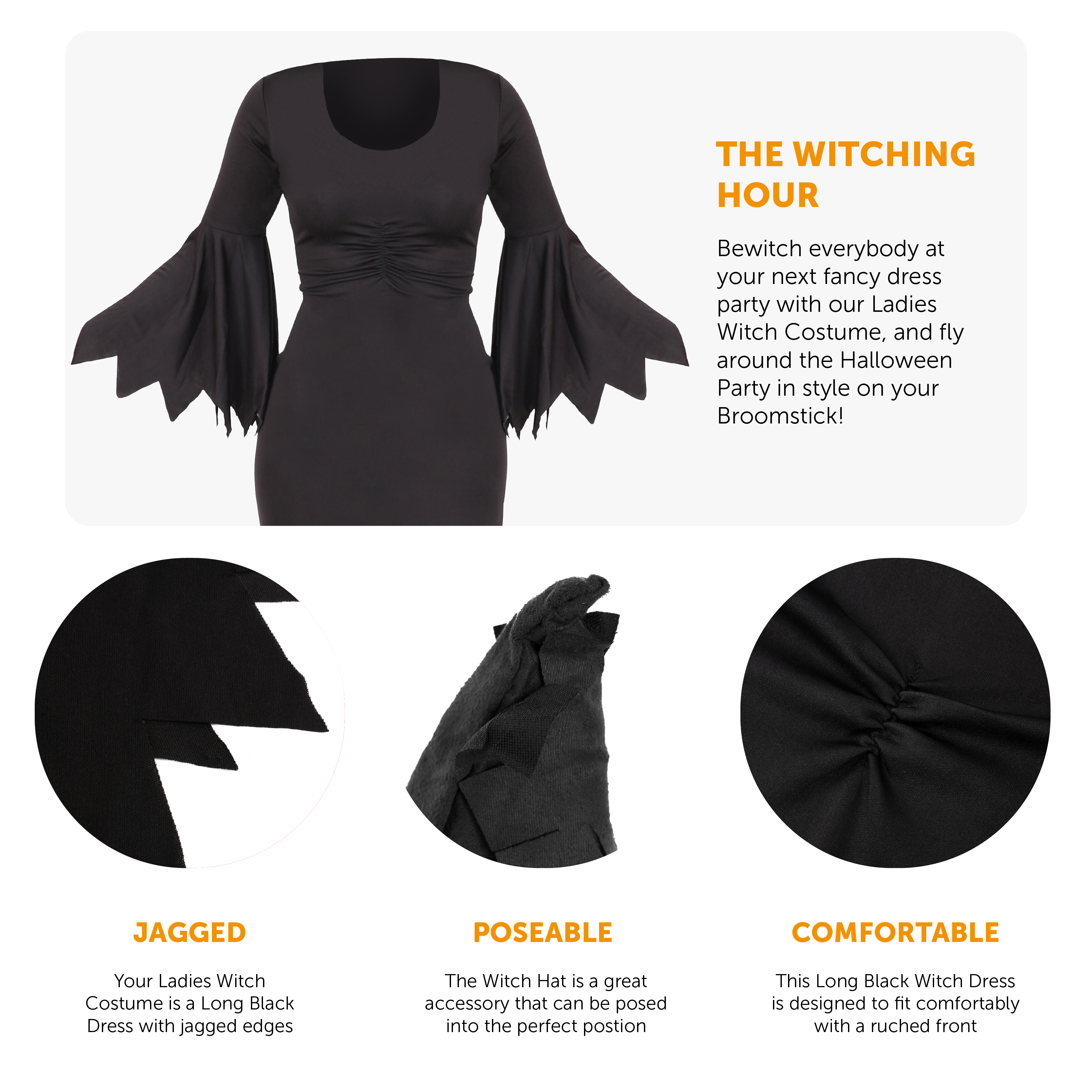 COSTUME INCLUDES: The Ladies Witch Costume Set includes a Long Black Dress with flared sleeves and jagged edging, and a poseable Black Witches Hat with tattered material detail, the perfect look this Halloween!