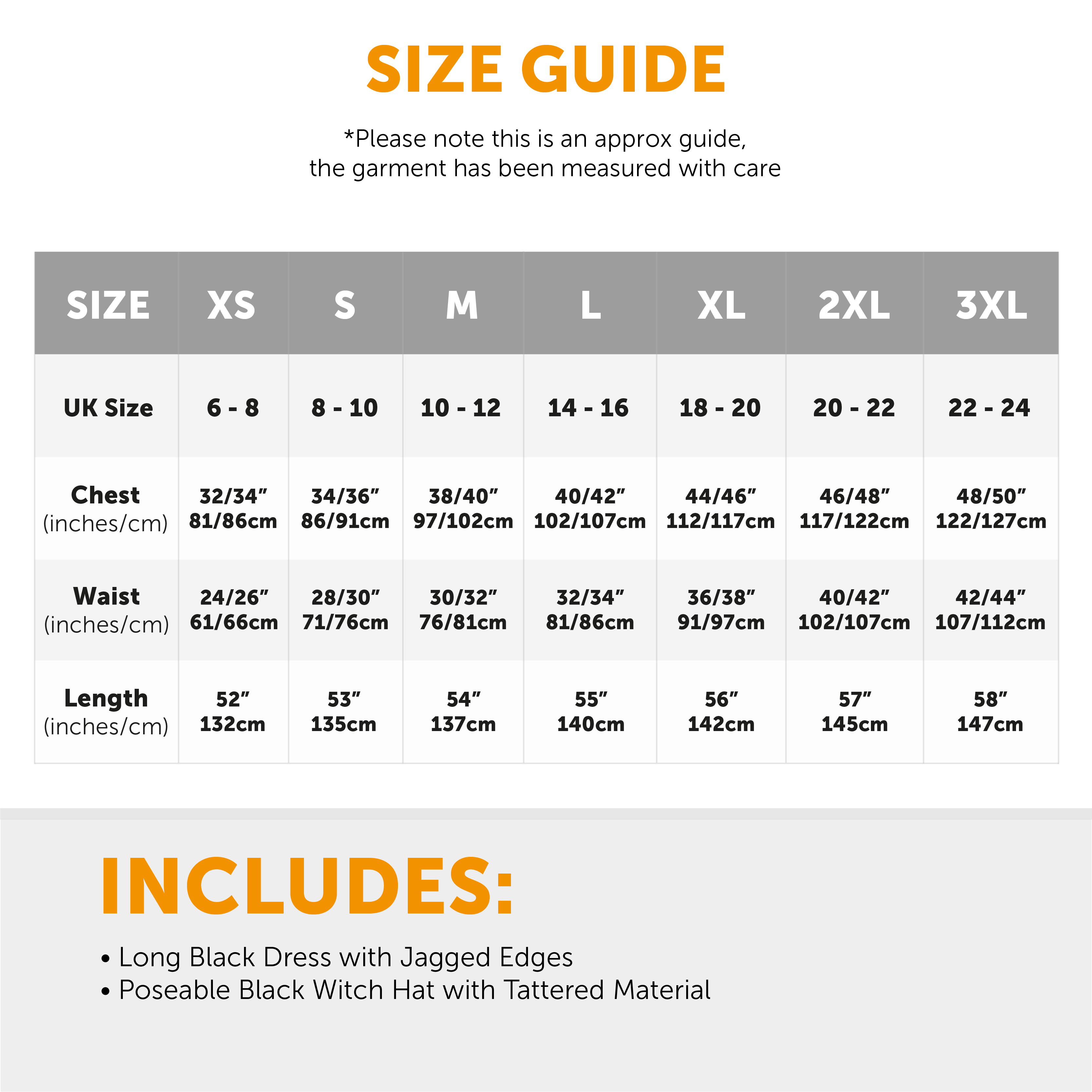 AVAILABLE IN MULTIPLE SIZES: This Ladies Witch Costume is available in various sizes, from x-Small to XXX-Large; X-Small (UK 6-8) - Chest: 32/34" (81/86cm), Waist: 24/26" (61/66cm), Length: 52" (132cm) | Small (UK 8-10) - Chest: 34/36" (86/91cm), Waist: 28/30" (71/76cm), Length: 53" (135cm) | Medium (UK 10-12) - Chest: 38/40" (97/102cm), Waist: 30/32" (76/81cm), Length: 54" (137cm) | Large (UK 14-16) - Chest: 40/42" (102/107cm), Waist: 32/34" (81/86cm), Length: 55" (140cm) | X-Large (UK 18-20) - Chest: 44/46" (112/117cm), Waist: 36/38" (91/97cm), Length: 56" (142cm) | XX-Large (UK 20-22) - Chest: 46/48" (117/122cm), Waist: 40/42" (102/107cm), Length: 57" (145cm) | XXX-Large (UK 22-24) - Chest: 48/50" (122/127cm), Waist: 42/44" (107/112cm), Length: 58" (147cm)