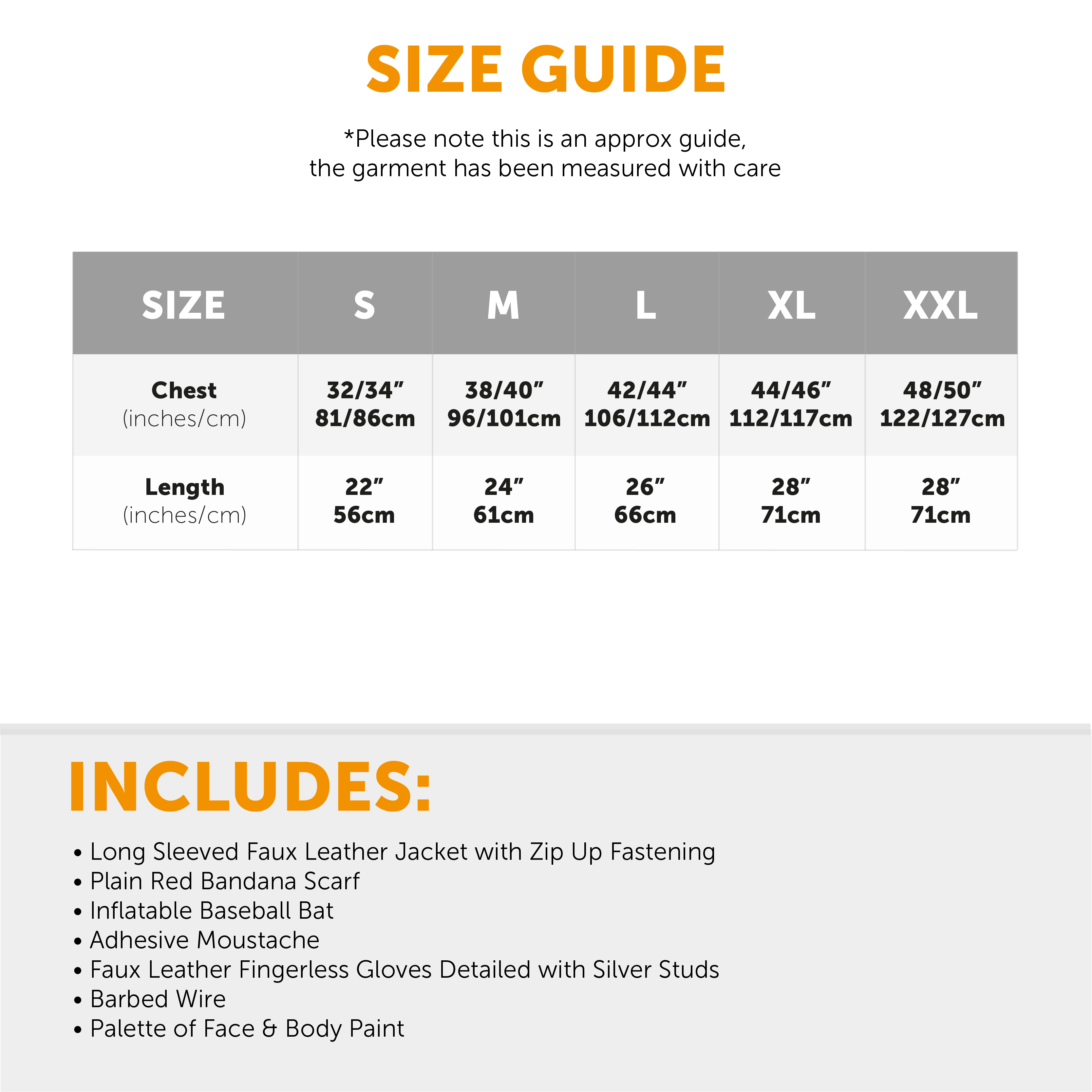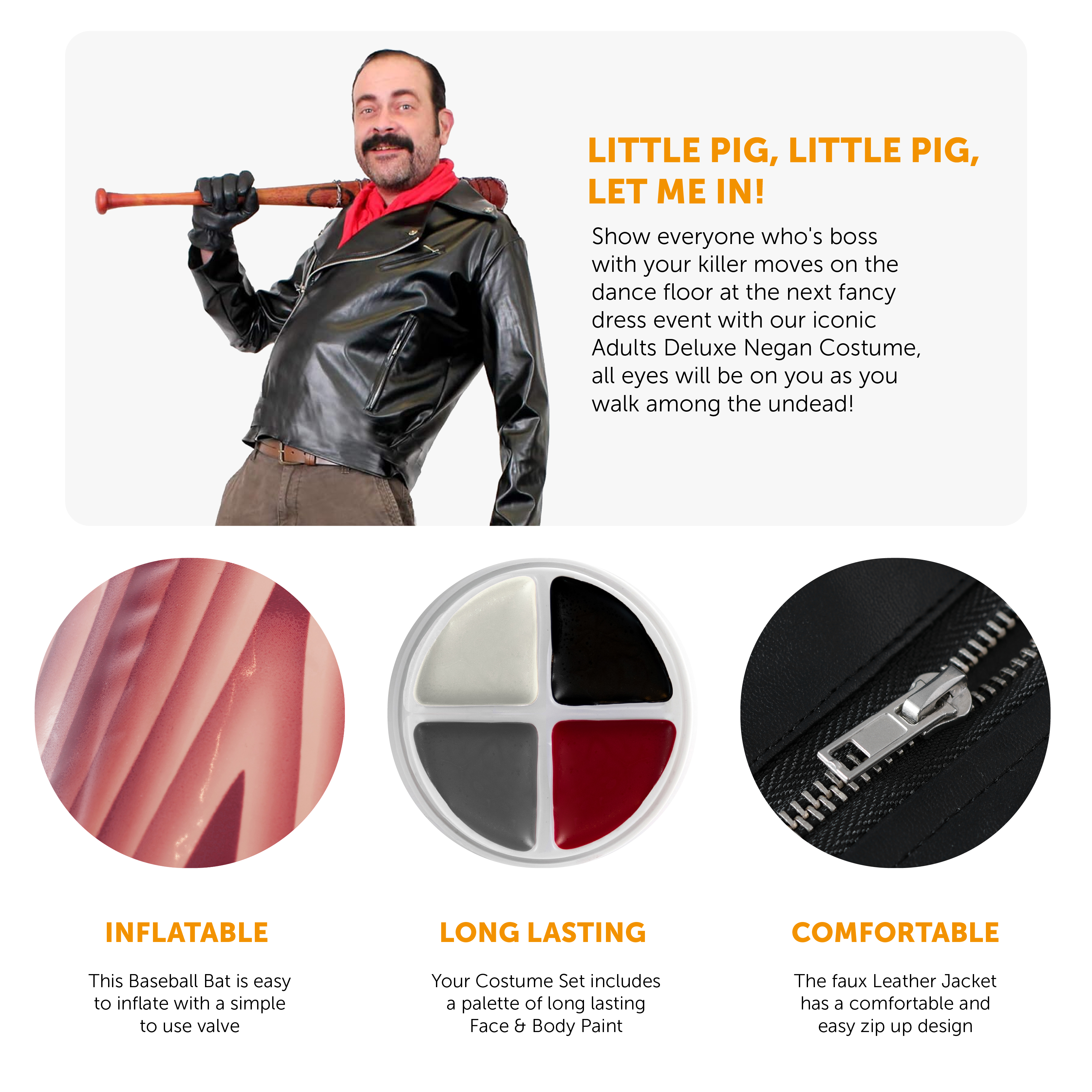 COSTUME INCLUDES: This Adults Deluxe Negan Costume includes a black, long sleeved, Faux Leather Jacket with comfortable zip up fastening, a Plain Red Bandana Scarf, an easy to inflate Baseball Bat, an adhesive Moustache, a pair of Faux Leather Fingerless Gloves detailed with Silver Studs, Barbed Wire, and a palette of Face & Body Paint, the perfect Costume for any fancy dress event!