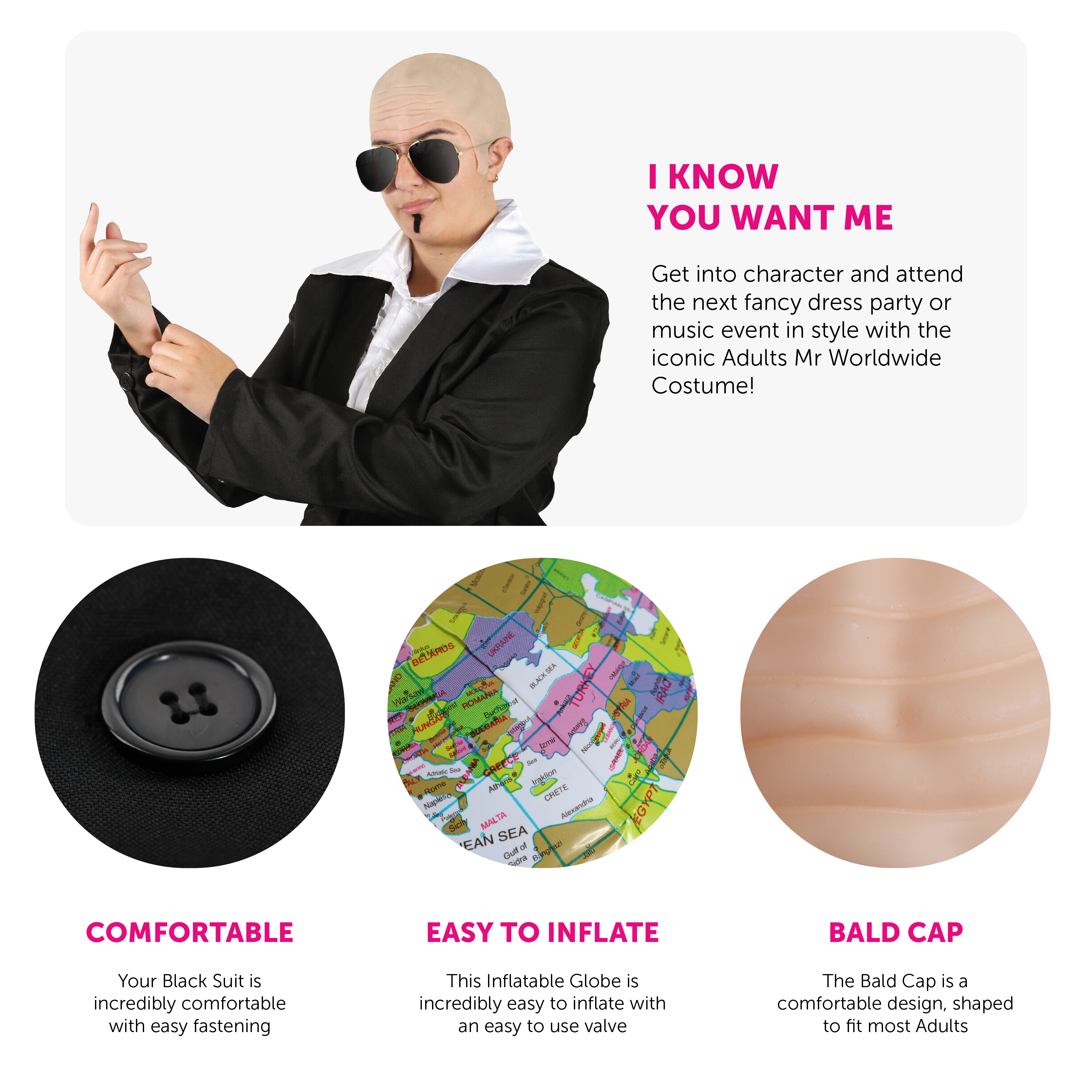 COSTUME INCLUDES: Your Adults Mr Worldwide Costume includes a Black Suit Jacket, matching Black Suit Trousers, a White silk-like Disco Shirt with a Ruffled style and large Collar, nude coloured Bald Cap, Black Lens Aviator Sunglasses, Adhesive Black Goatee and an Inflatable Globe!