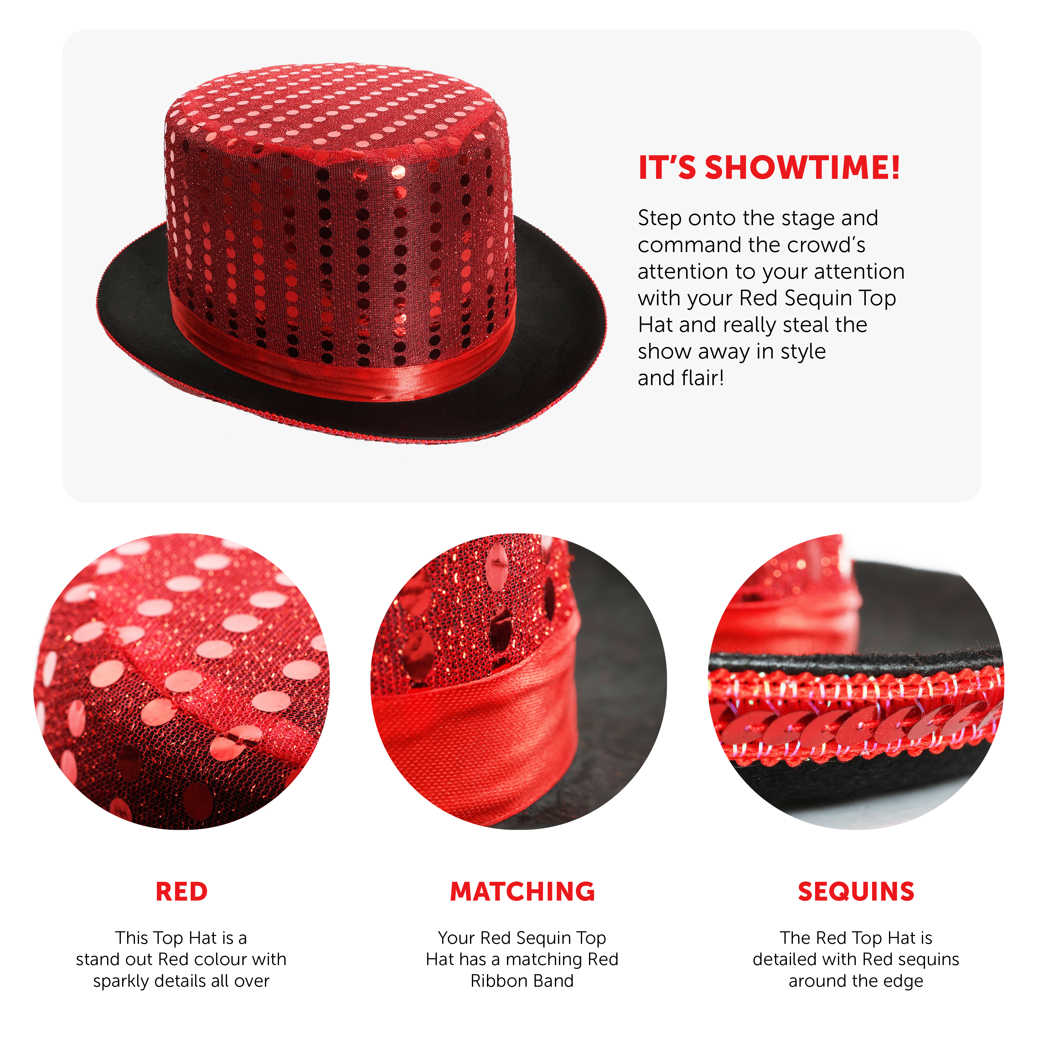 HAT DETAILS: The classic Top Hat design has been brought back to life with a fantastic new style! Your Top Hat has a Red and Black Satin quality with matching Red Sequin details on the top, and a Red detailed trim!