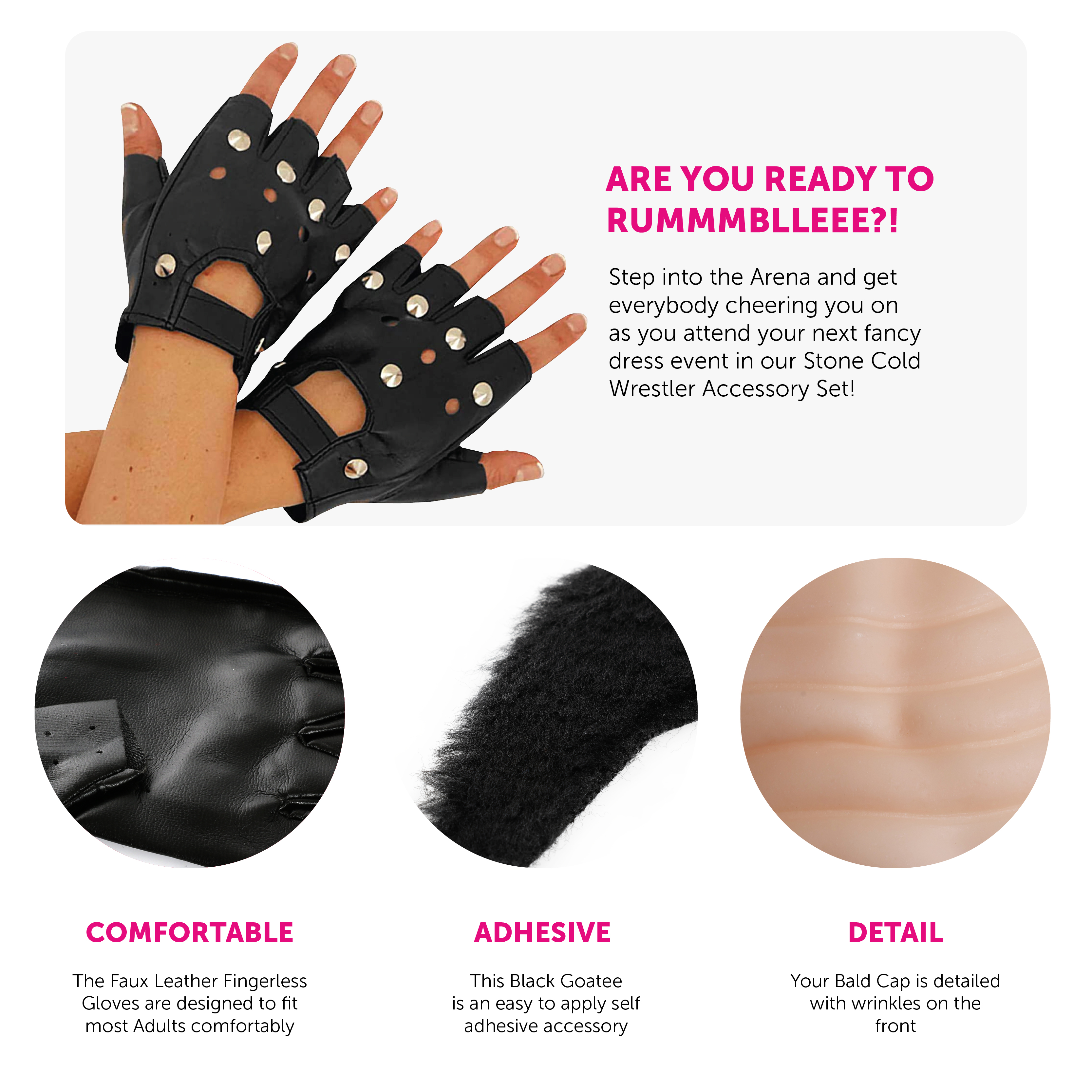 SET INCLUDES: This Stone Cold Wrestler Accessory Set includes a light complexion Bald Cap, an easy to apply self adhesive Black Goatee, and a pair of Black Fingerless Gloves with Silver Studs, to help you finish off your desired look!