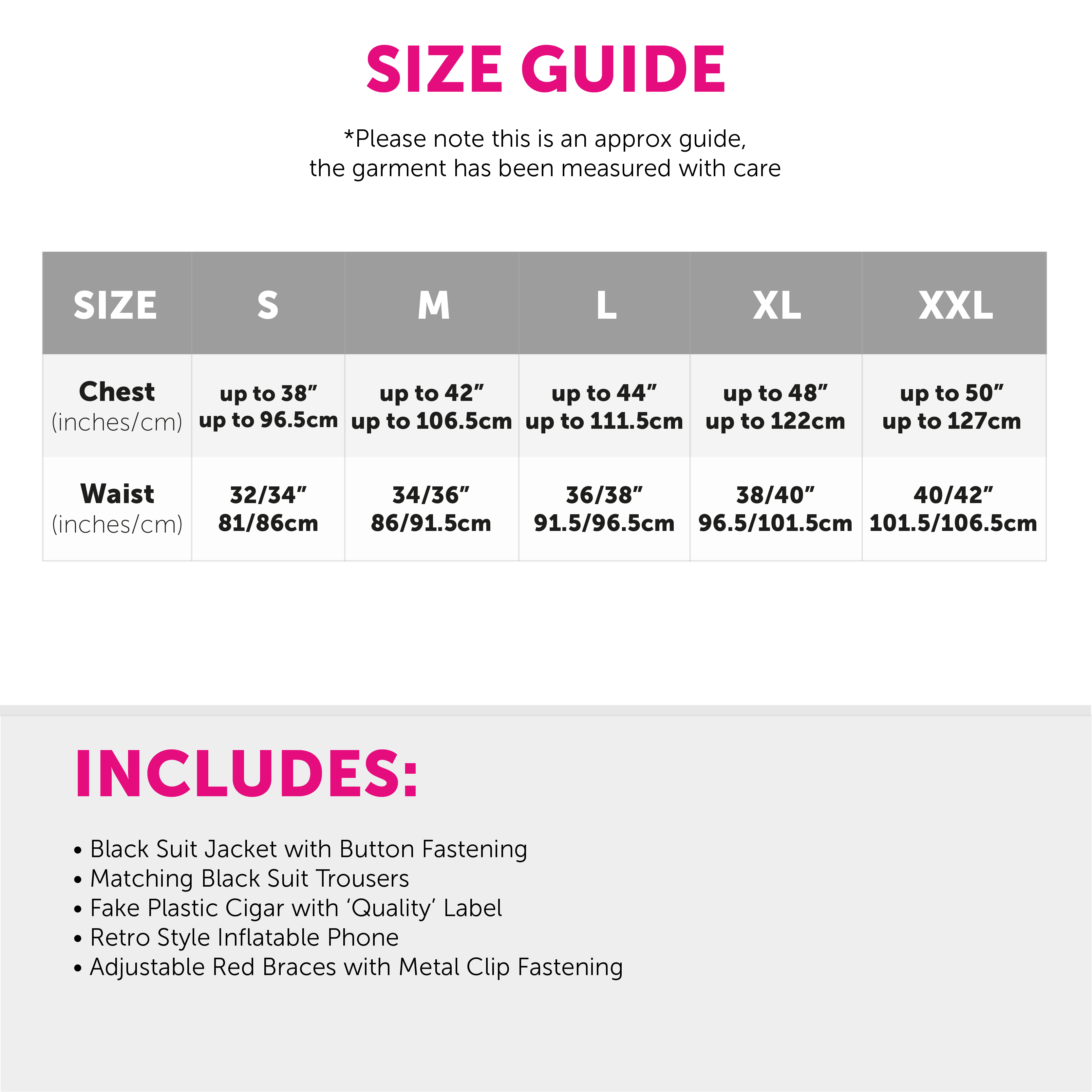 COSTUME INCLUDES: The Adults Wall Street Wolf Costume Set includes a Black Suit Jacket and matching Suit Trousers, adjustable Red Braces with metal clip fasteners, a Plastic Cigar with a 'Quality' label and a retro style Inflatable Phone, the perfect Costume for any themed fancy dress event!