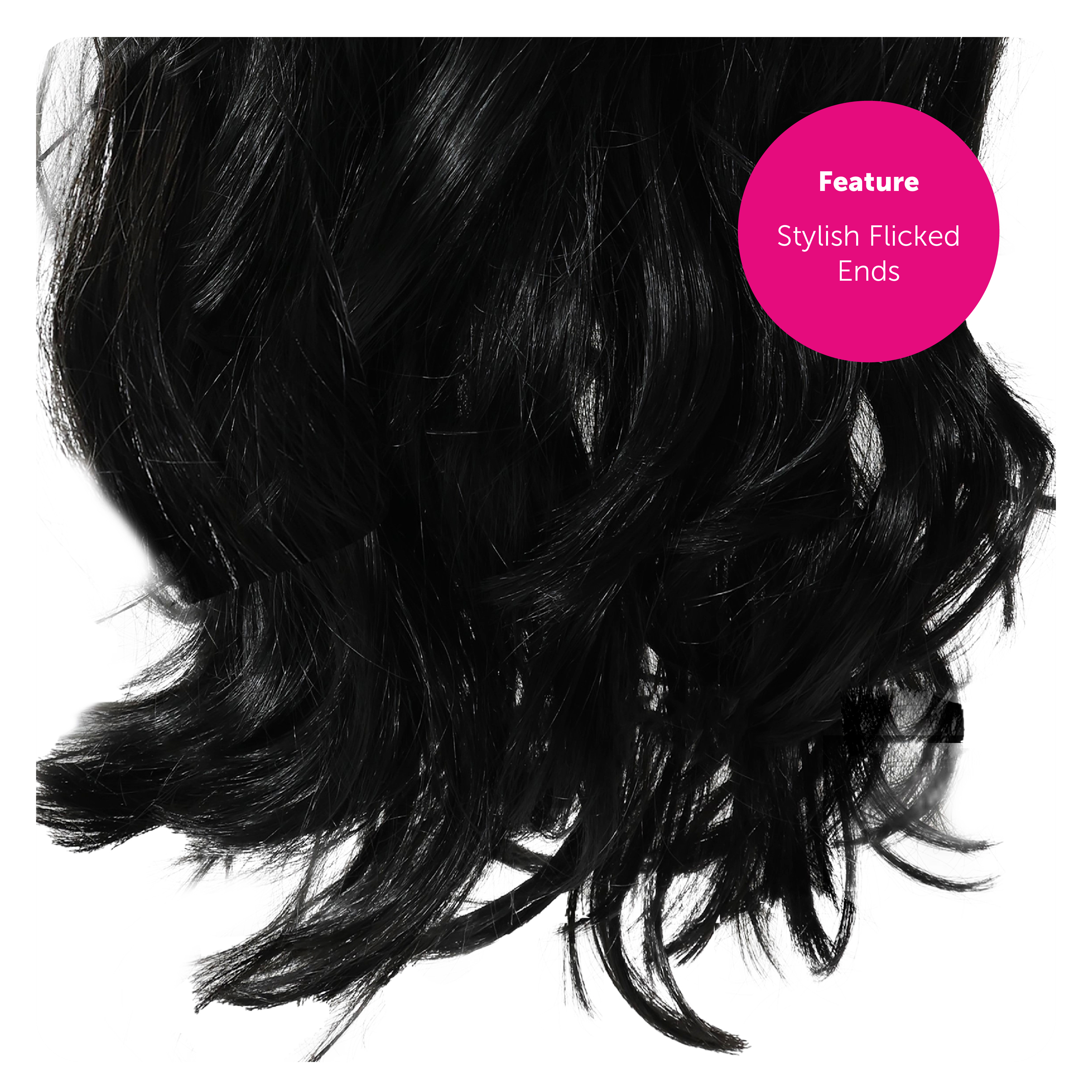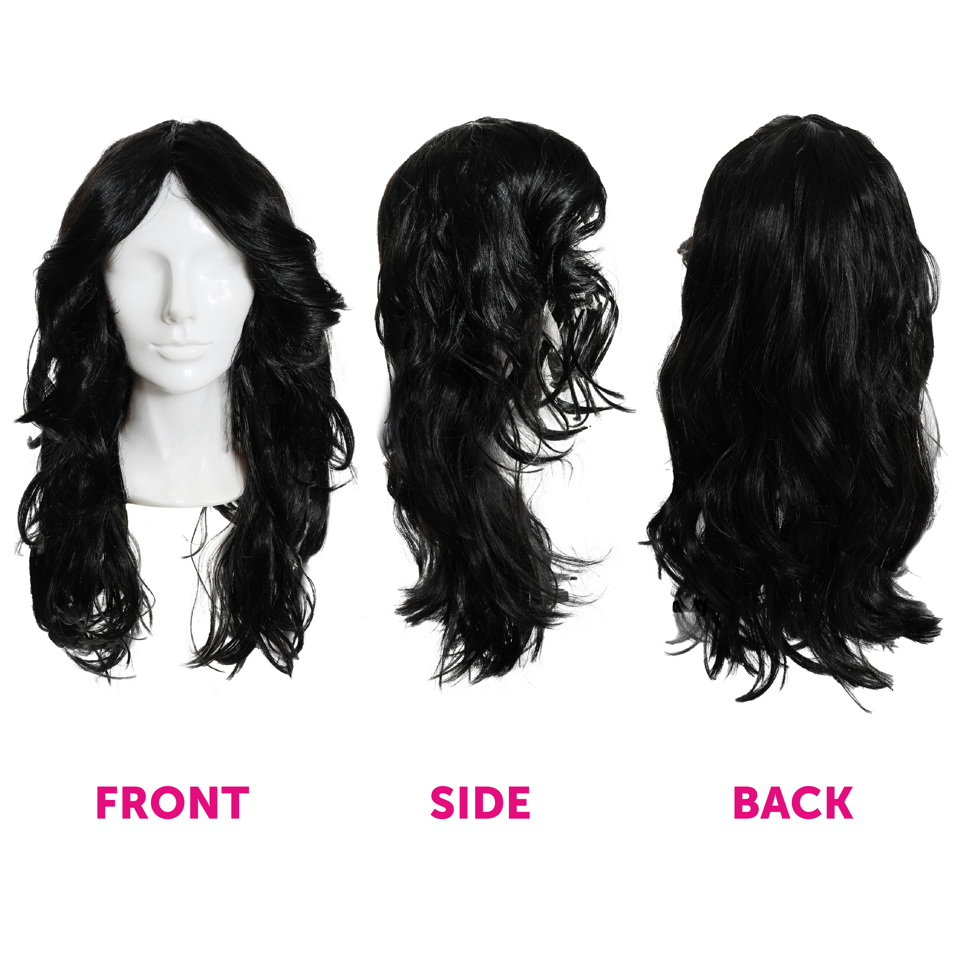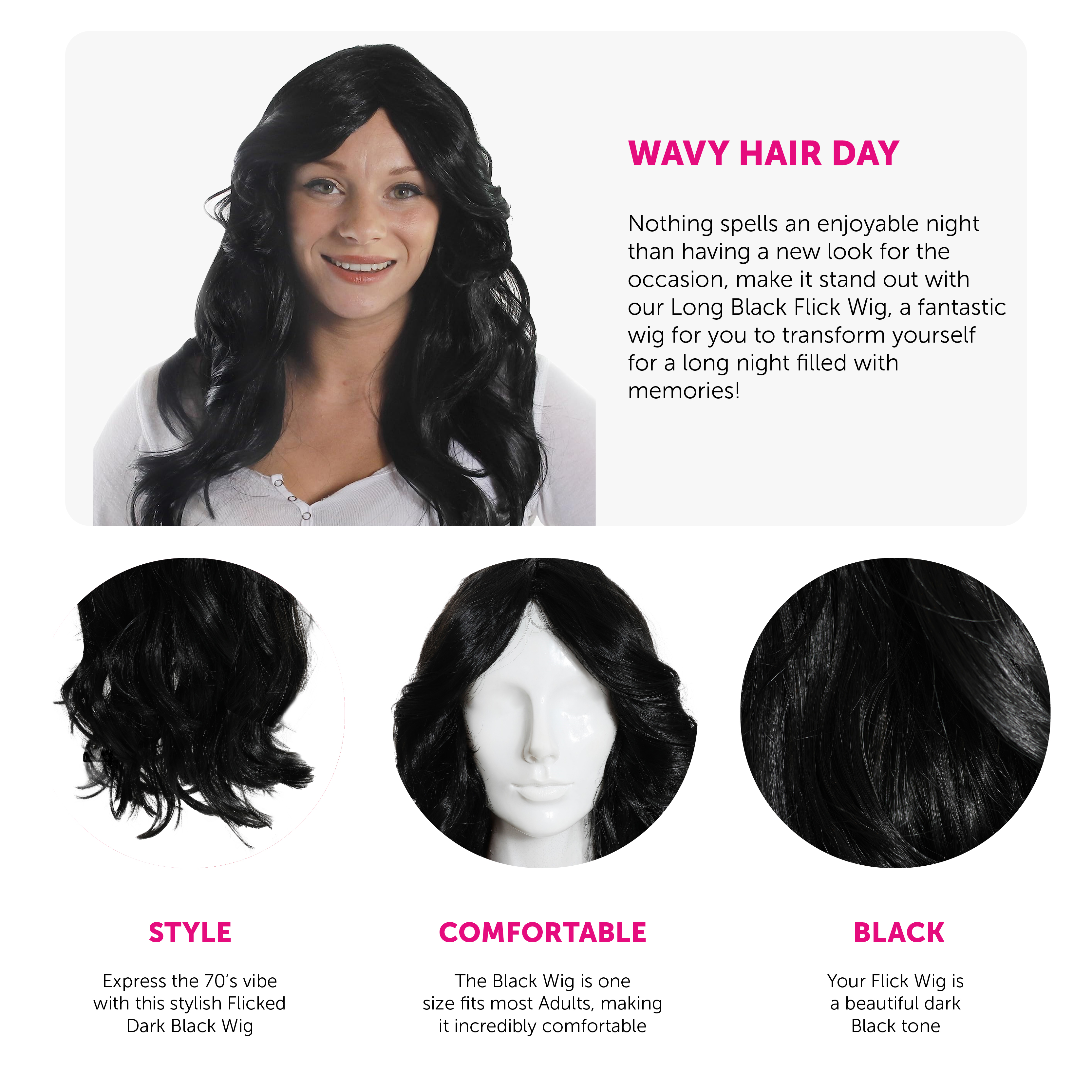 WIG DETAILS: This Adults Flick Wig is a luscious looking, Long Dark Black Wig with flicked out ends and parted down the middle, the perfect Wig for any fancy dress event!