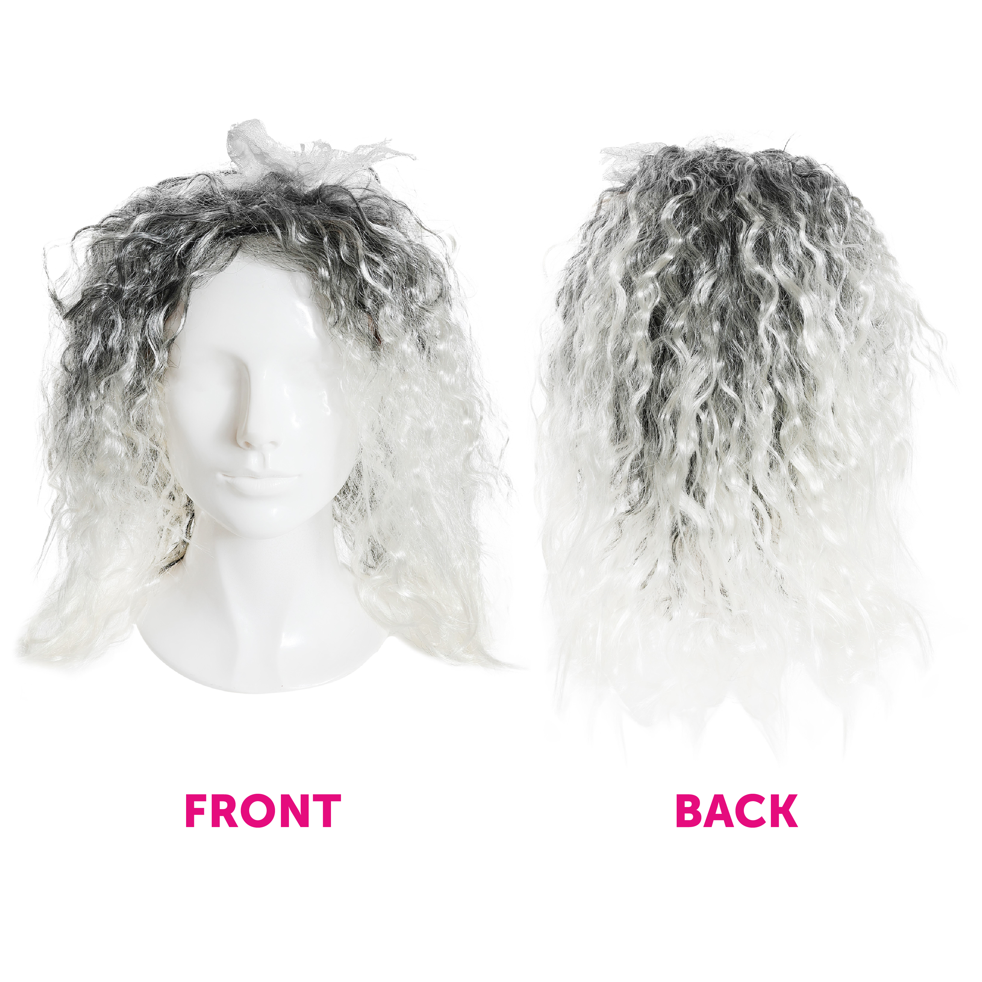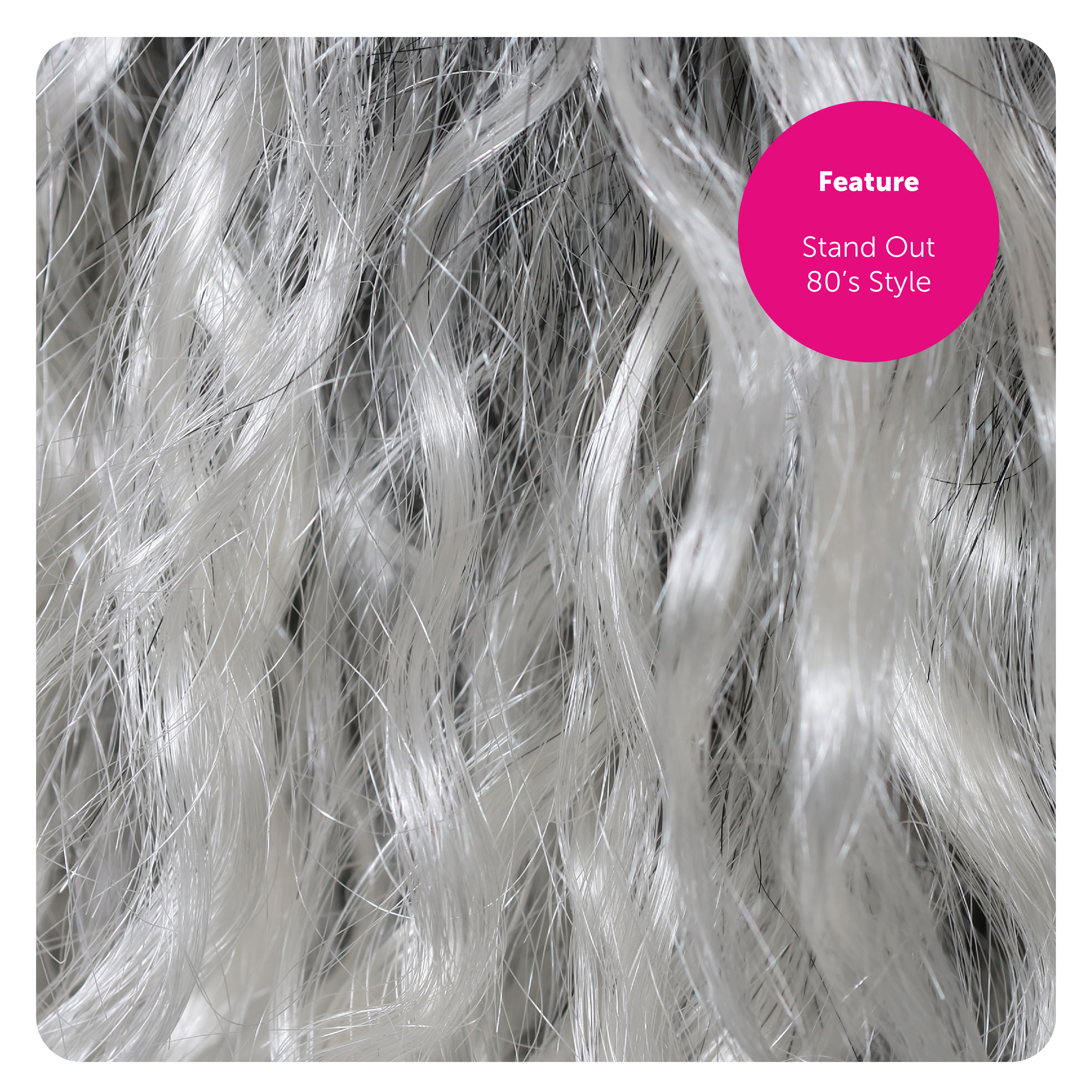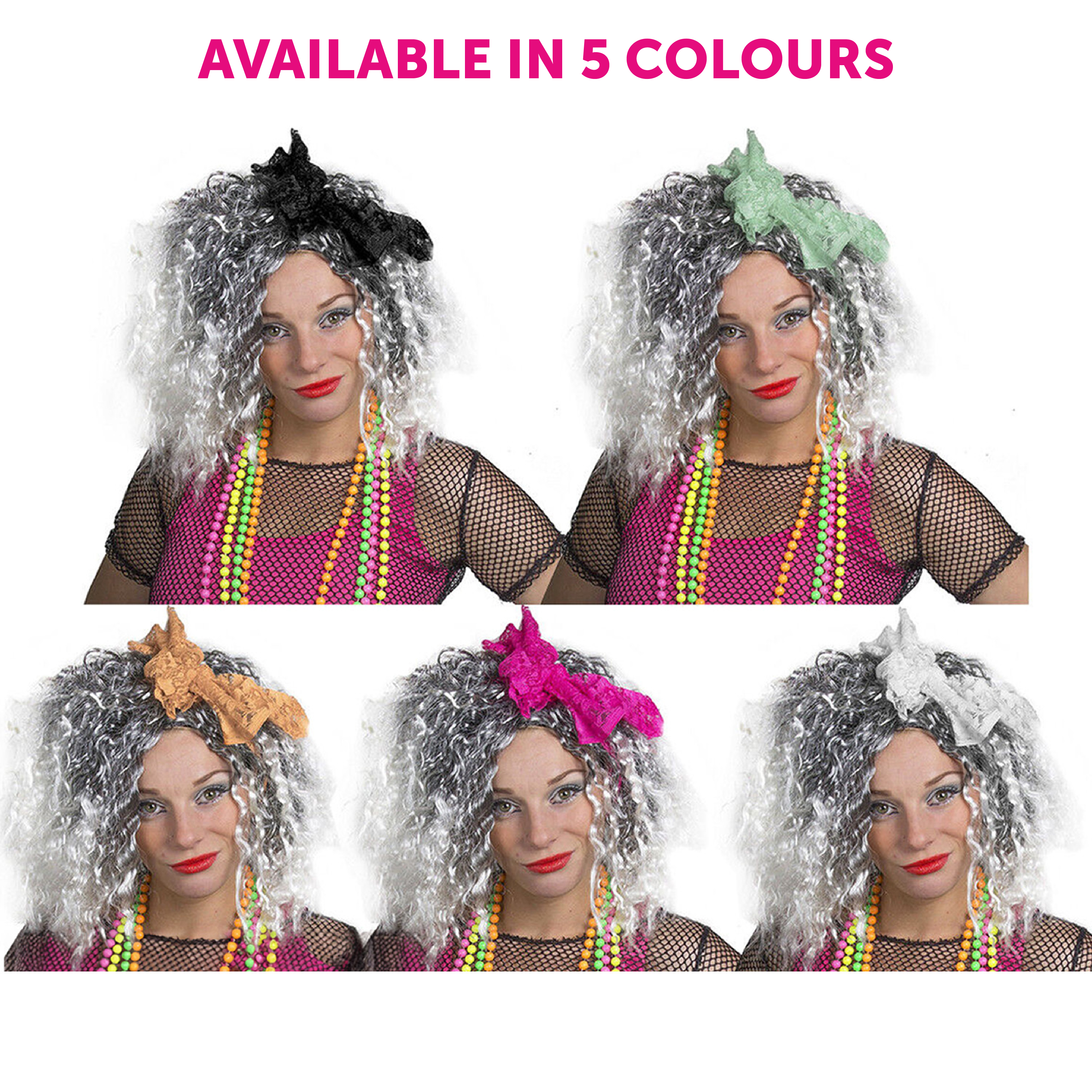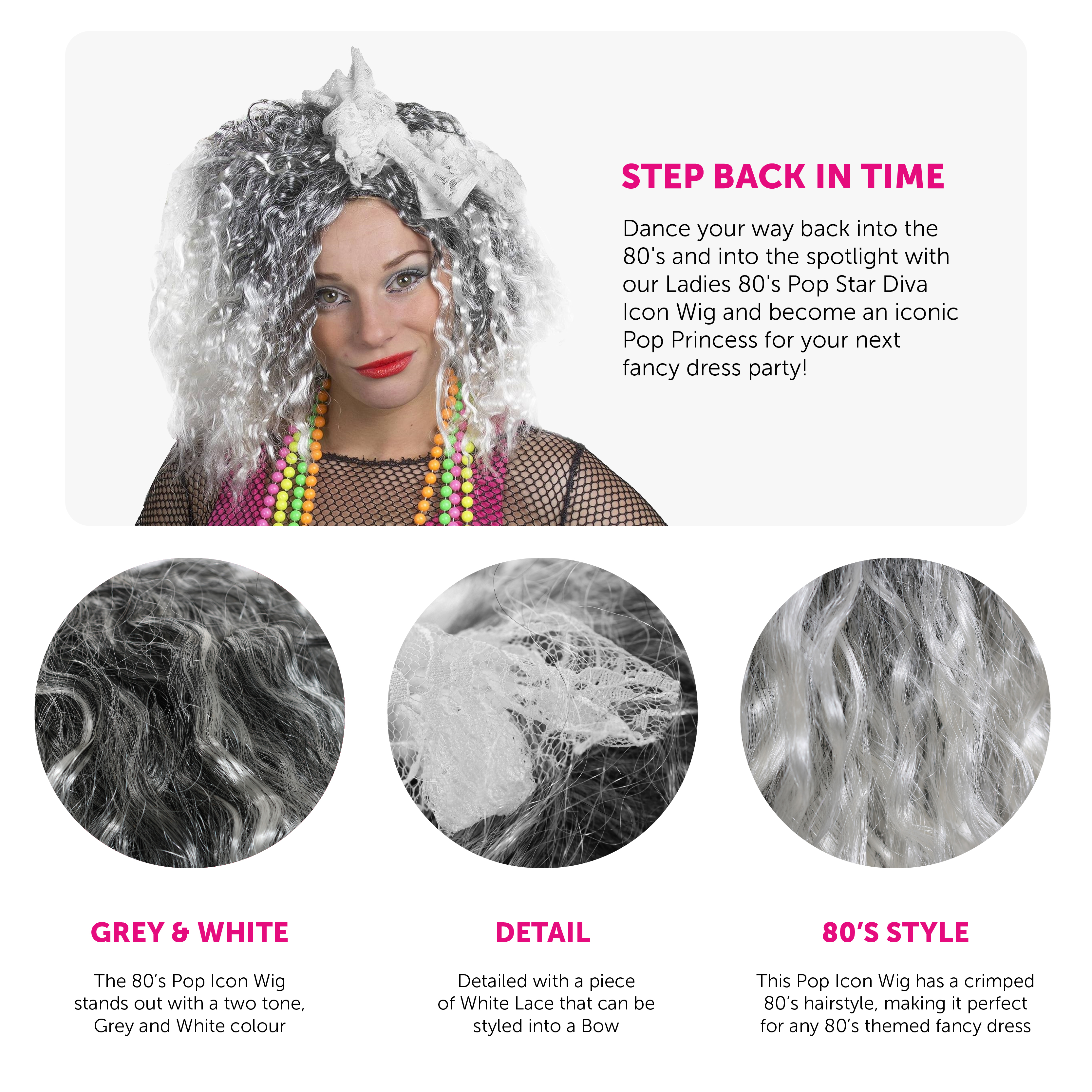 WIG DETAILS: A shoulder length, Grey Afro style crimped Wig with White tips, and a long White Lace accessory to finish off the 80's style, the perfect look for any music themed fancy dress event!