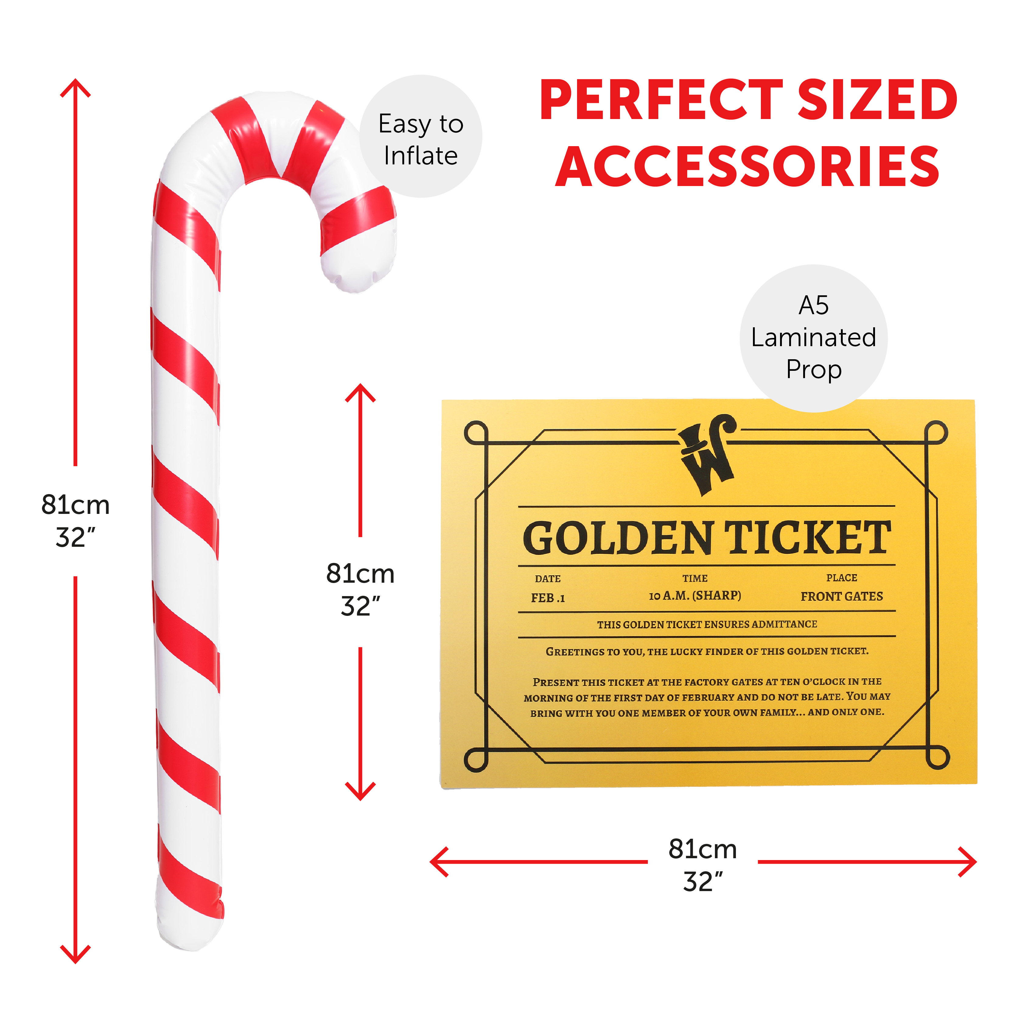 GREAT SIZED PROPS: The Props included in this Costume Set are great sizes; the Golden Ticket is an A5 accessory with measurements of 21cm x 14.5cm (8" x 5.5"), and the Inflatable Candy Cane Stick measures a full length of 81cm (32")