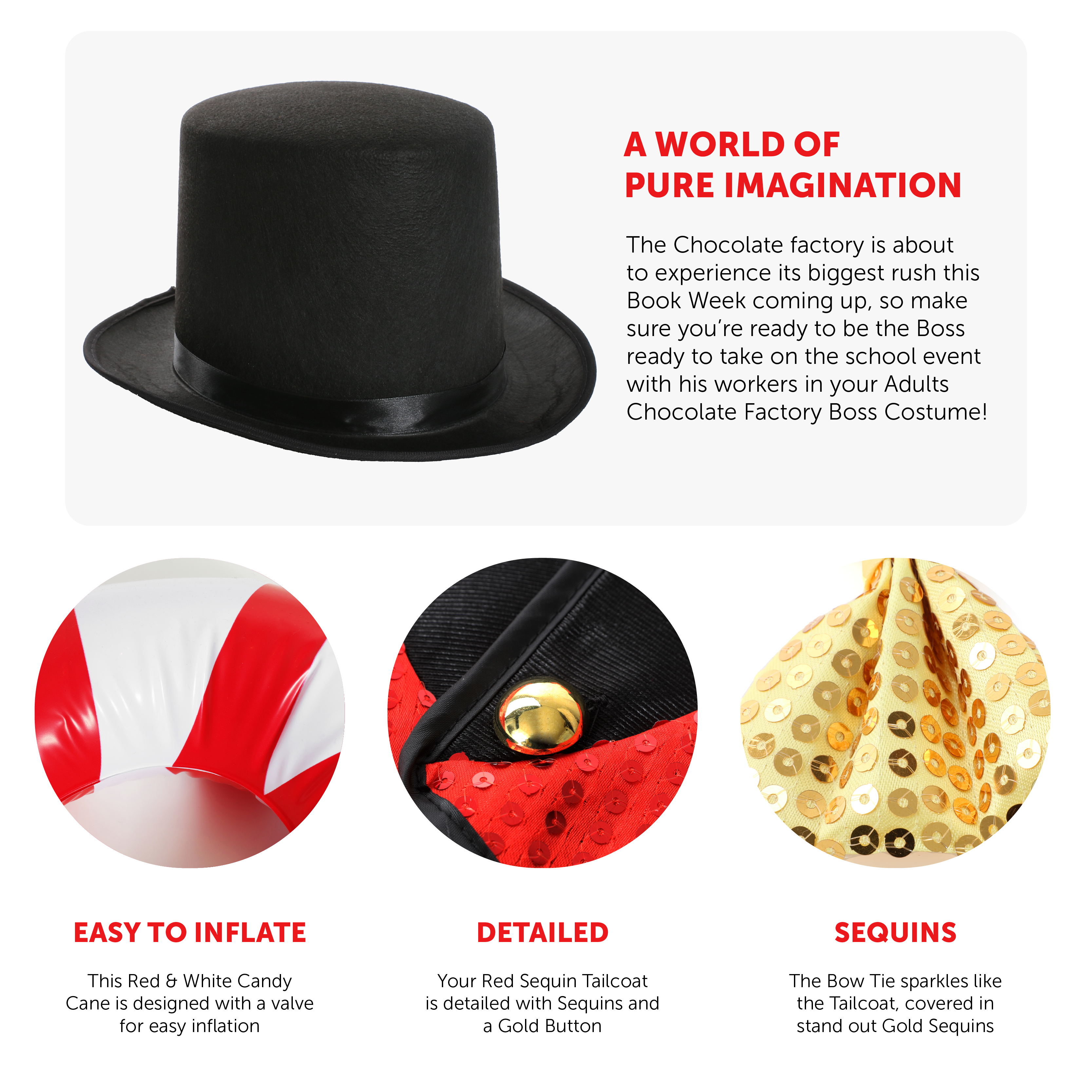 COSTUME INCLUDES: Your Adults Chocolate Factory Boss Costume includes a long Red Sequin Tailcoat with Black edging and a Gold Button, a Gold Sequin covered Bow Tie with an adjustable strap, a Black Top Hat, an Inflatable Candy Cane, and an A5 Laminated Gold Ticket Prop, the perfect look for World Book Day!