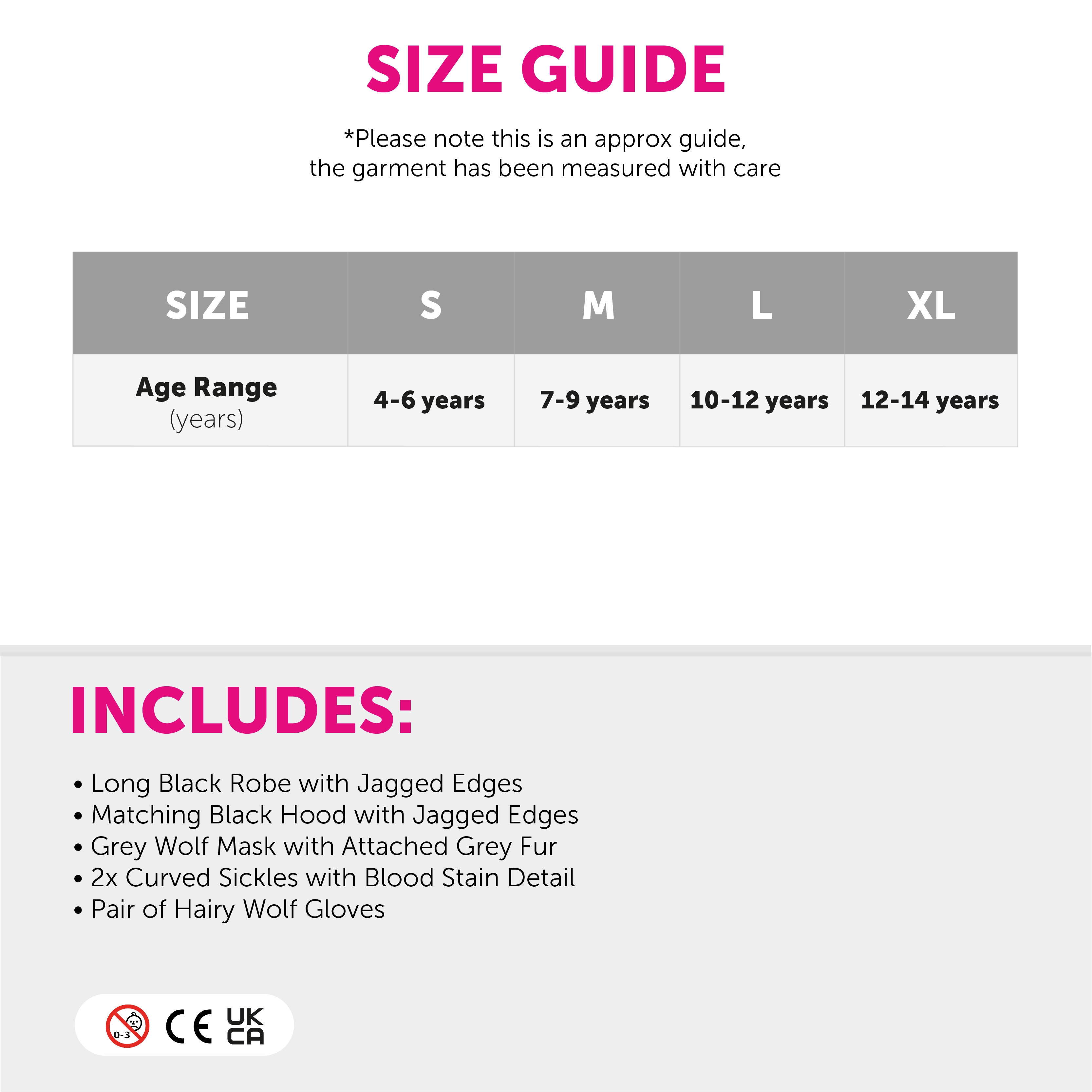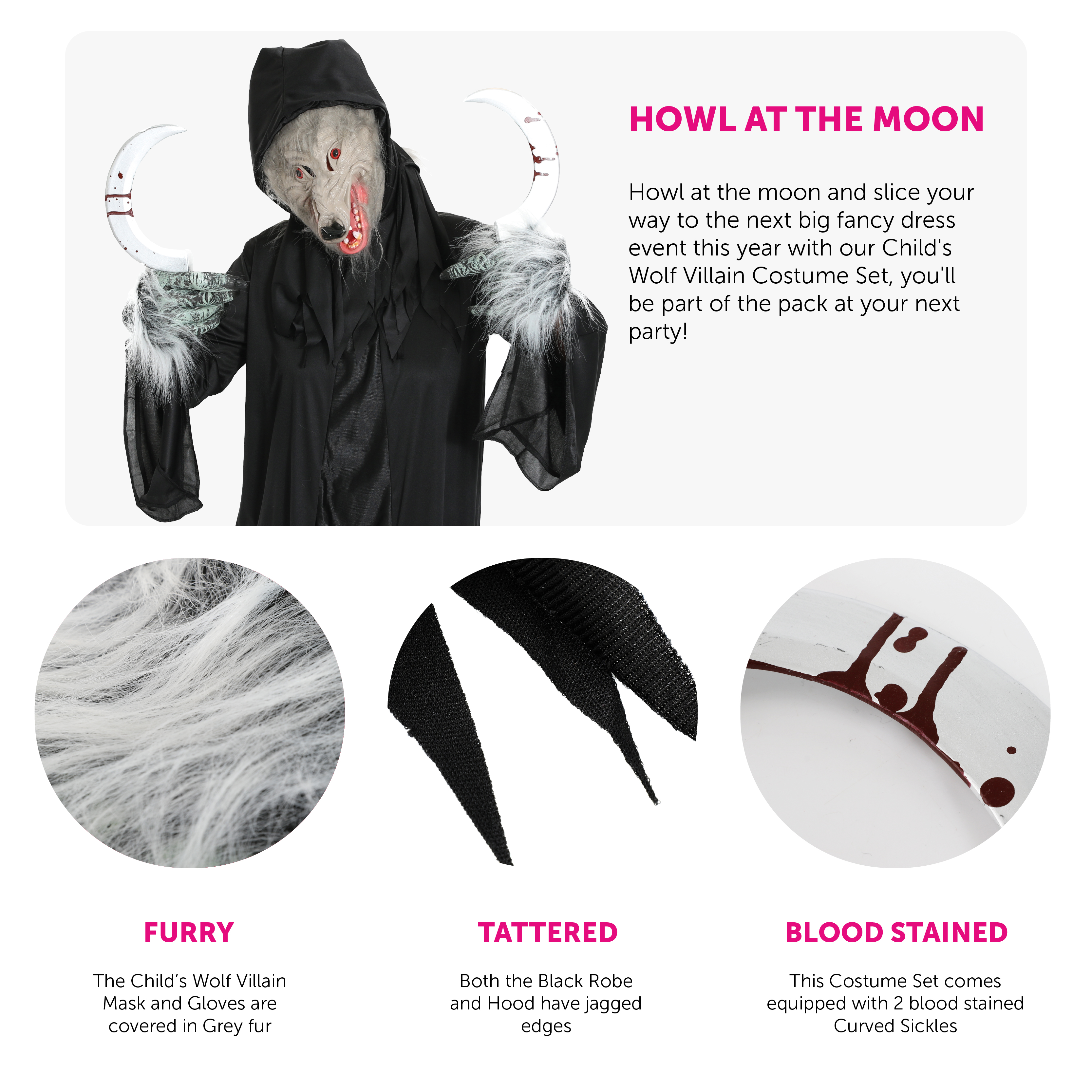 WOLF VILLAIN DETAILS: Your Child's Wolf Villain Costume includes a long Black Robe with jagged edges, a matching Black Hood, a scary Grey Wolf Mask with attached Grey Hair, a pair of Curved Sickles with blood stain detail and a pair of Hairy Wolf Gloves, to finish off your outfit!