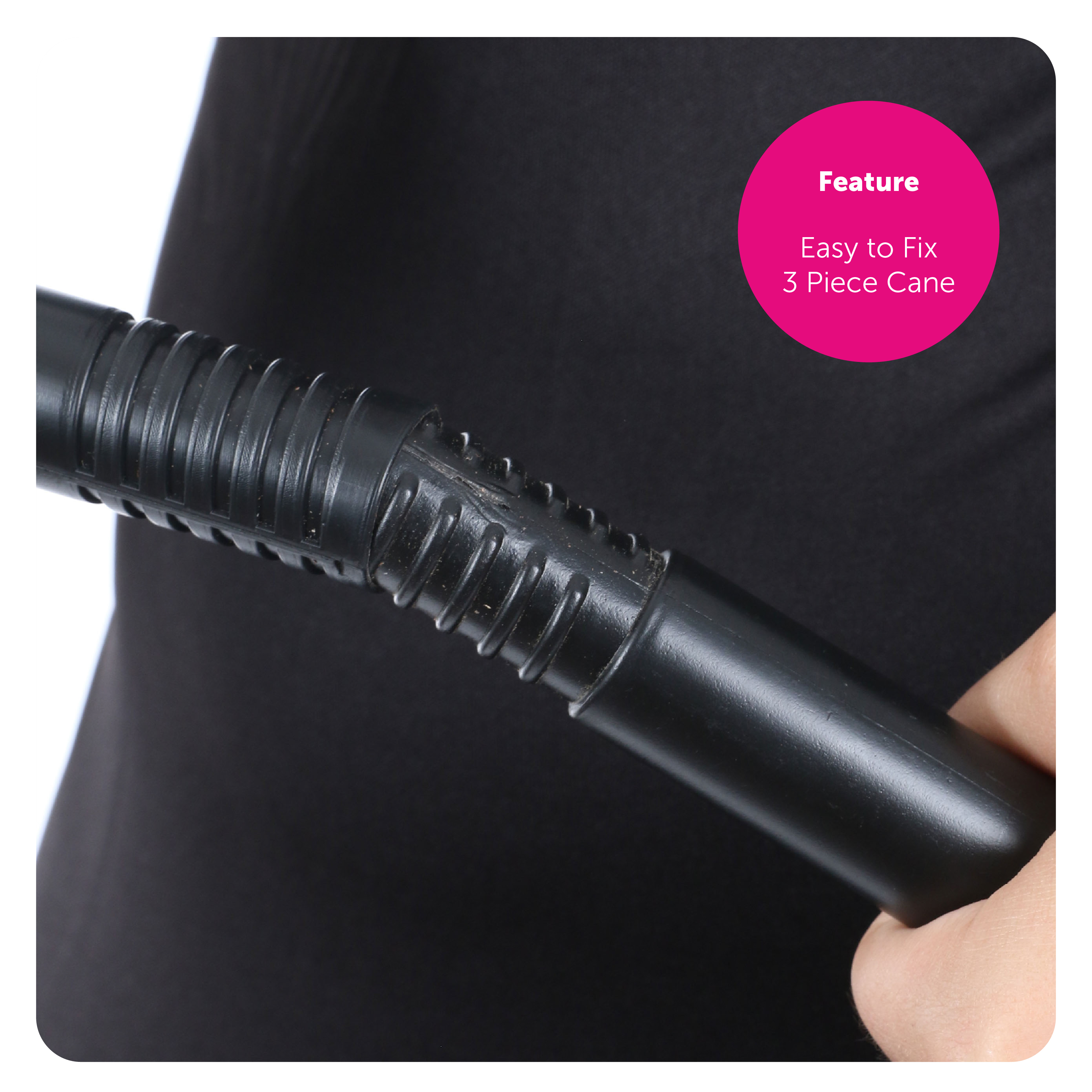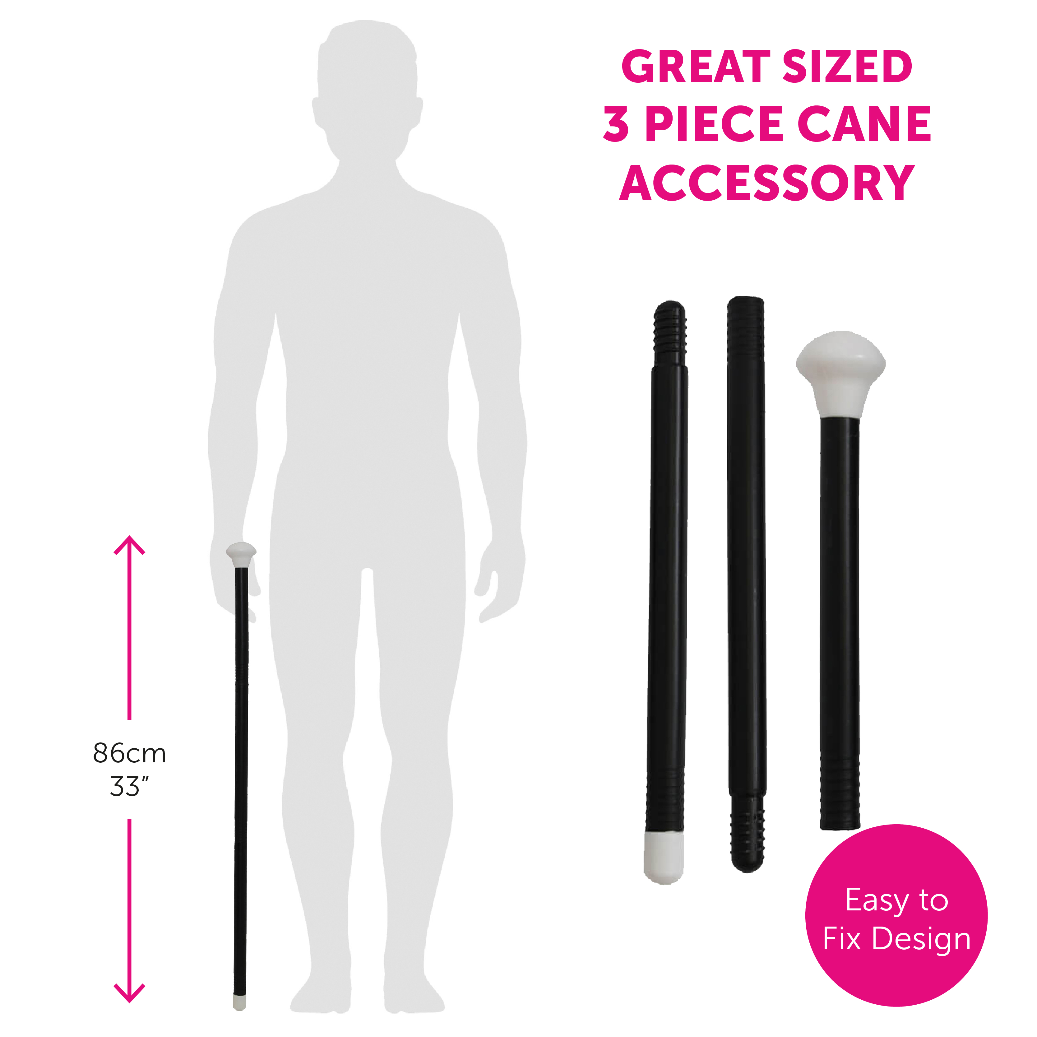 CANE MEASUREMENTS: The Black Dancing Cane is a 3 piece accessory that screws together easily, and once fixed together measures a complete length of 86cm (33")