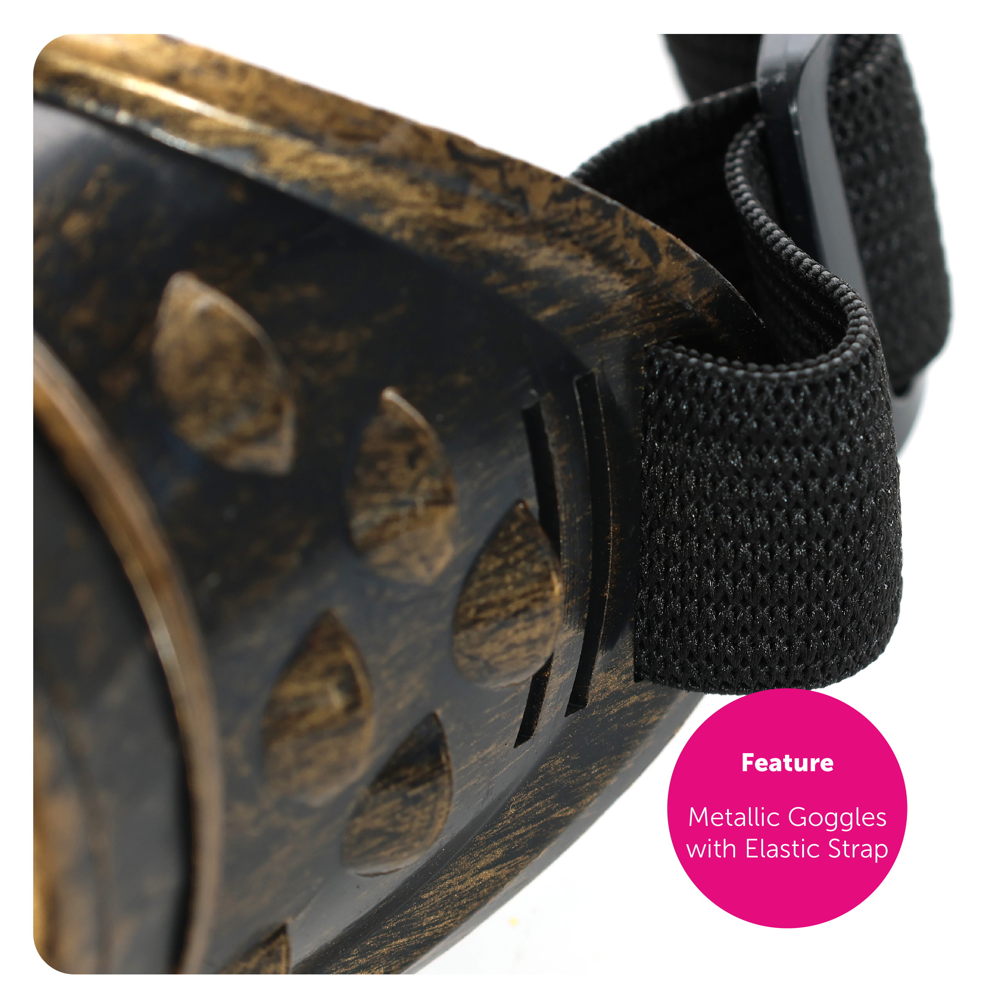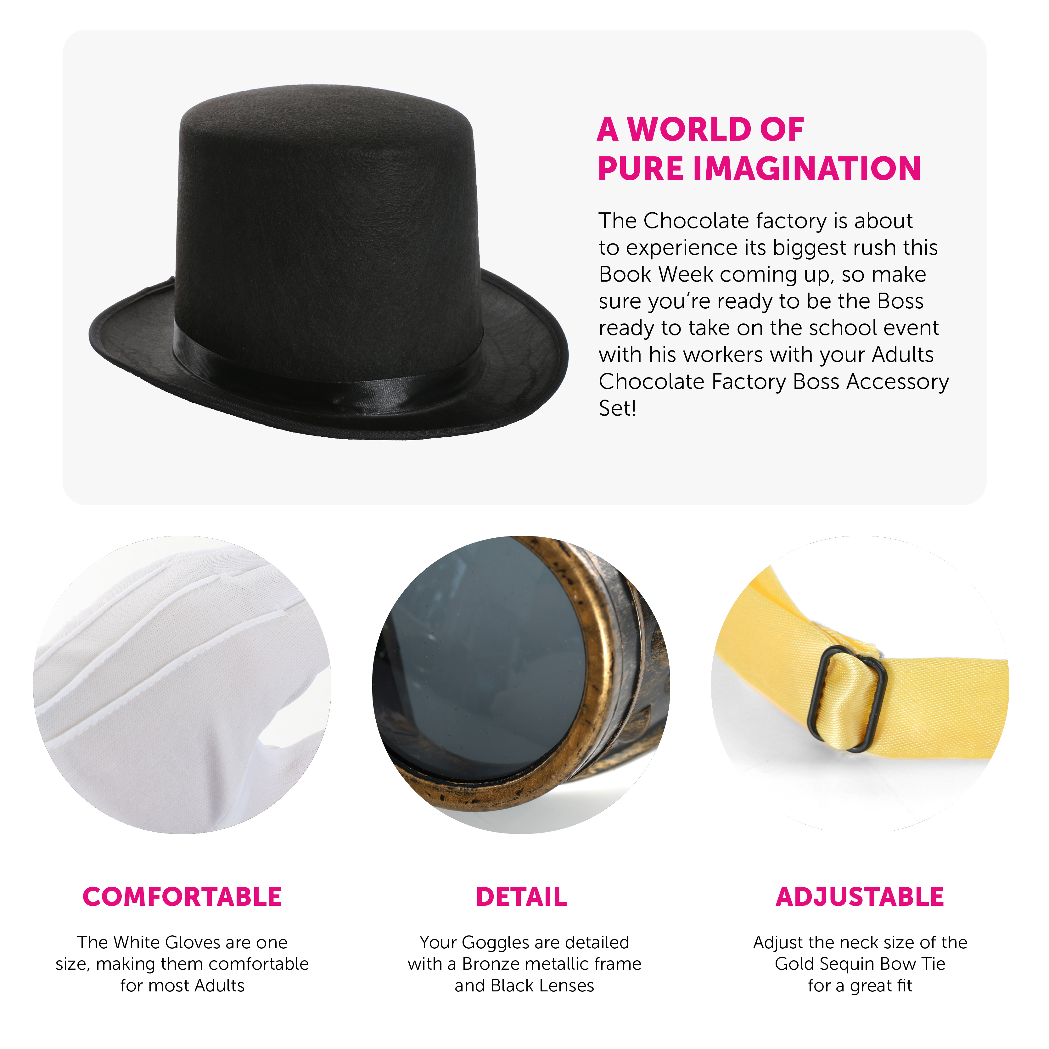 SET INCLUDES: Your Adults Chocolate Factory Boss Accessory Set includes a Black Top Hat, Brown Metallic Goggles with Black Lenses and a comfortable elastic strap, a Gold Sequin covered Bow Tie, a pair of White Gloves, and a 3 Piece Cane with a White Topper, the perfect look for World Book Day!