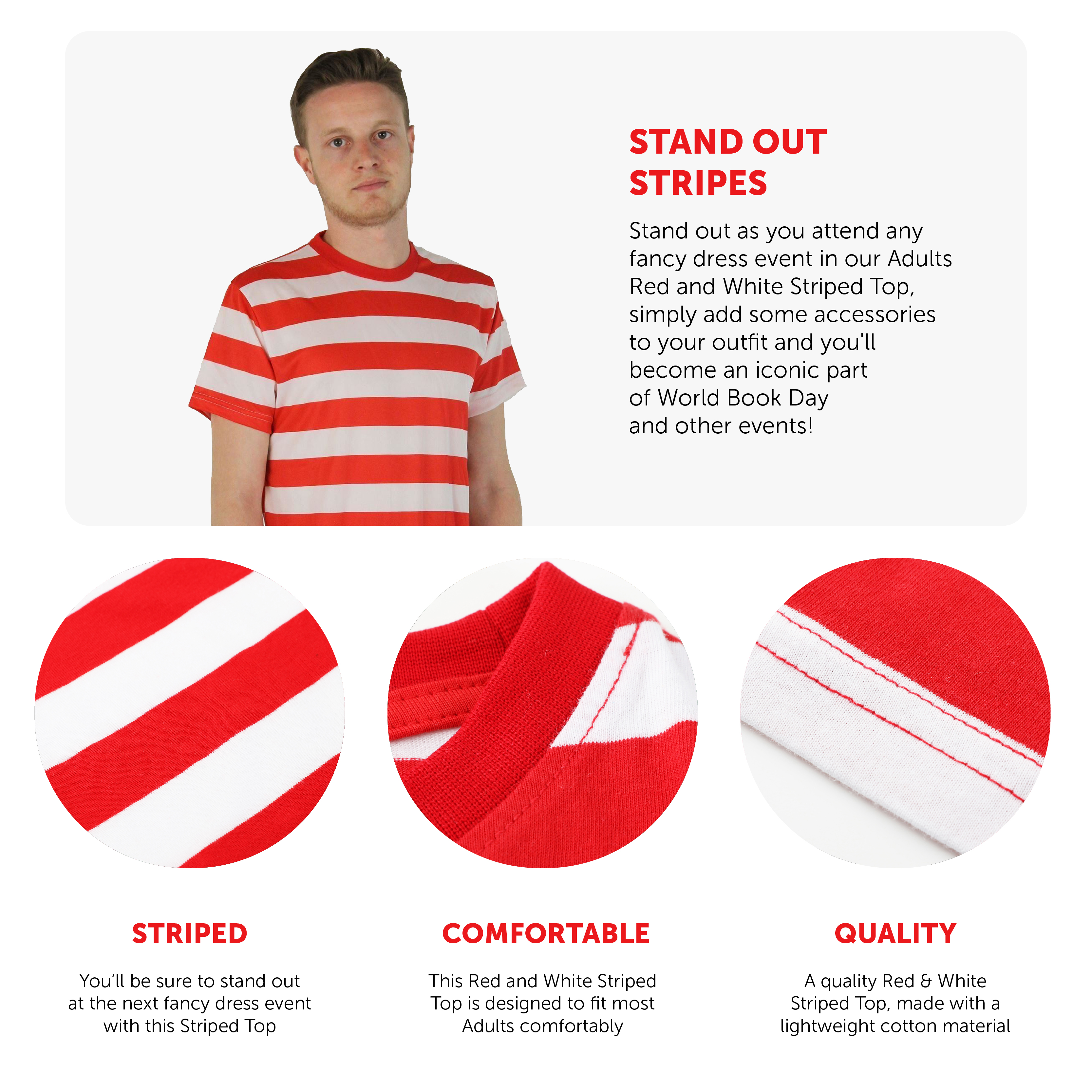 PERFECT FOR WORLD BOOK DAY & OTHER FANCY DRESS: If you’re attending World Book Day and want to attend as your favourite iconic book character, or for any other fancy dress costume, look no further than our Adults Red and White Striped Cotton T Shirt to kickstart your Book Week events!