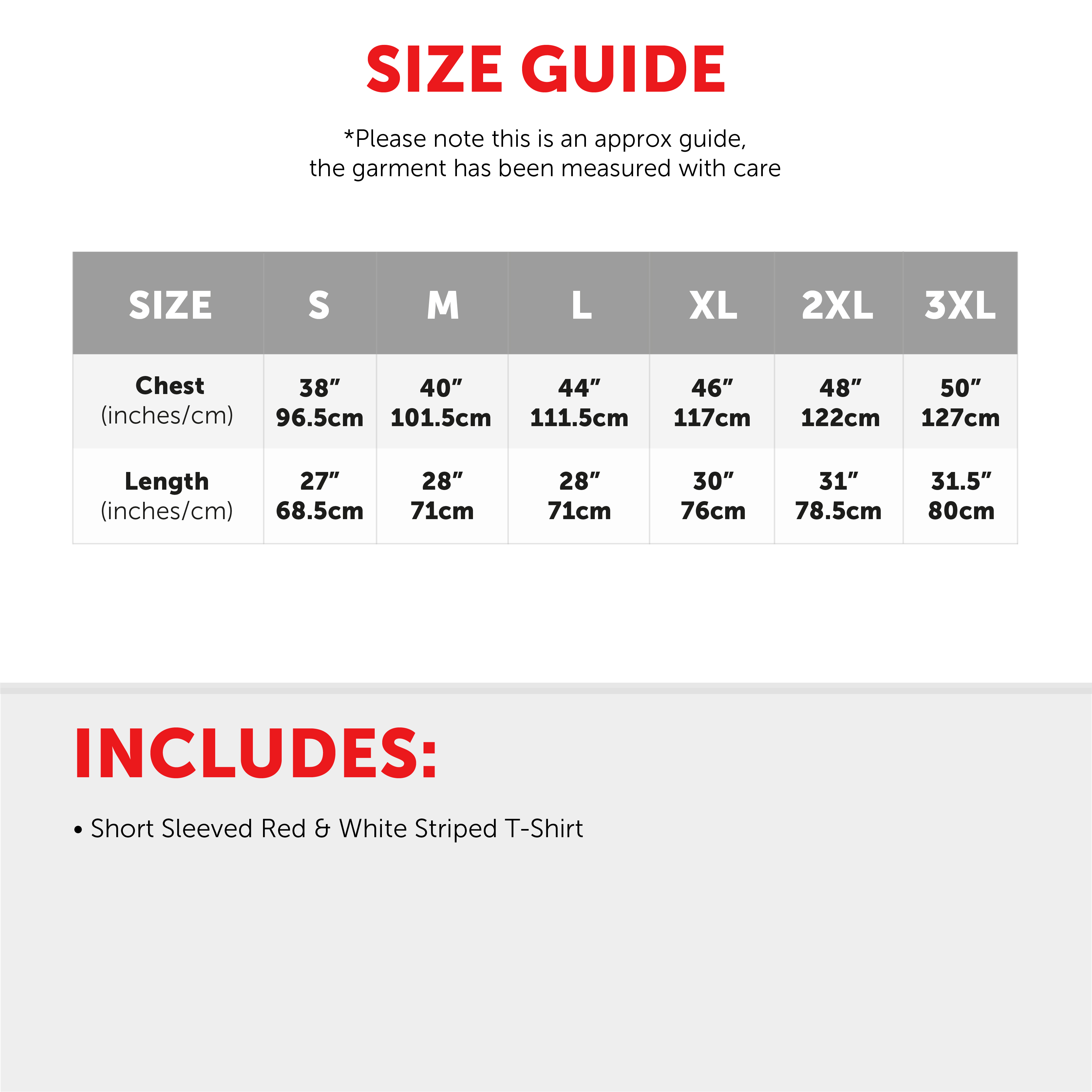 T SHIRT DETAILS: A bold Red and White Striped pattern T Shirt made with 100% cotton, this Adults T Shirt is the perfect finishing touch to many different fancy dress costume ideas!
