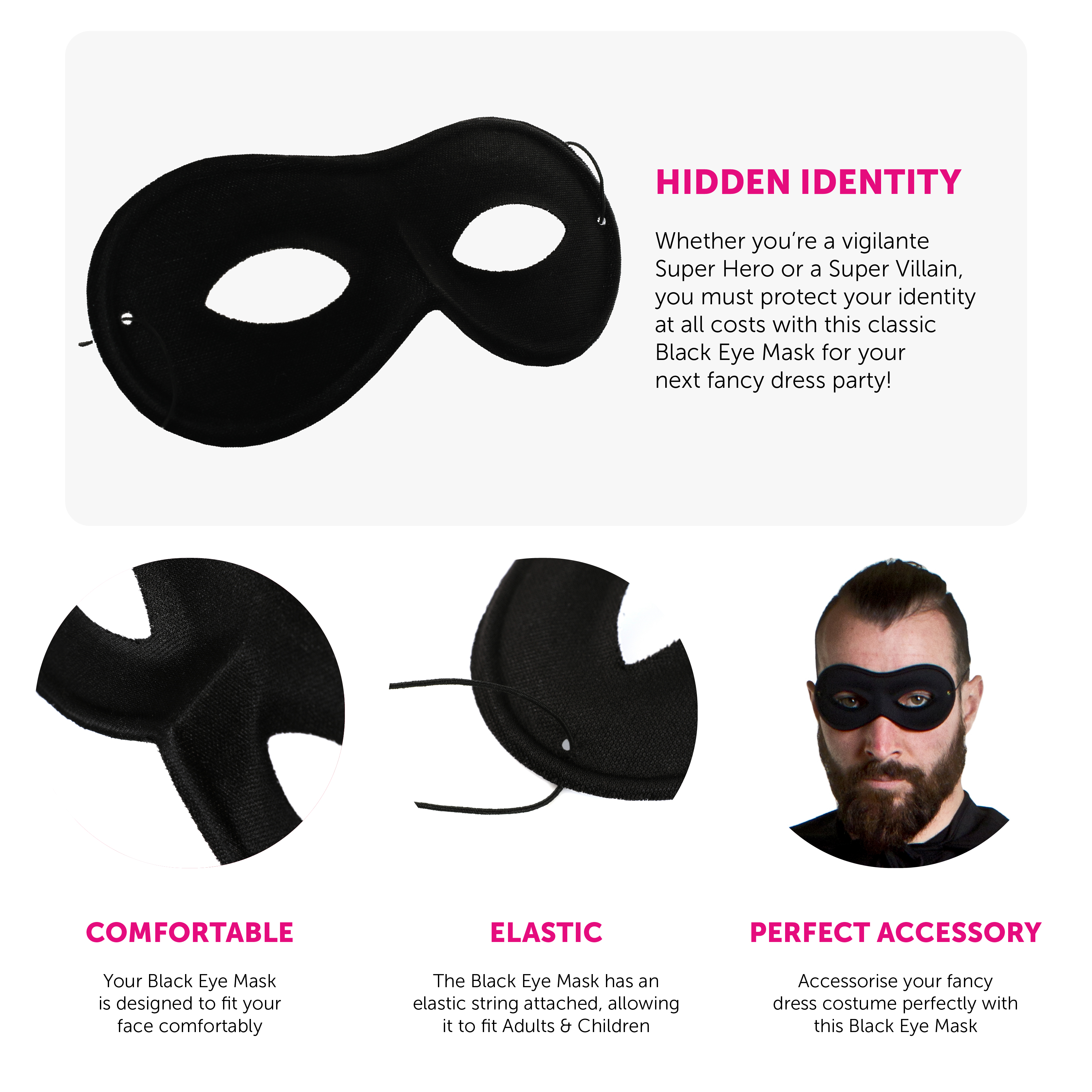 BLACK EYE MASK: Whether you’re a vigilante Super Hero or a Super Villain, you must protect your identity at all costs with this classic Black Eye Mask for your next fancy dress party!