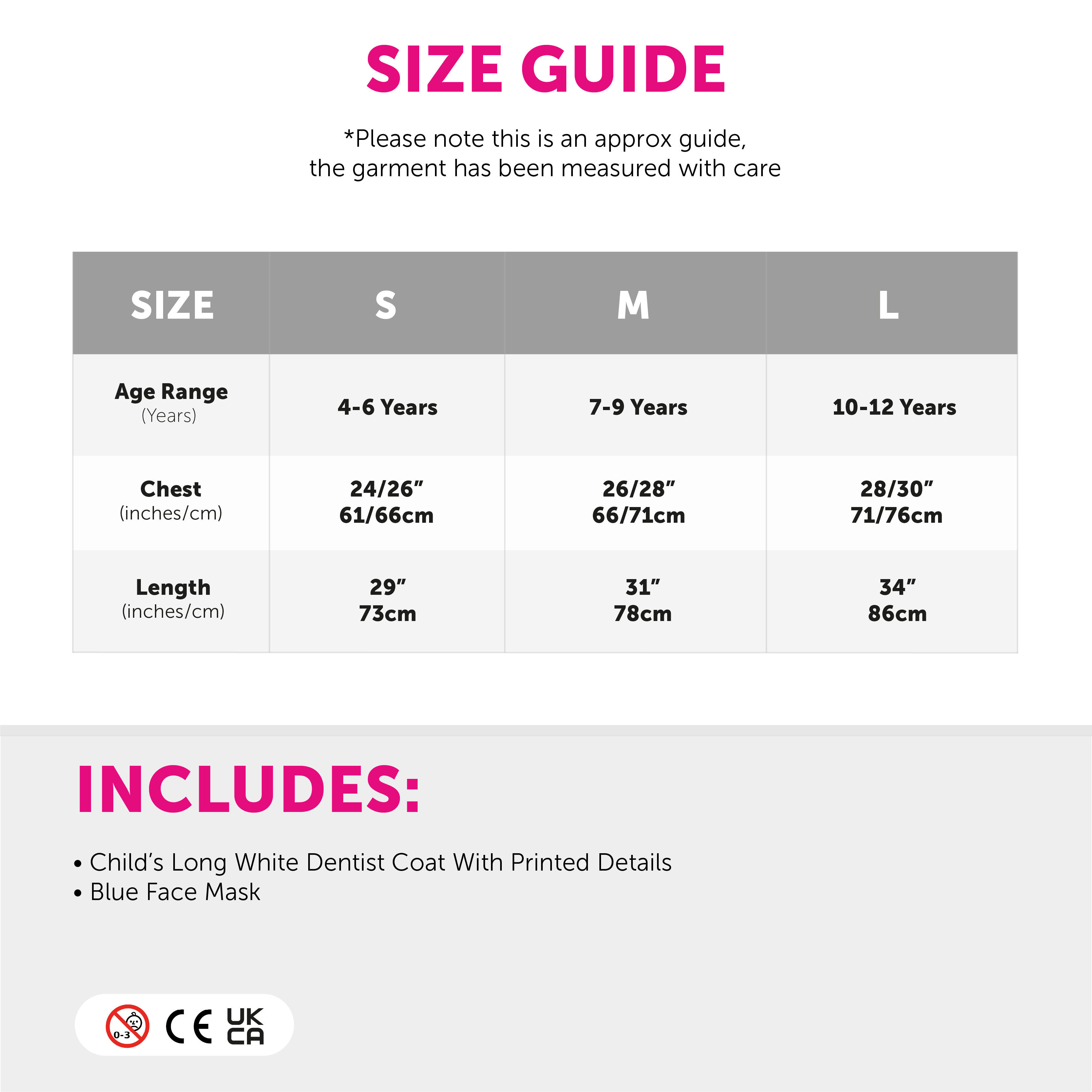 AVAILABLE IN MULTIPLE SIZES: This Scary Dentist Costume is available in multiple sizes from Small –Large: Small - 4-6 Years: Chest: 24-26"/61-66cm, Length: 29"/73cm | Medium, 7-9 Years: Chest: 26-28"/66-71cm, Length: 31"/78cm | Large - 10-12 Years: Chest: 28-30"/71-76cm, Length: 34"/86cm