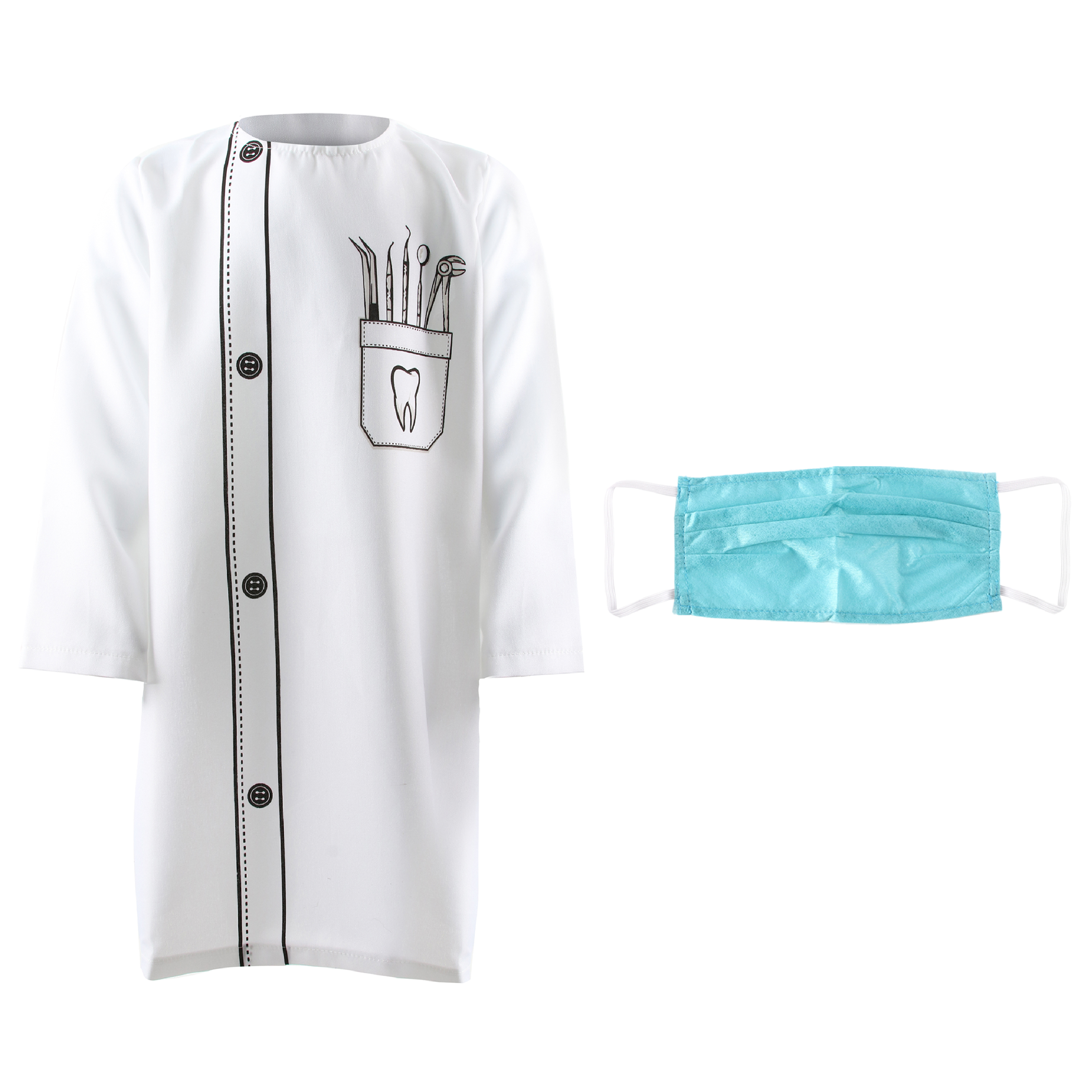 COSTUME INCLUDES: Our Scary Dentist Costume includes a Childs White Lab Coat with buttons & pockets, and a Blue Facemask to all create the perfect Scary Dentist Costume set!