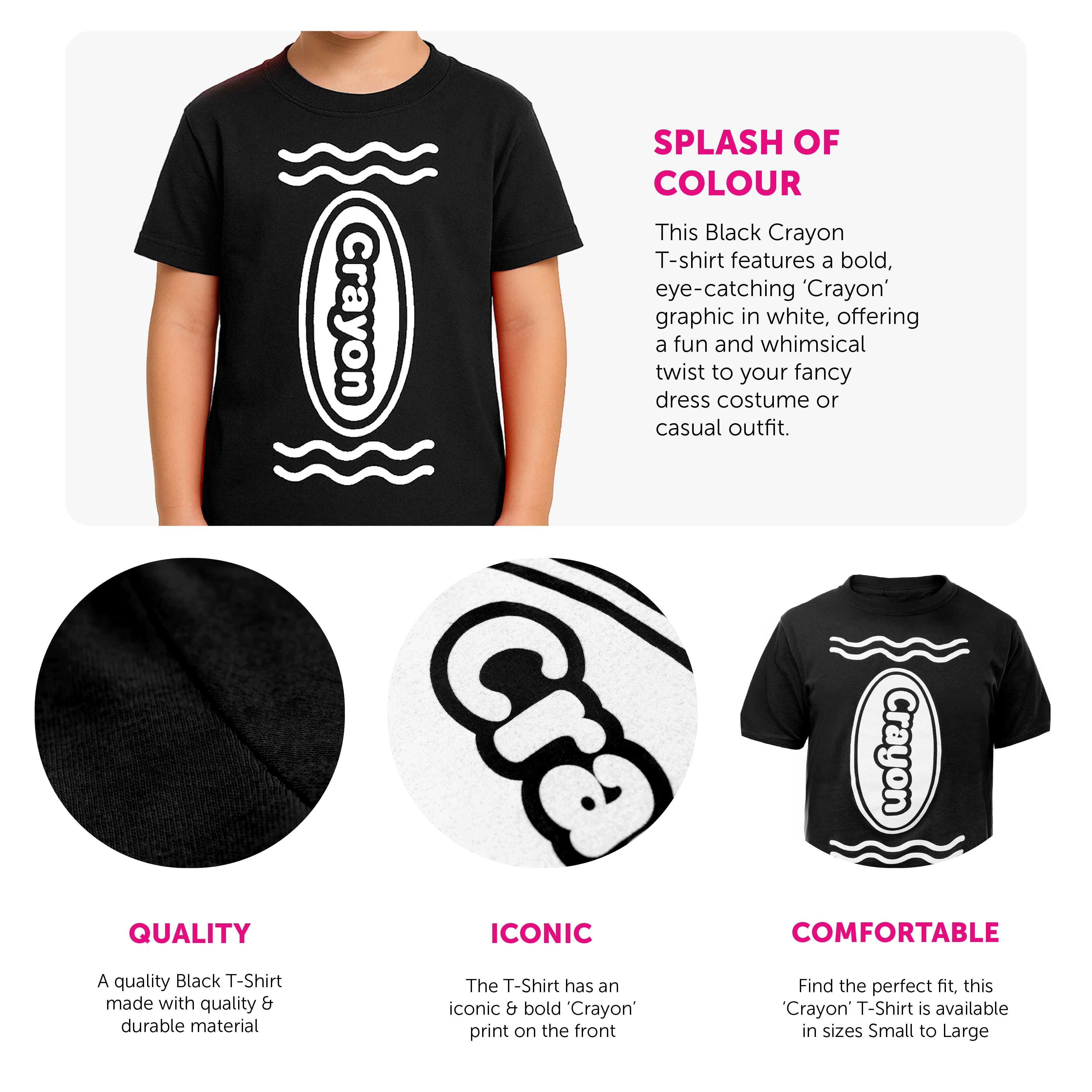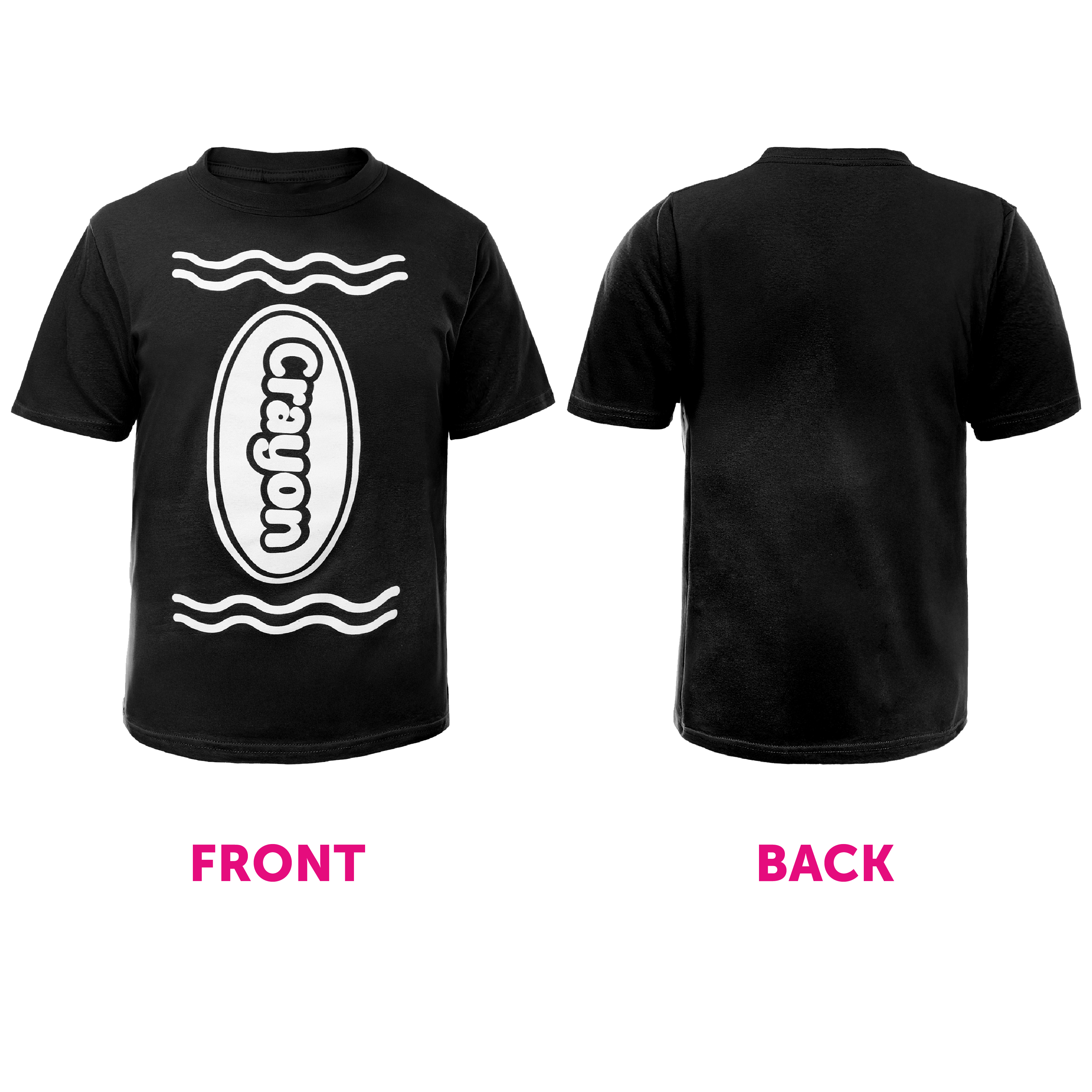 FUN AND CREATIVE DESIGN: This black crayon T-shirt features a bold, eye-catching "Crayon" graphic in white, offering a fun and whimsical twist to your fancy dress costume or casual outfit.