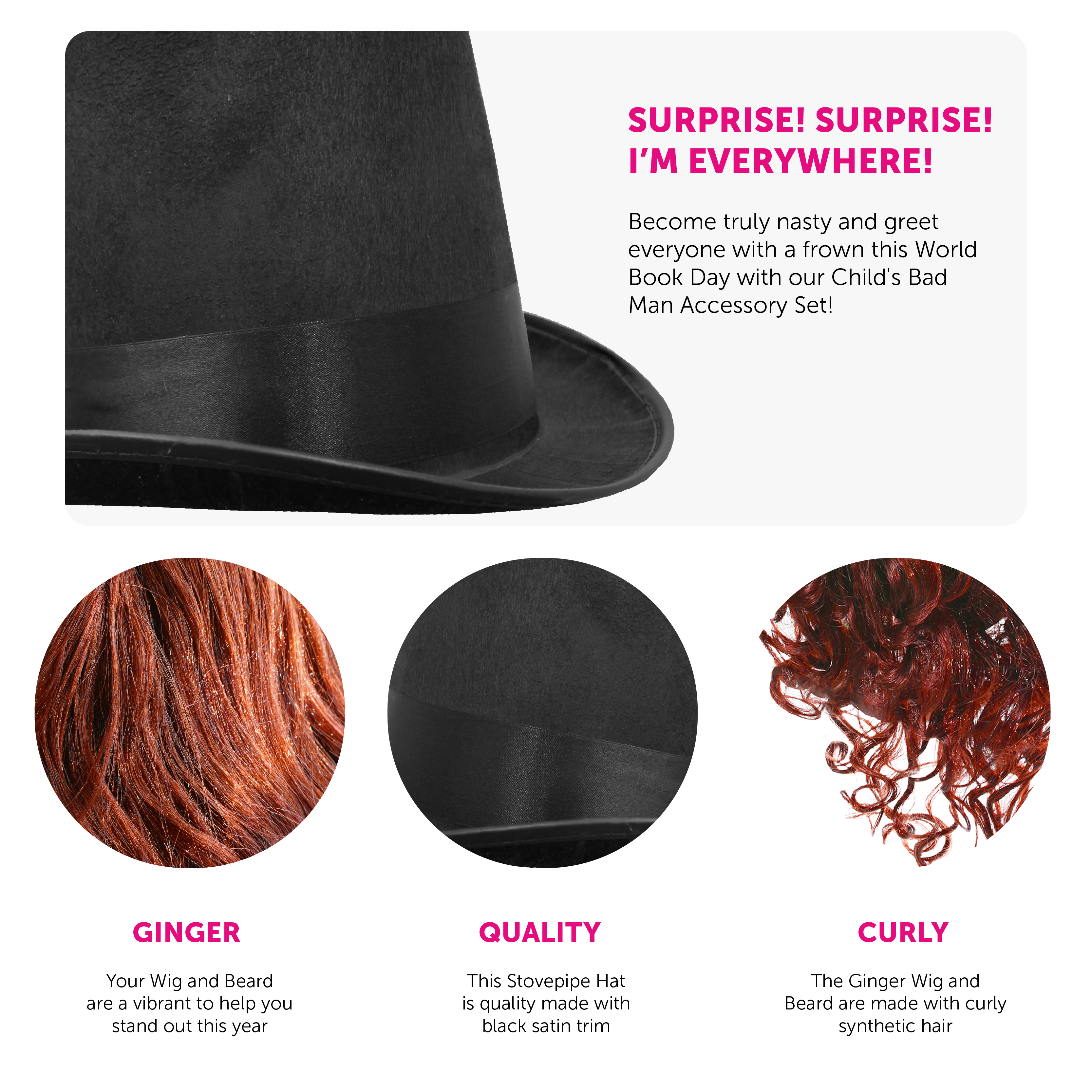 QUALITY ACCESSORY SET: The Ginger Wig and Beard, and Top Hat are quality made and easy to wear, making this Child's Bad Man Accessory Set a great addition to your outfit!