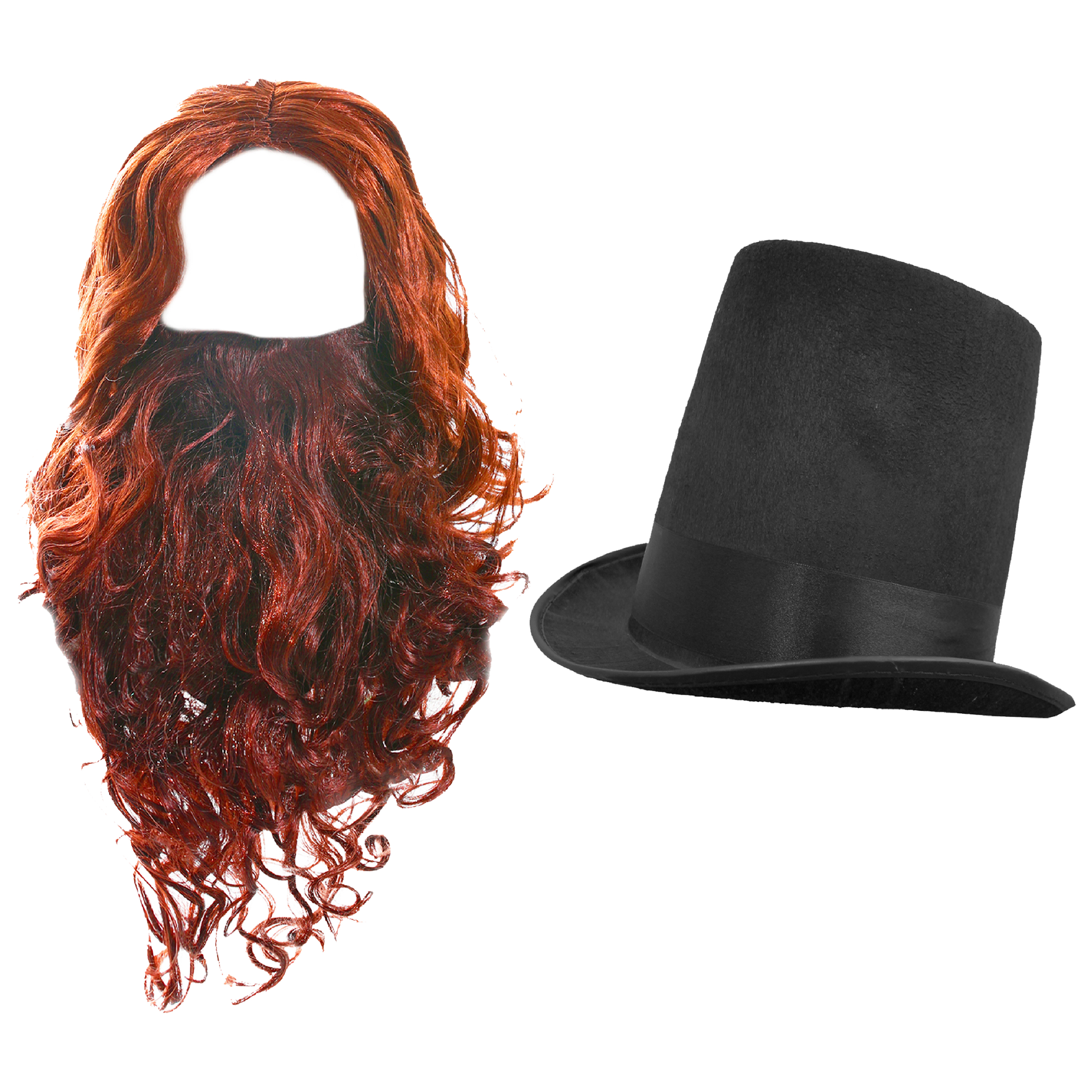 ACCESSORY SET DETAILS: Your Child's Bad Man Accessory Set includes a long, curly Ginger Wig and Beard and a tall, black Stovepipe Top Hat with a Black Satin Trim to complete your look!