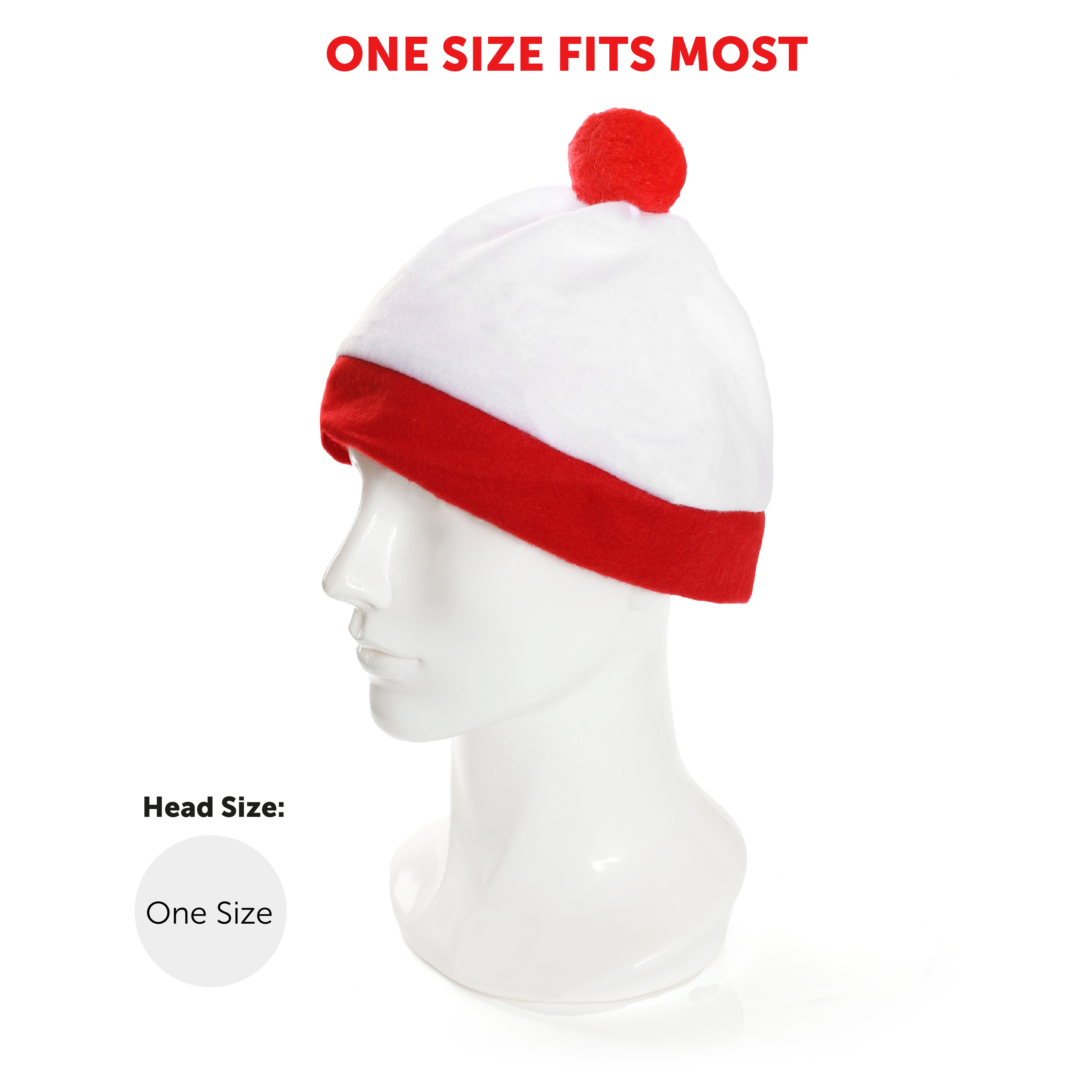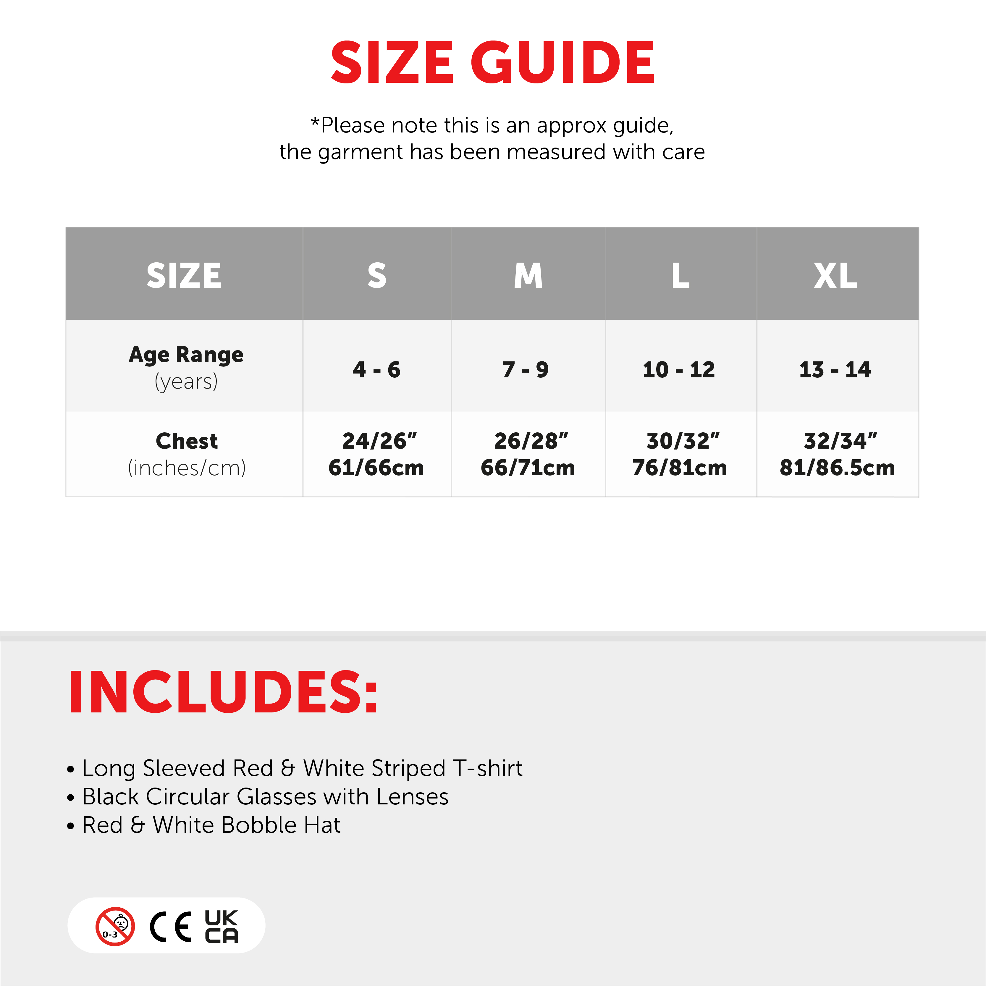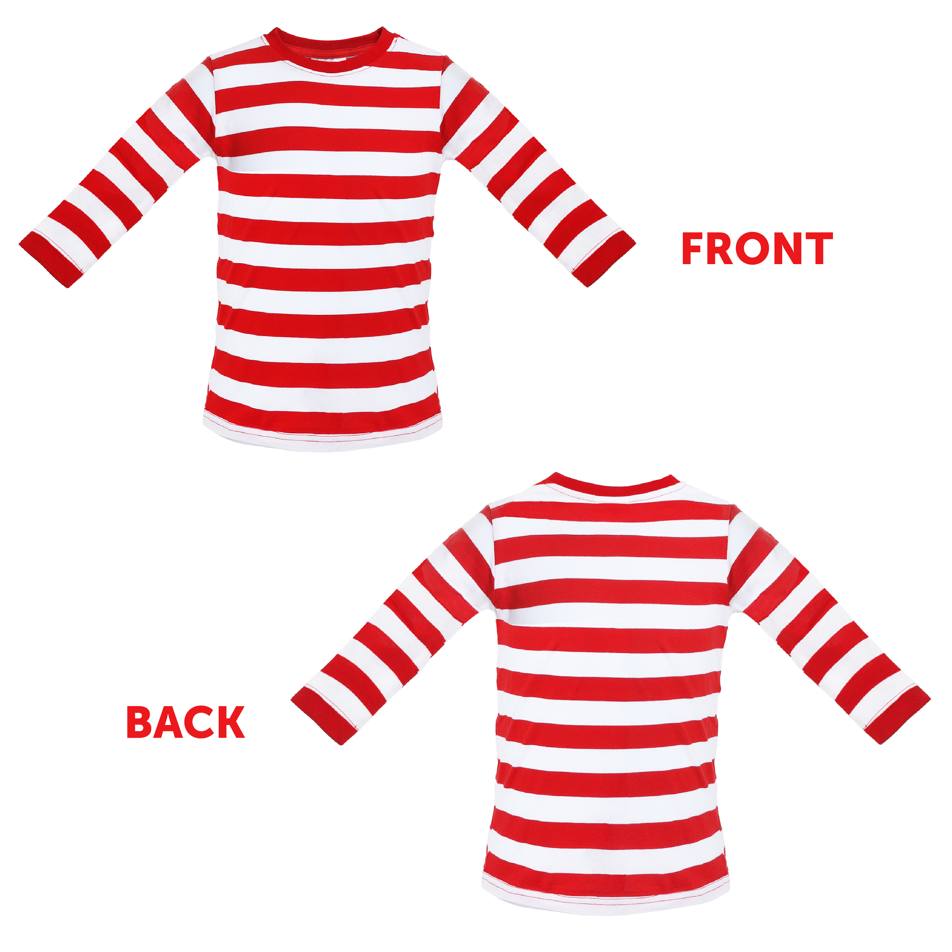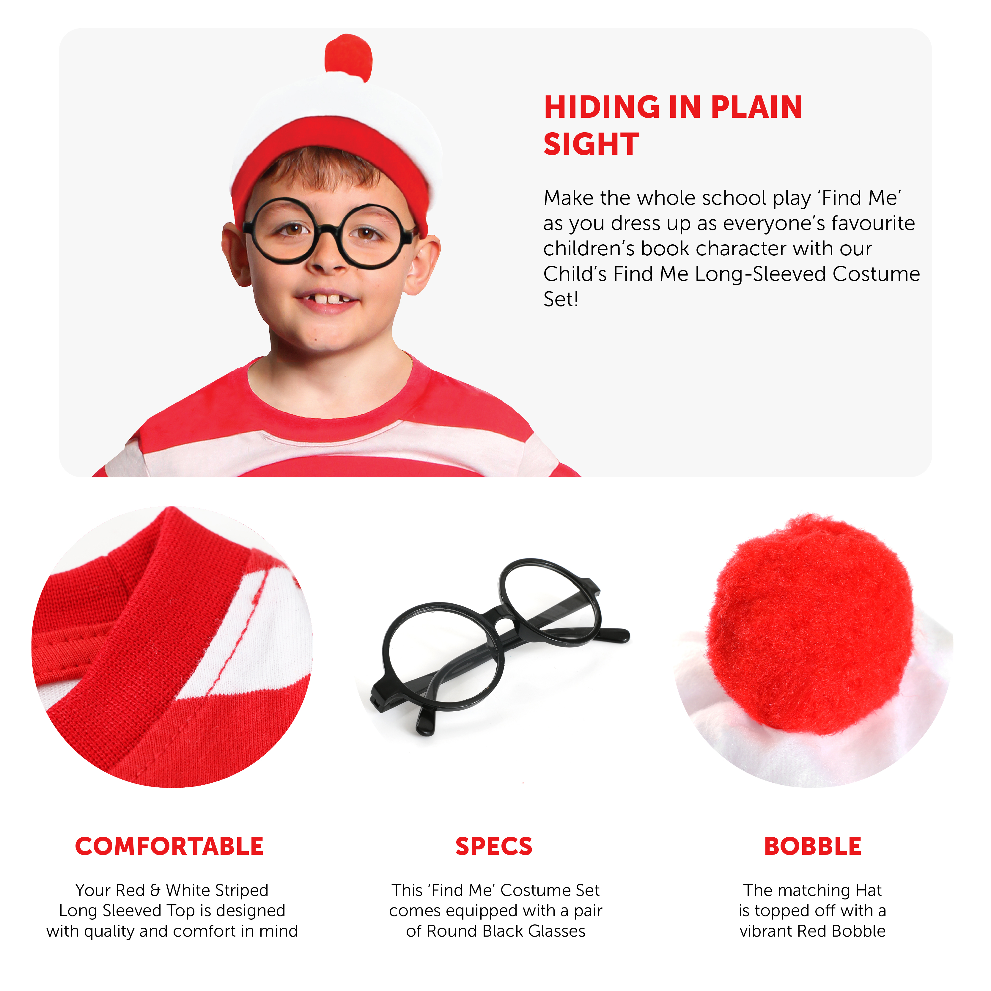 FIND ME LONG-SLEEVED COSTUME DETAILS: Your Child’s Find Me Long-Sleeved Set includes a Short Sleeved Red and White Striped T-shirt, Black Circular Glasses with lenses, and a Red and White Striped Bobble Hat!