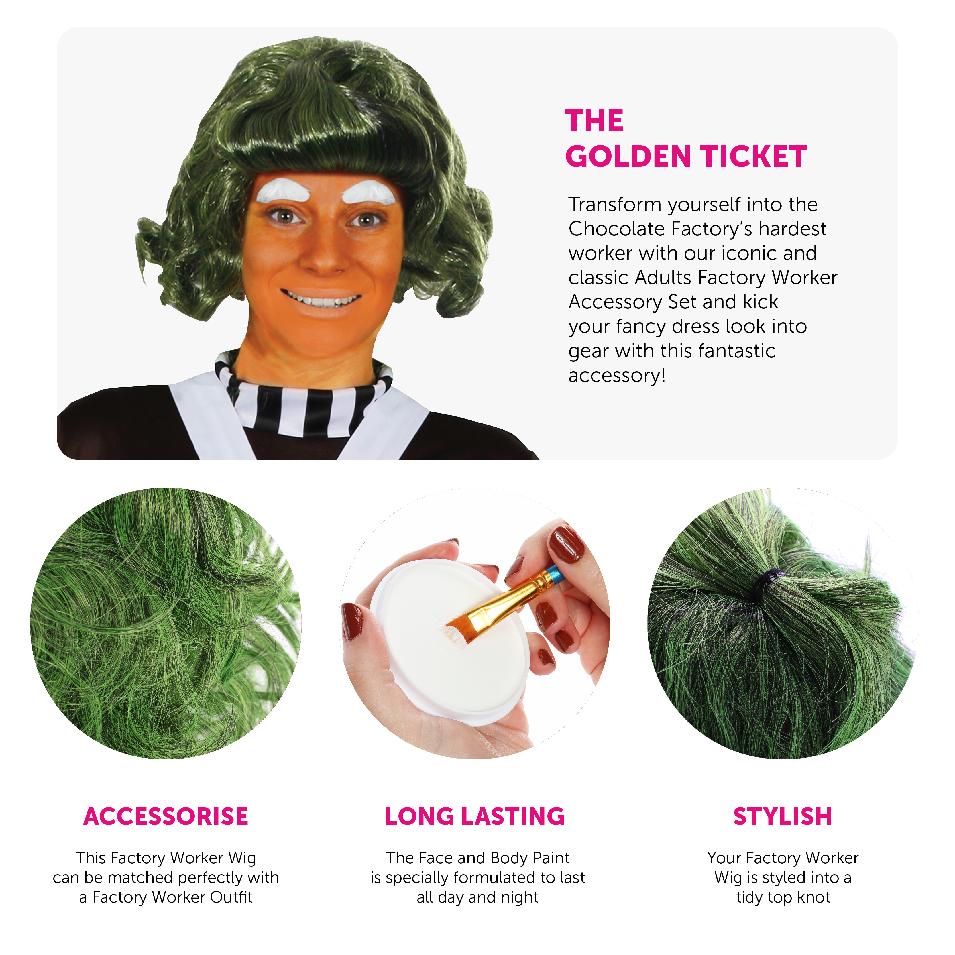 SET INCLUDES: Your Factory Worker Set includes a short, wavy Dark Green Wig, a palette of White Face and Body Paint, a palette of Orange Face and Body Paint, and White Adhesive Eyebrows, the perfect look for any fancy dress event!