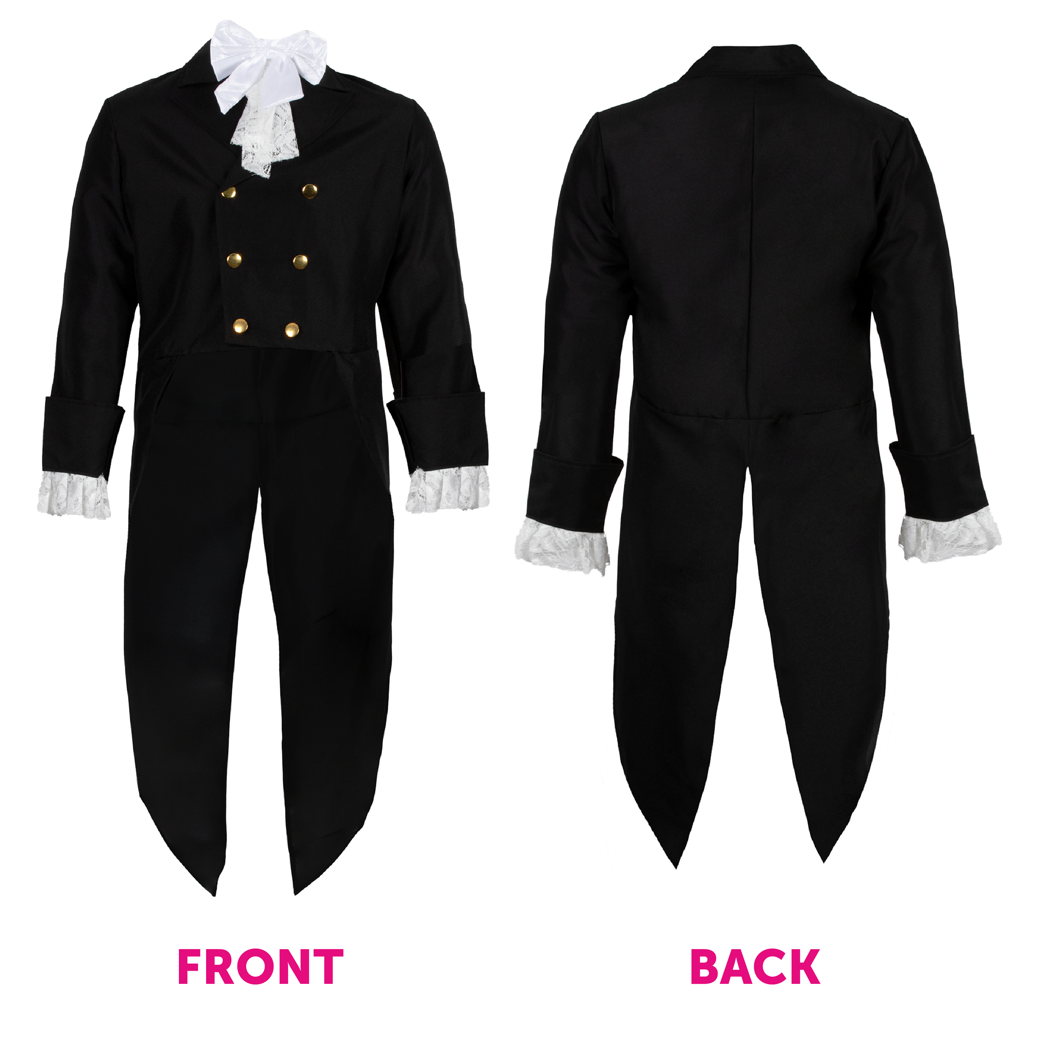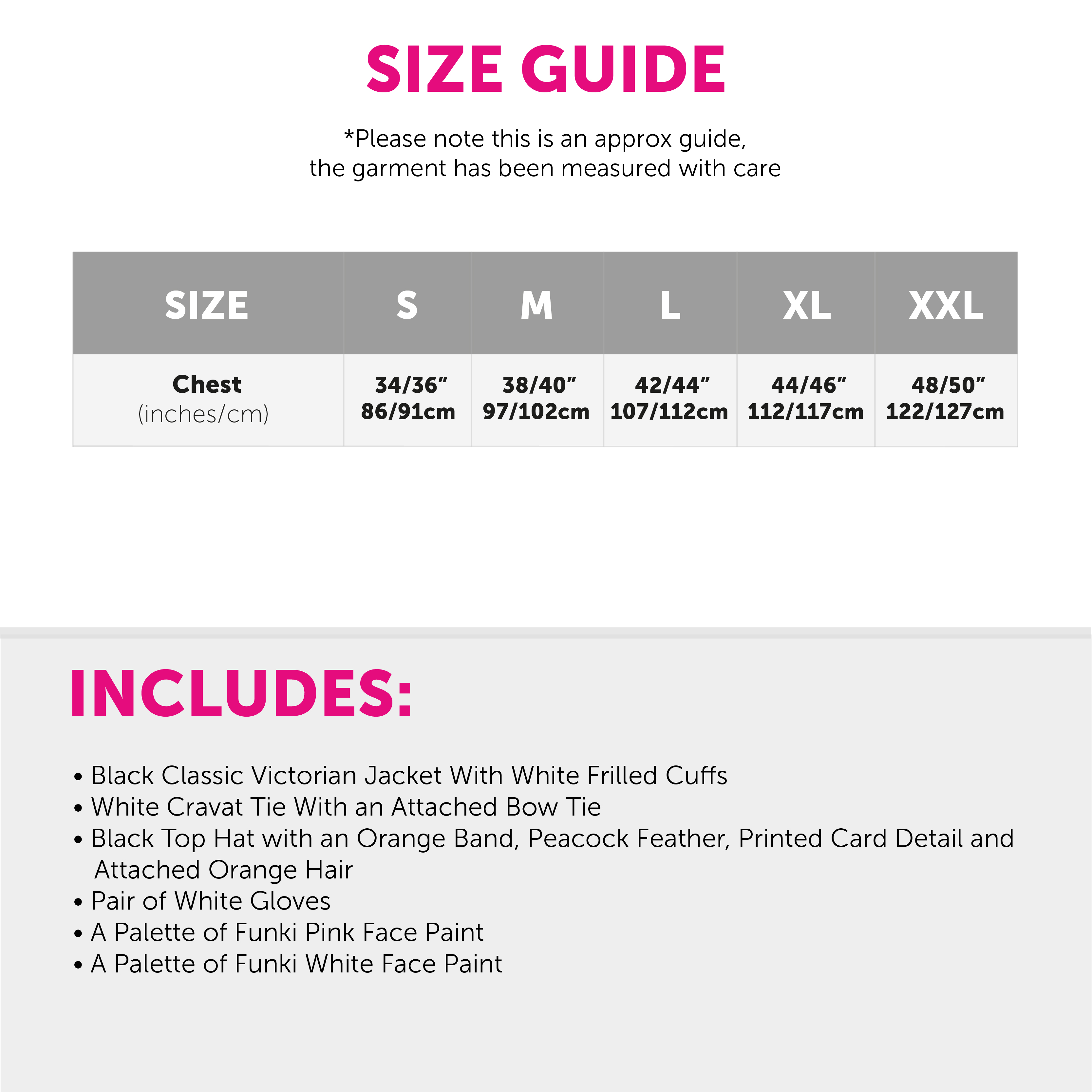 MAD HATTER COSTUME INCLUDES: This Adults Mad Hatter Costume includes a long, Black Tailcoat with White Frilly Cuffs and Cravat, a tall Black Top Hat with a silk-like Orange Band, Peacock Feather, Attached Orange Hair and a Printed Card, a pair of White Gloves, a palette of Pink Face Paint and a palette of White Face Paint!