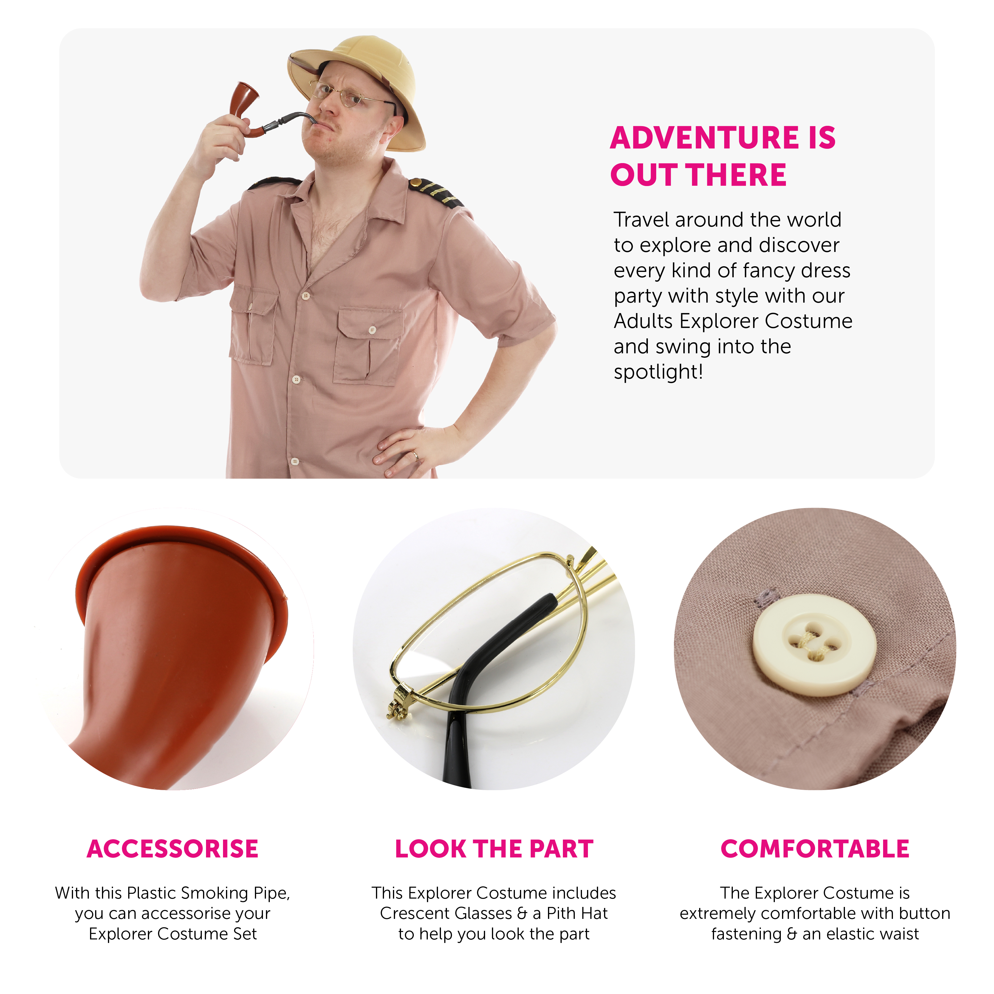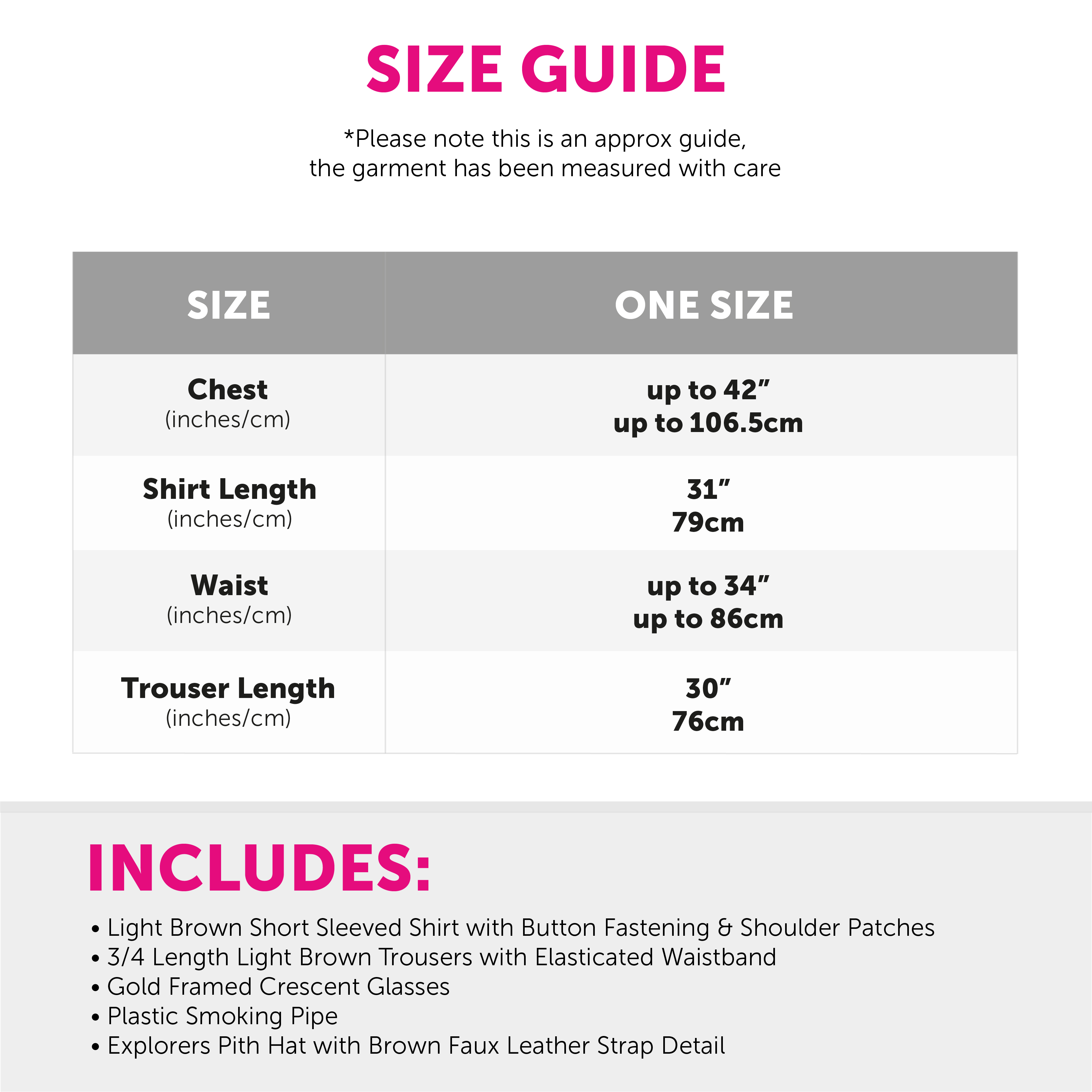 COSTUME DETAILS: Your Adults Explorer Costume includes a Light Brown Shirt with button fastening and shoulder patches, a matching pair of 3/4 length Trousers with an elasticated waistband, an Explorers Pith Hat detailed with a Brown Faux Leather Band, Gold Frame Crescent Shaped Glasses, and a Plastic Smoking Pipe!