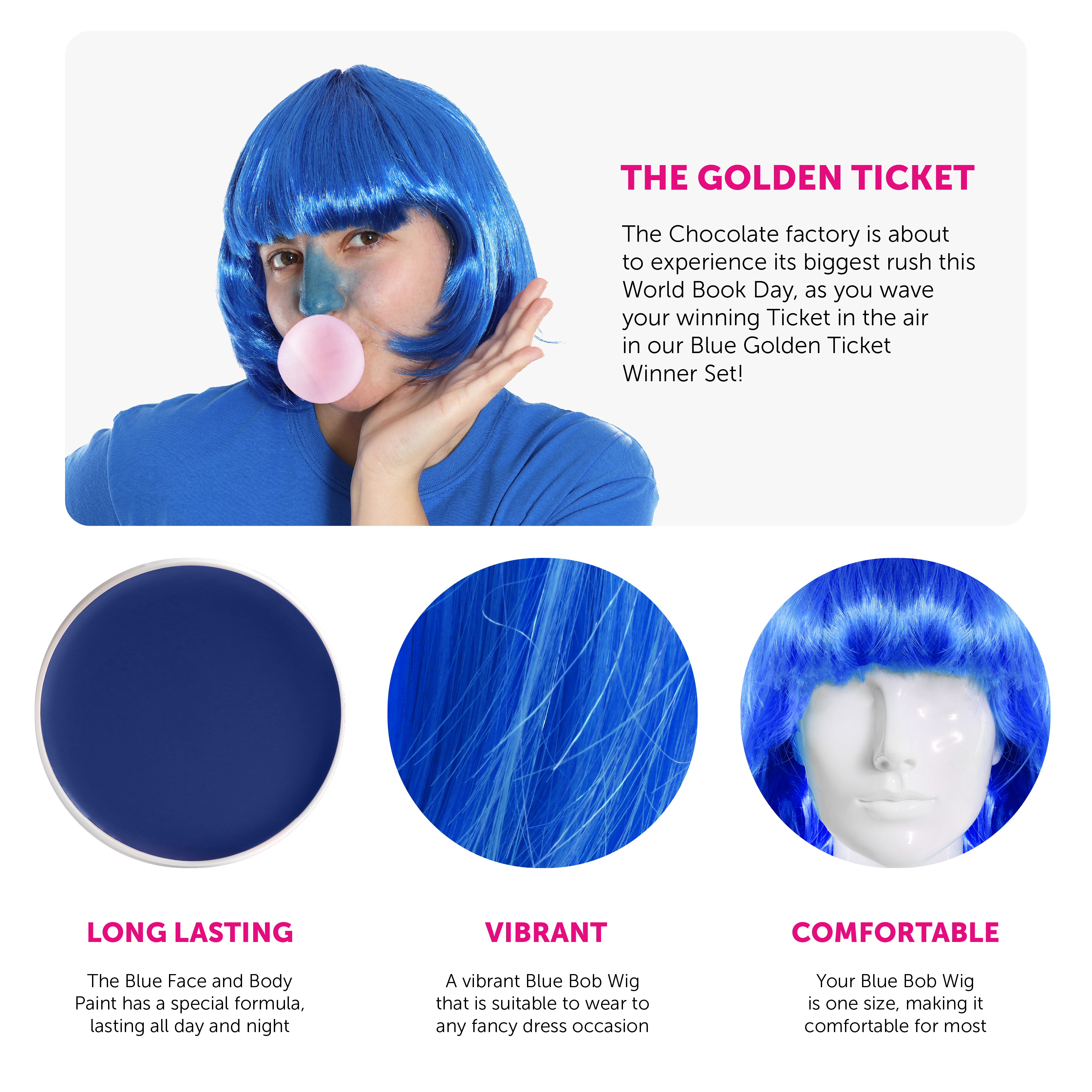 SET INCLUDES: Your Blue Golden Ticket Winner Set includes a short and sleek Blue Bob Wig and a palette of Blue Face and Body Paint, an iconic look for any fancy dress event!