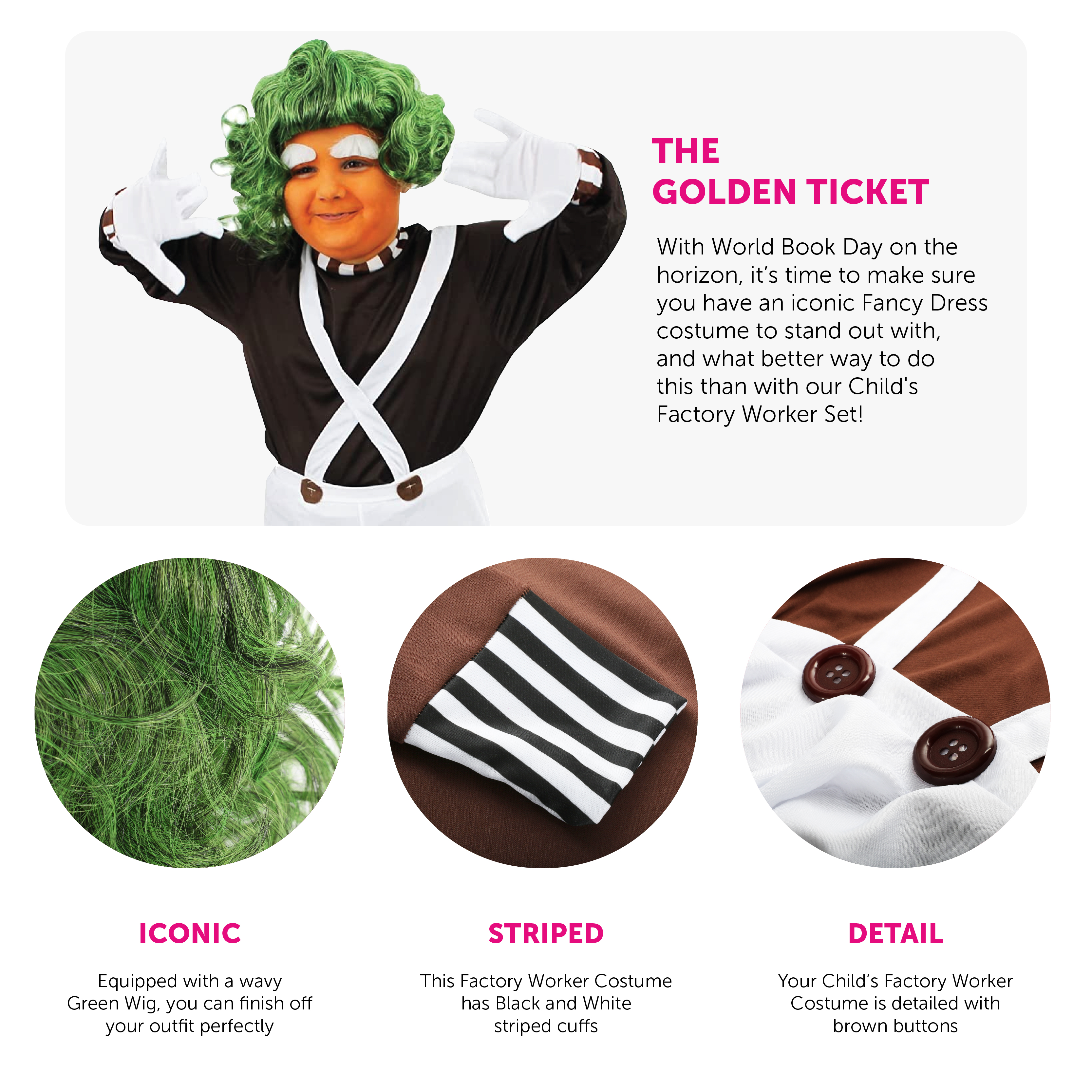 SET INCLUDES: This Child's Factory Worker Costume Set includes a White Dungarees detailed with Brown Buttons and a Brown Top with Striped Collar and Cuffs, and an iconic Green Wig!