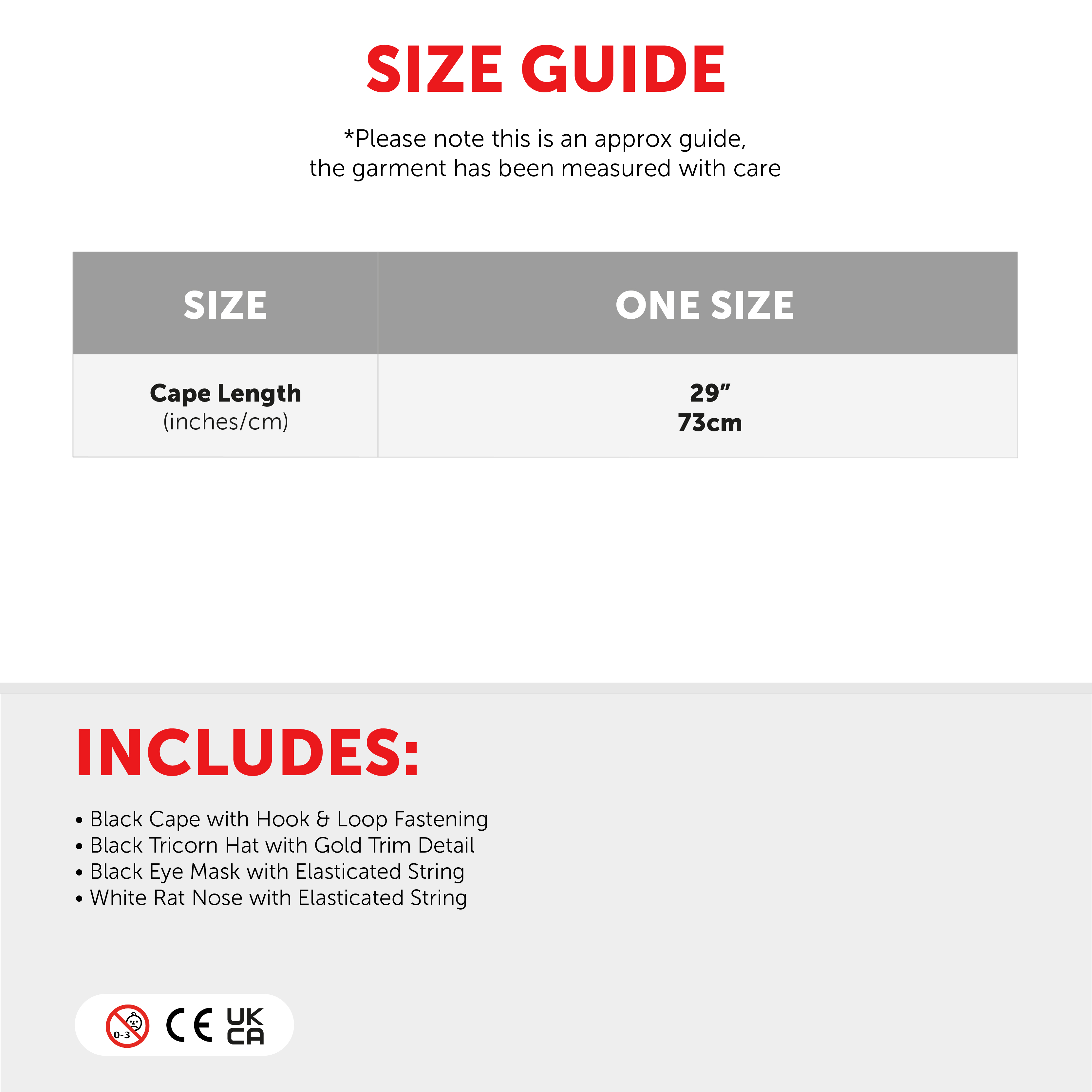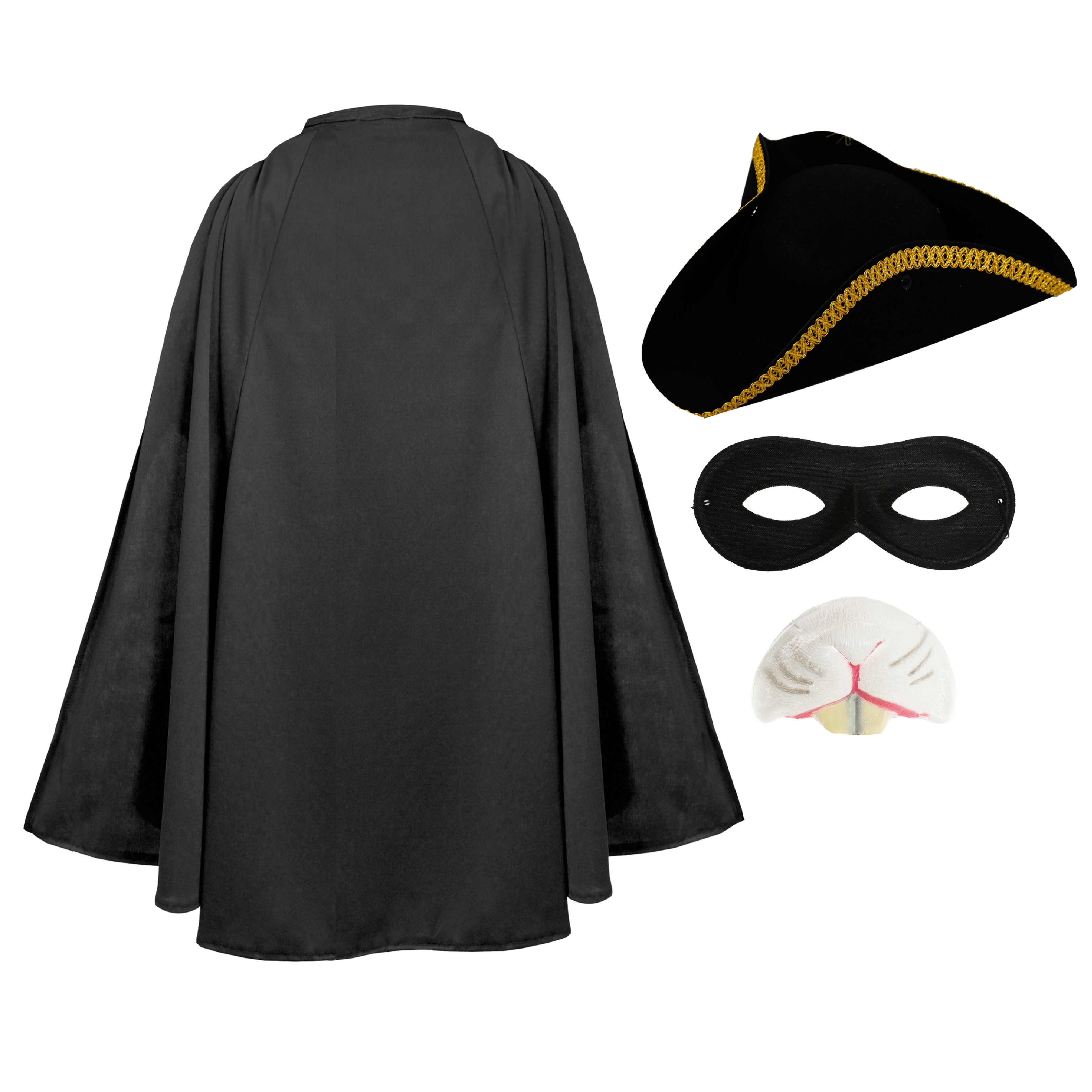 COSTUME SET INCLUDES: Your Child's Highway Rodent Costume Set includes a Black Cape, a Black Tricorn Hat with Gold Trim detail, Black Eye Mask and a Rat Nose on elastic strap!
