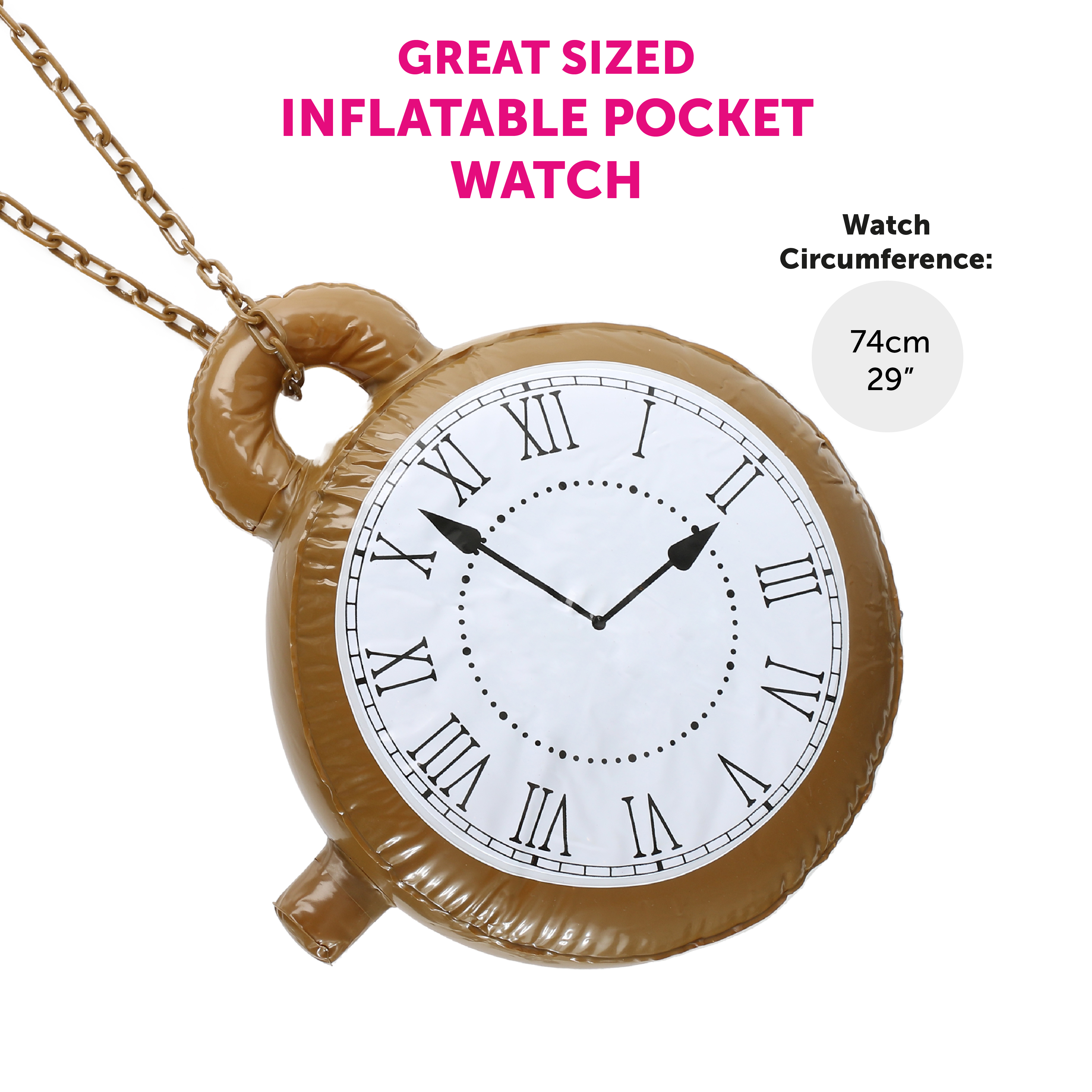 GREAT SIZED INFLATABLE: The Inflatable Pocket Watch is a great size with the circumference of the Watch face measuring 74cm (29") - a great sized Inflatable to add to your outfit!