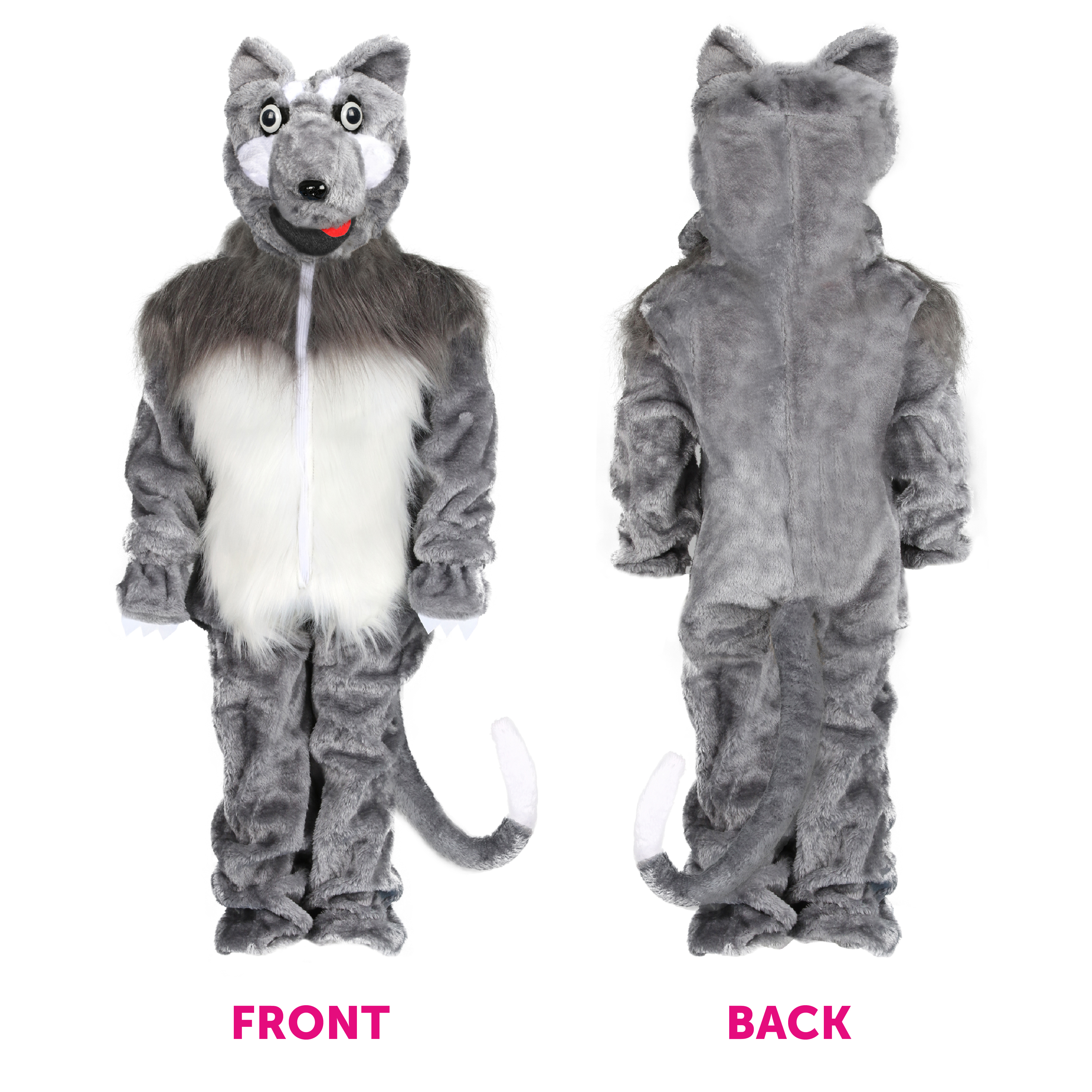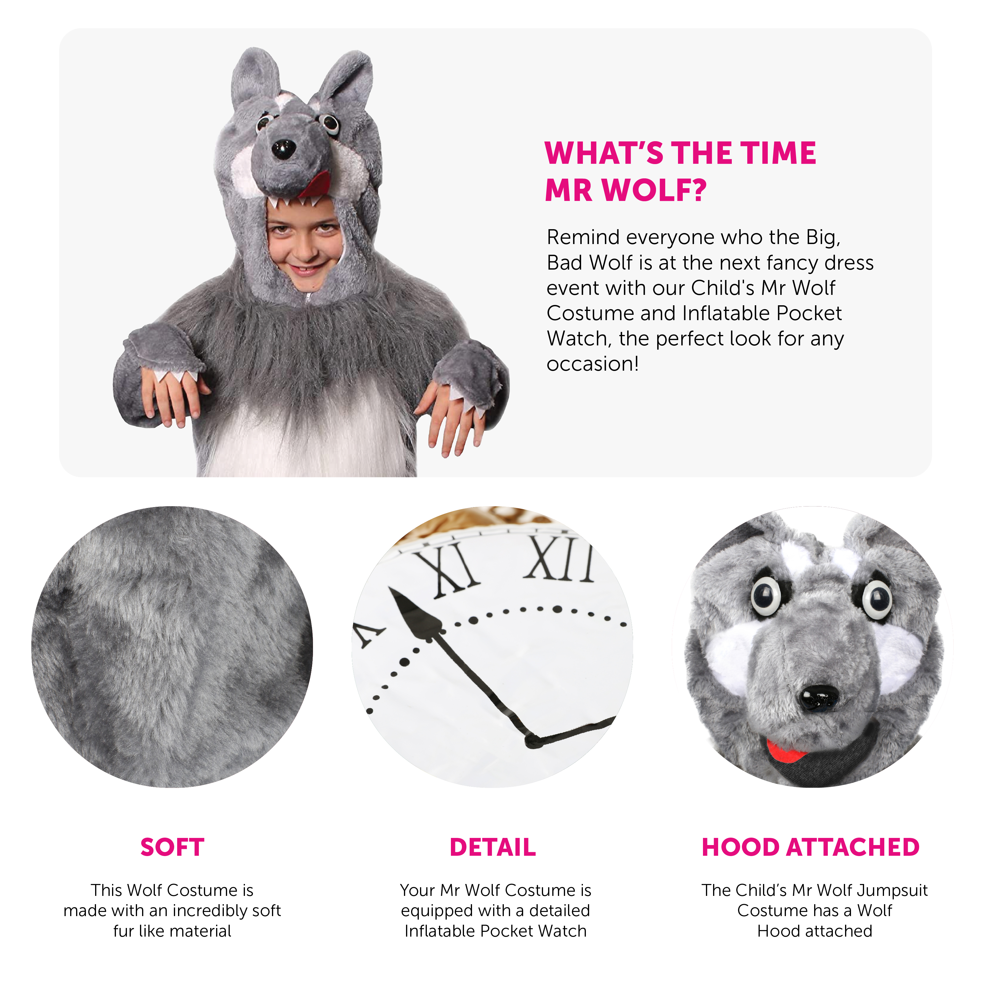 COSTUME INCLUDES: Our Child's Mr Wolf Costume includes a soft Grey Wolf Costume with tummy fur and an attached Wolf hood, and an Inflatable Pocket Watch, the perfect look for any fancy dress event!