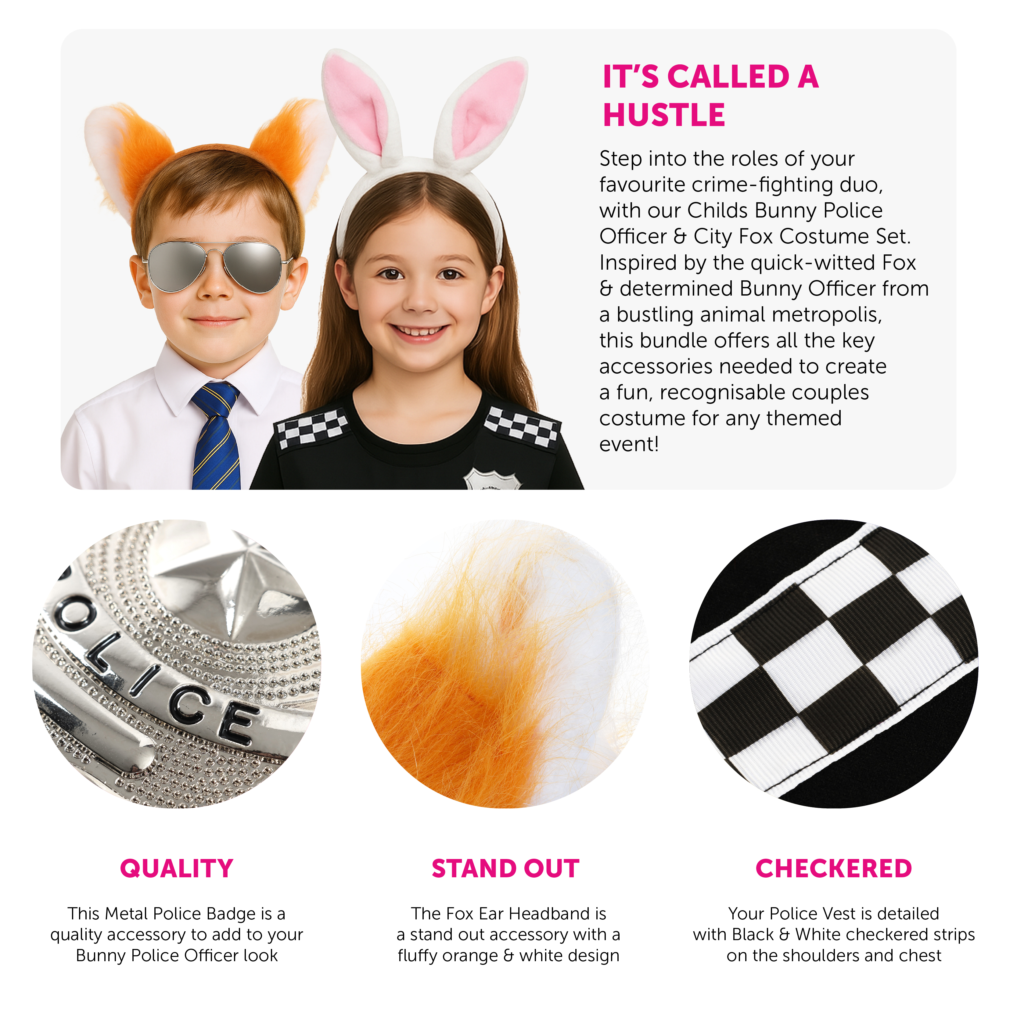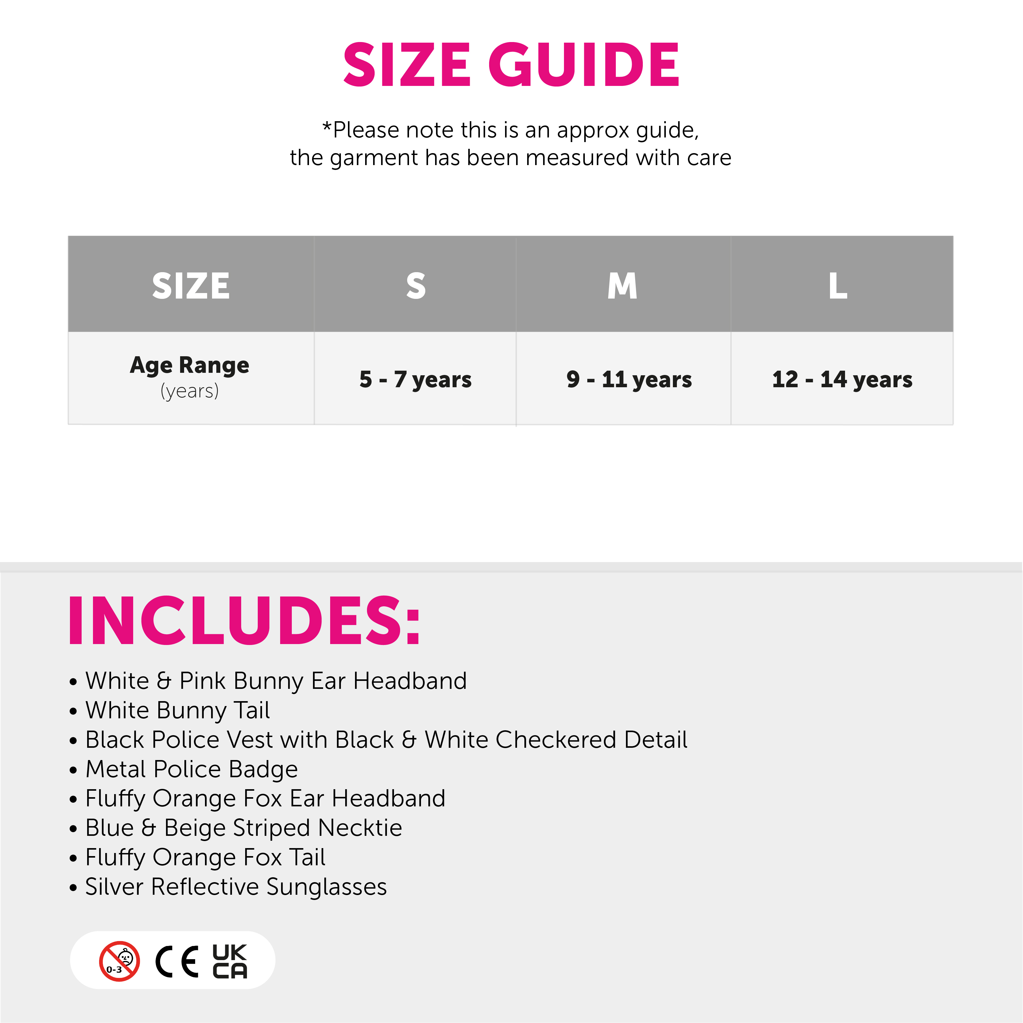 SET INCLUDES: This Childs Duo Costume Set includes a White & Pink Bunny Ear Headband with a White Bunny Tail, a Black Police Vest with Checkered Black & White details, a metal pin badge with a large star and 'Special Police' on the front, an Orange fluffy Fox Ear Headband, Silver Reflective Sunglasses, a Blue & Beige Striped Necktie, and a fluffy Orange Fox Tail, the perfect way to finish off your outfit!