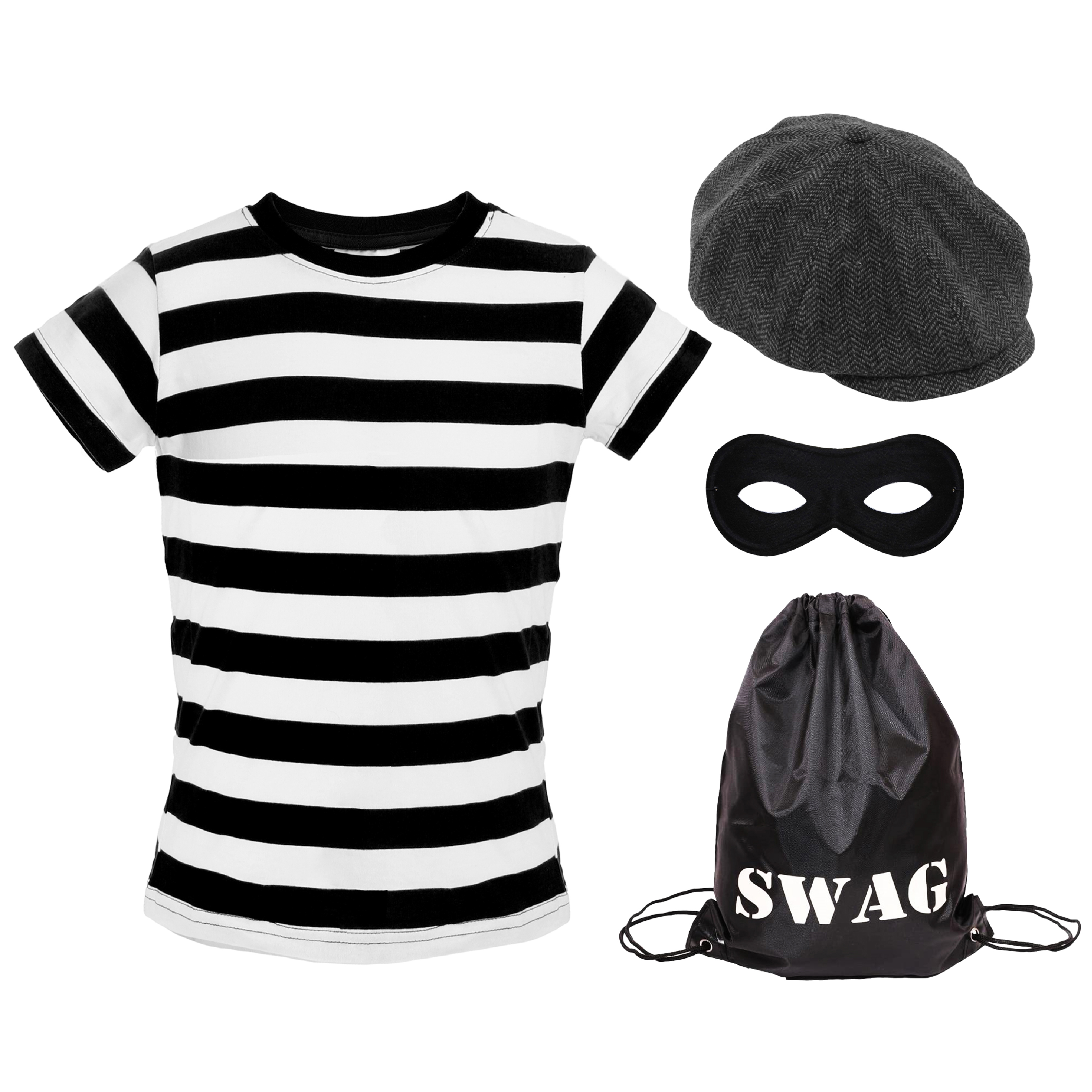 COSTUME SET INCLUDES: This Child's Storybook Burglar Costume includes a Short sleeved, Black and White Top, a Black Eye Mask on a comfortable elasticated strap, a Grey Flat Cap, and a Black Drawstring Bag with SWAG in White Print across the front, the perfect look for you this World Book Day!