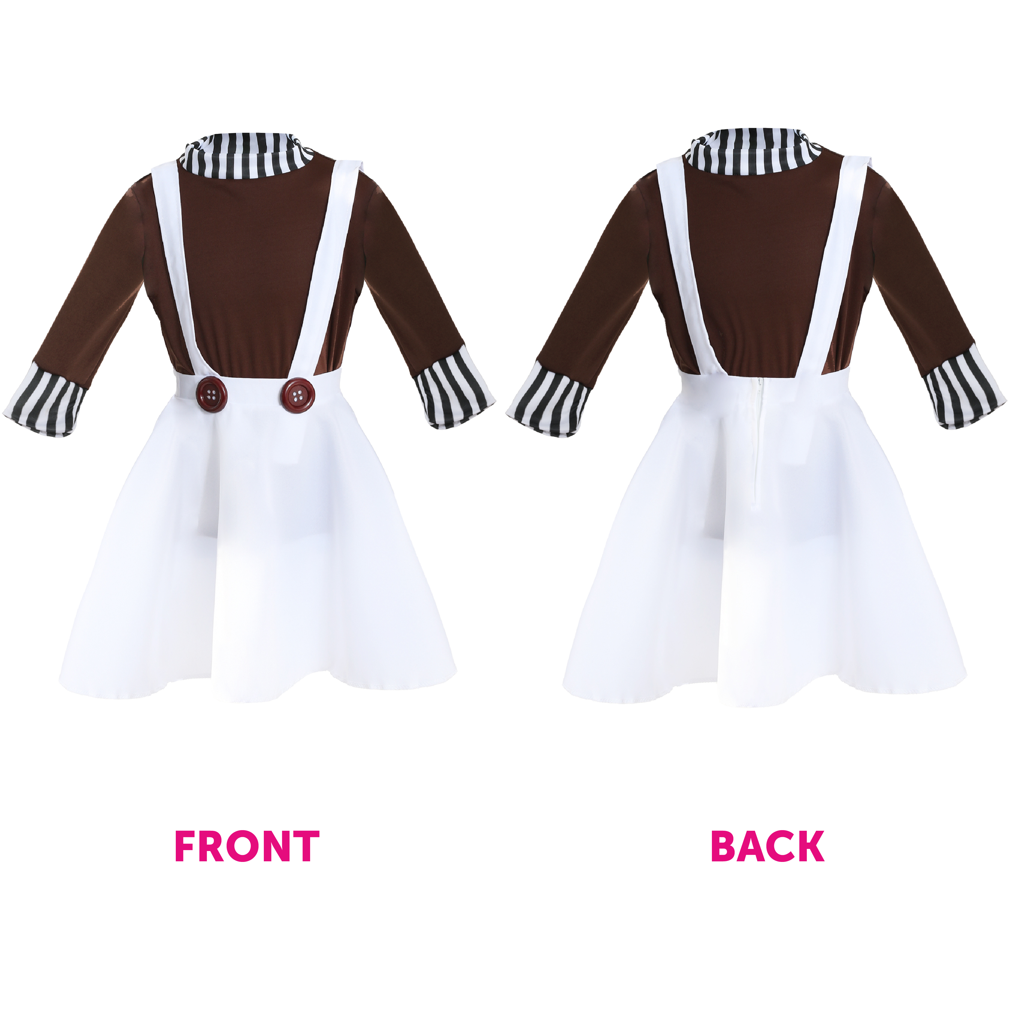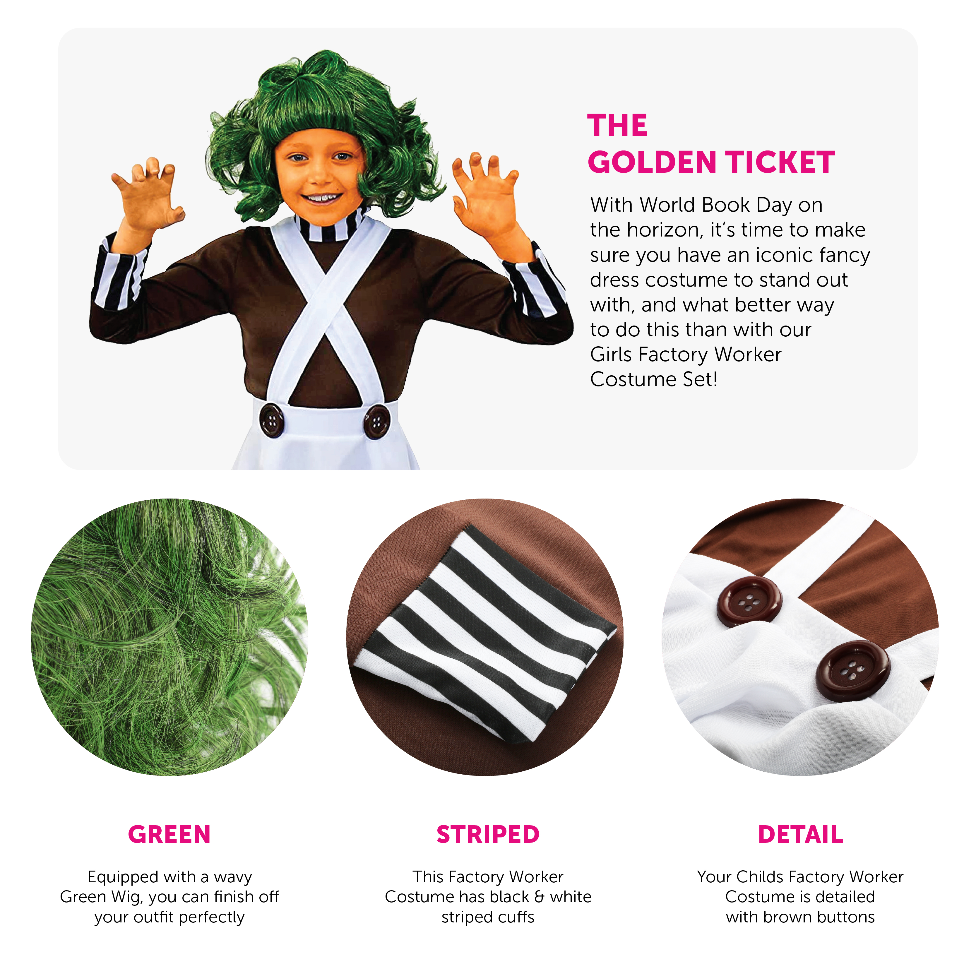 SET INCLUDES: This Girls Factory Worker Costume Set includes a White Dungaree Skirt detailed with Brown Buttons and a Brown Top with Striped Collar and Cuffs, an iconic Green Wig, and Brown and White Striped Tights!