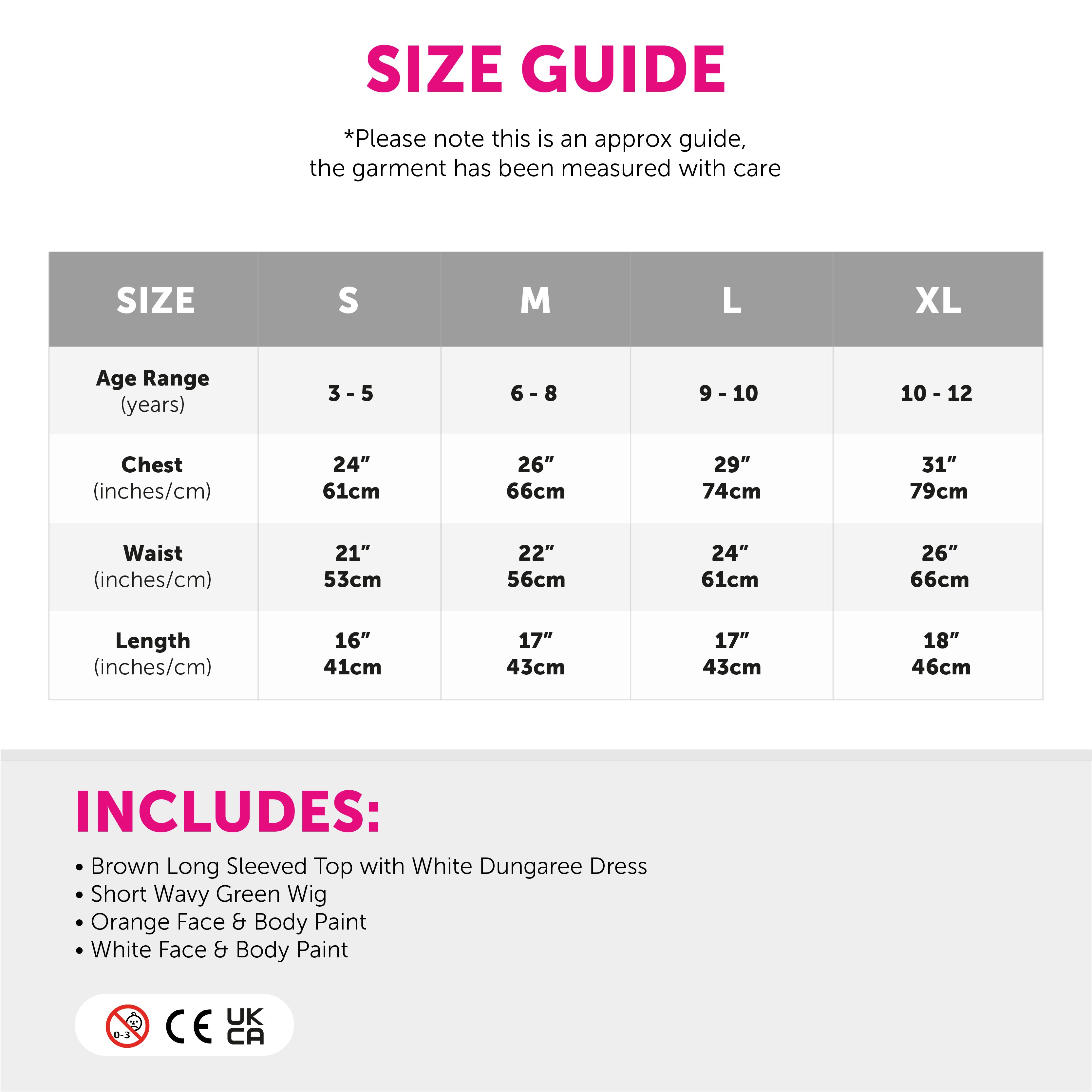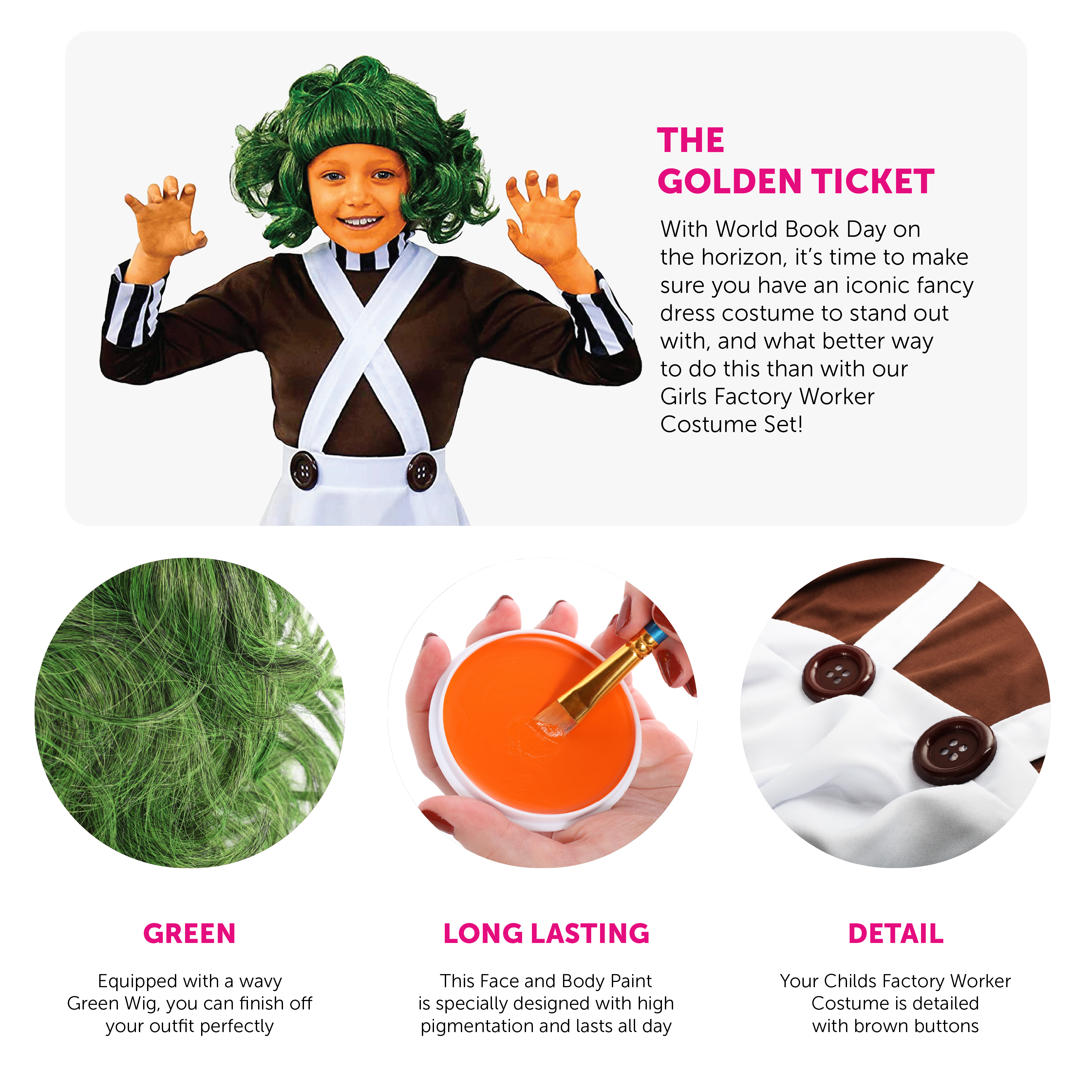 SET INCLUDES: This Girls Factory Worker Costume Set includes a White Dungaree Skirt detailed with Brown Buttons and a Brown Top with Striped Collar and Cuffs, an iconic Green Wig, a palette of White Face Paint, and a palette of Orange Face Paint!