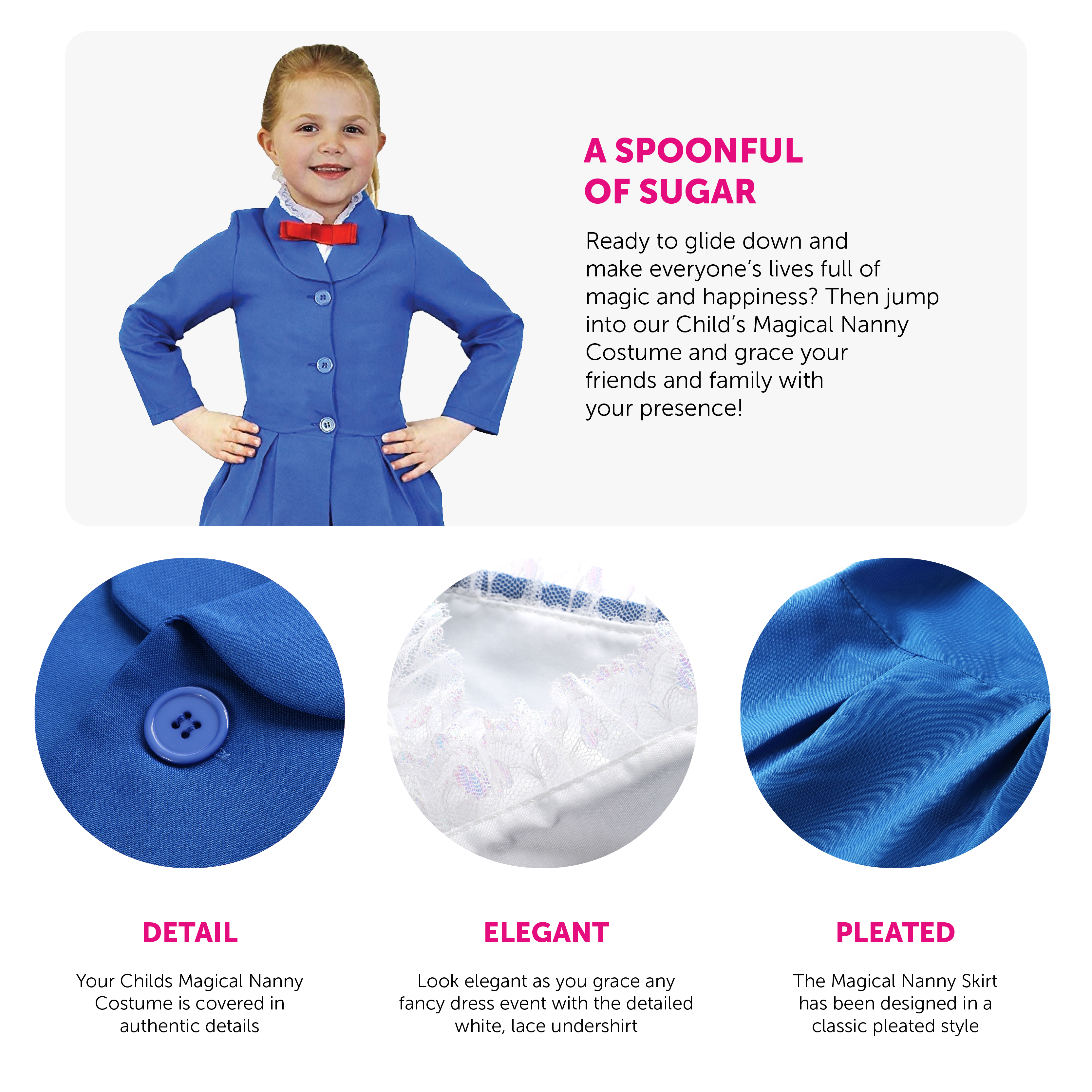 AVAILABLE IN MULTIPLE SIZES: Our Child's Magical Nanny Costume is available in sizes Small – X-Large: Small (3 - 4 years) Chest 20/22" (51/56cm), Waist 20" (51cm), Skirt Length 19" (48cm) | Medium (5 - 6 years) Chest 22/24" (56/61cm), Waist 22" (56cm), Skirt Length 20" (51cm) | Large (7 - 8 years) Chest 24/26" (61/66cm), Waist 24" (61cm), Length 23" (58cm) | X-Large (9 - 10 years) Chest 28/30" (71/76cm), Waist 28" (71cm), Length 25" (63cm)