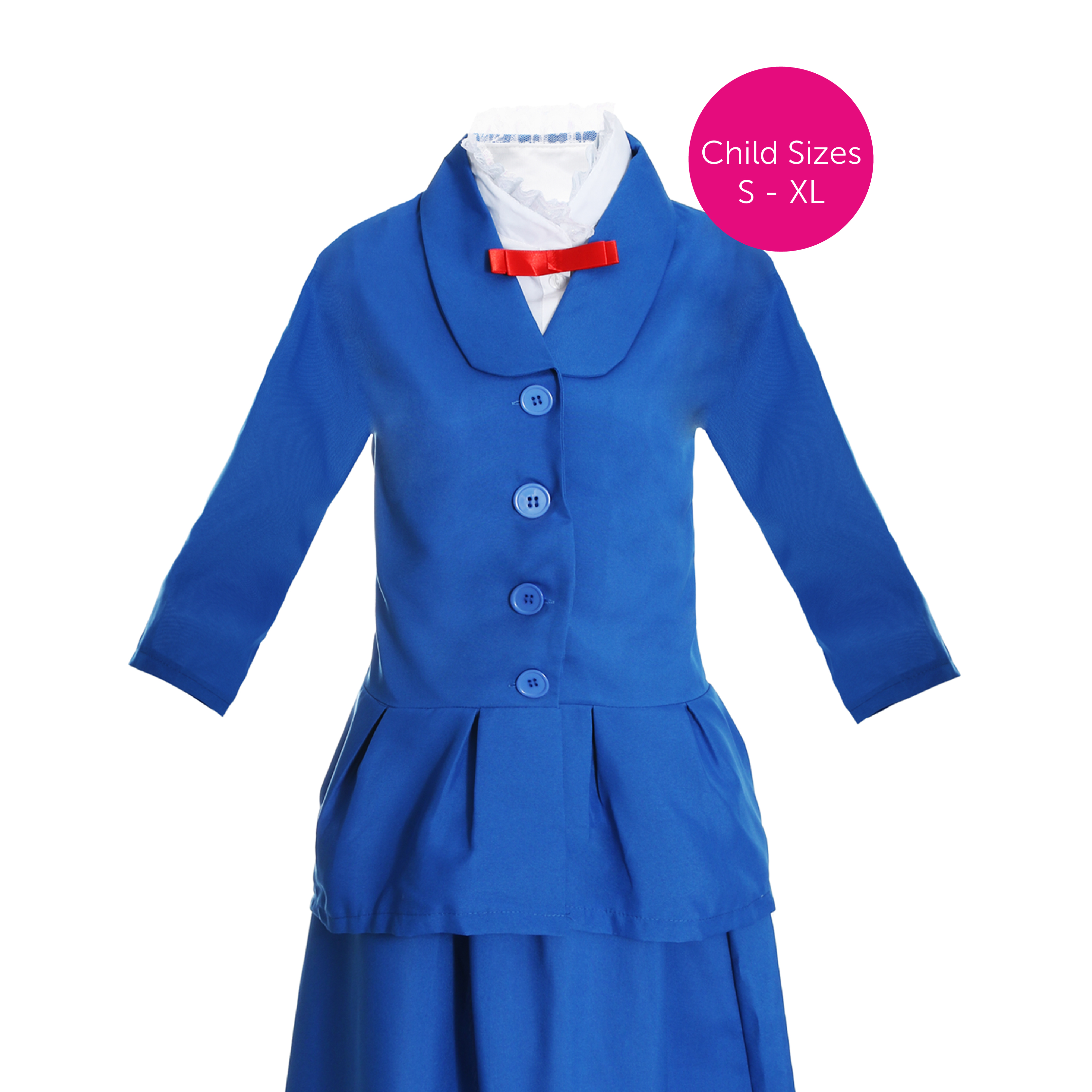 COSTUME SET INCLUDES: The Child's Magical Nanny Costume includes a Royal Blue, easy button up Jacket with an attached White Blouse inside and Red Bow Tie, and a matching Long Blue Skirt, the perfect World Book Day Costume!