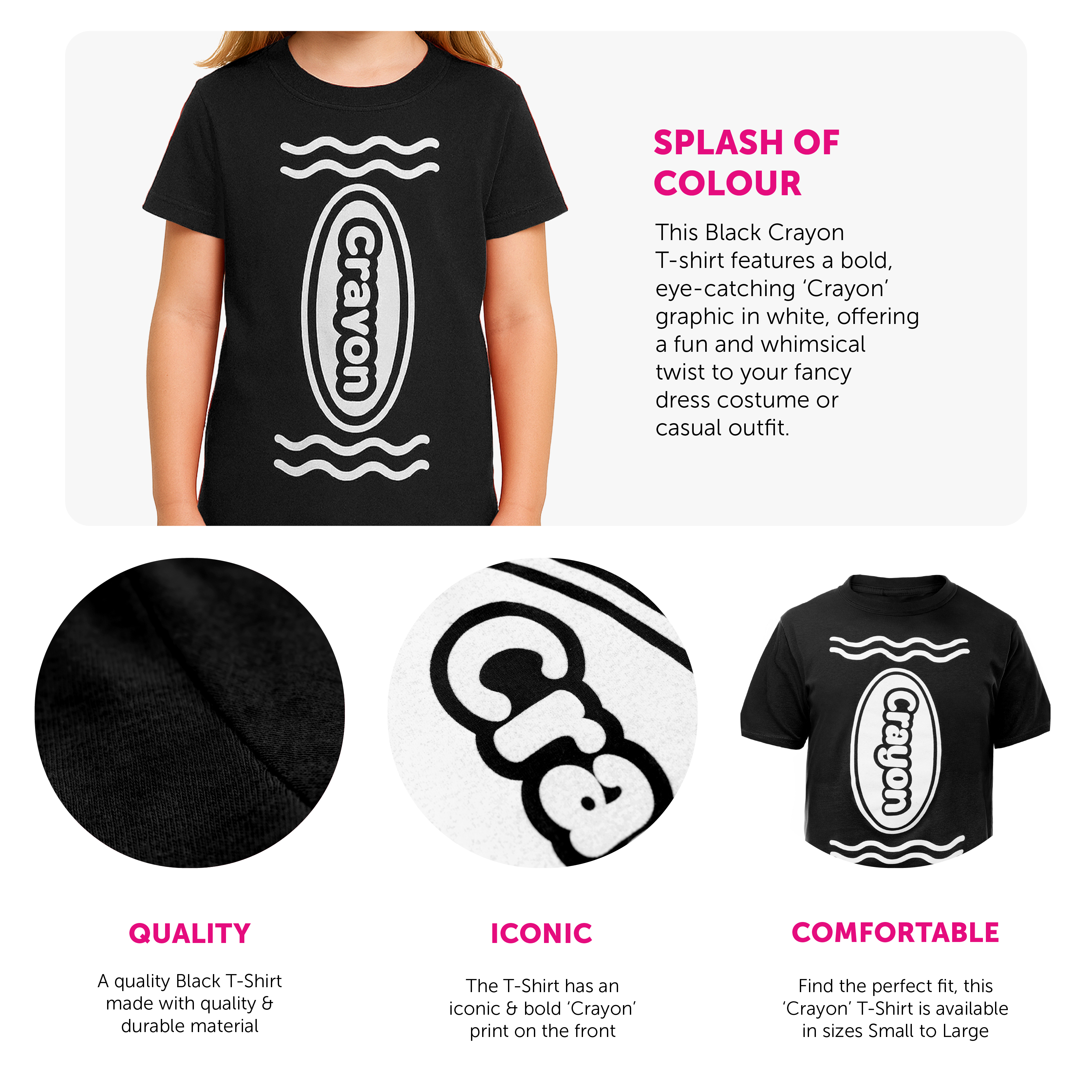 FUN AND CREATIVE DESIGN: This black crayon T-shirt features a bold, eye-catching "Crayon" graphic in white, offering a fun and whimsical twist to your fancy dress costume or casual outfit.