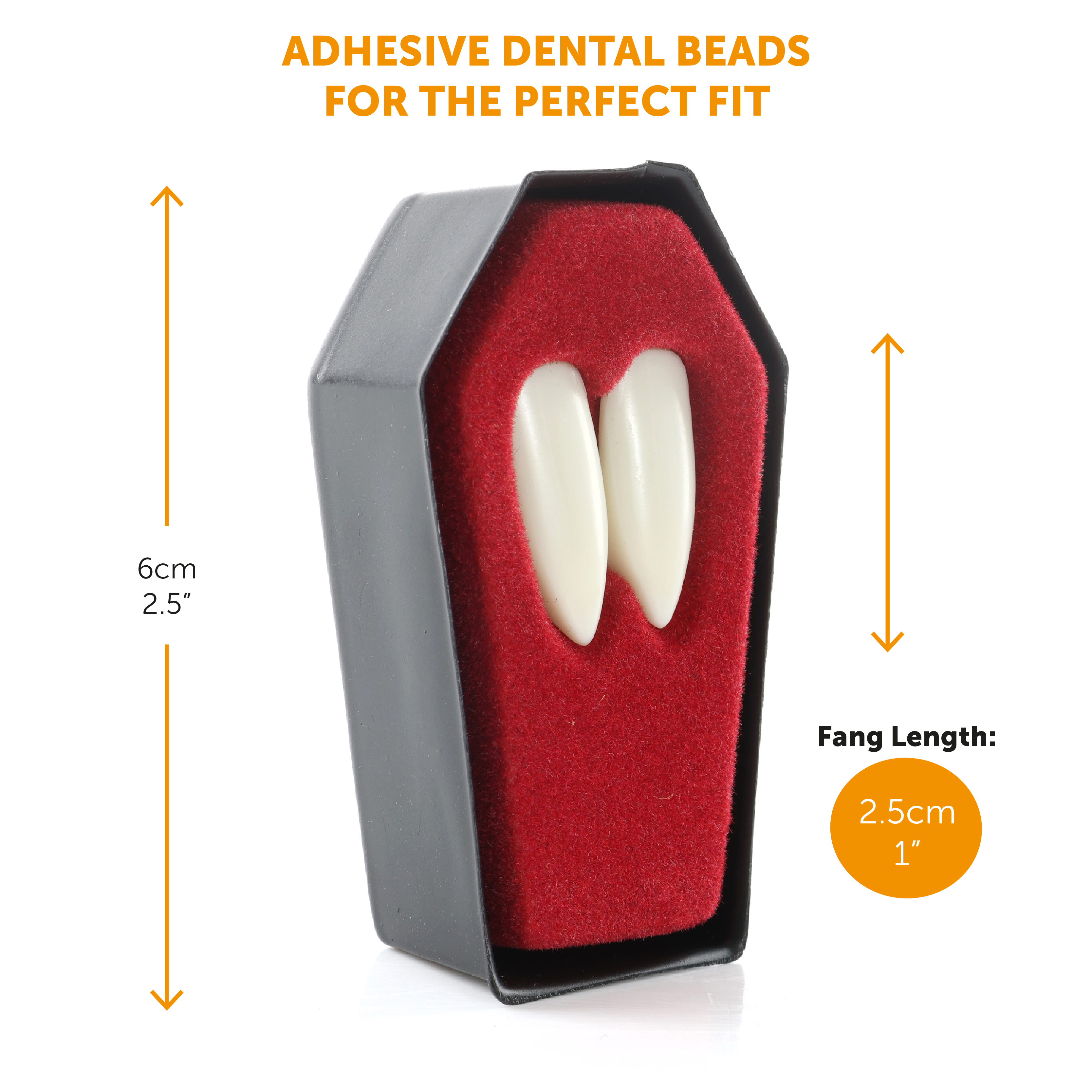 EASY TO APPLY: 1. Bring 170.5ml - 227ml (6oz - 8oz) of water to boil and pour into a CERAMIC mug | 2. Pour the Dental Adhesive Beads into the water | 3. After approx. 1 minute, or when the Beads turn from white to clear, remove them from the water with a METAL spoon | 4. Carefully test the temperature of the Beads, whilst still very warm use your fingers to roll the Dental Adhesive into a thick worm shape | 5. Place the rolled Adhesive to the back of the Fangs, squeezing gently but firmly until a small amount of Adhesive comes through each of the holes | 6. Ease your tooth into the soft Adhesive until it touches the bottom | 7. Use your tongue to push excess Adhesive around the tooth | 8. Gently remove the Fang and allow it to cool for 10 minutes, it will return to the white colour once cooled | 9. Trim off any excess Adhesive | 10. Fit the appliance back onto your tooth - if it is not successful, reheat the Adhesive and repeat the process