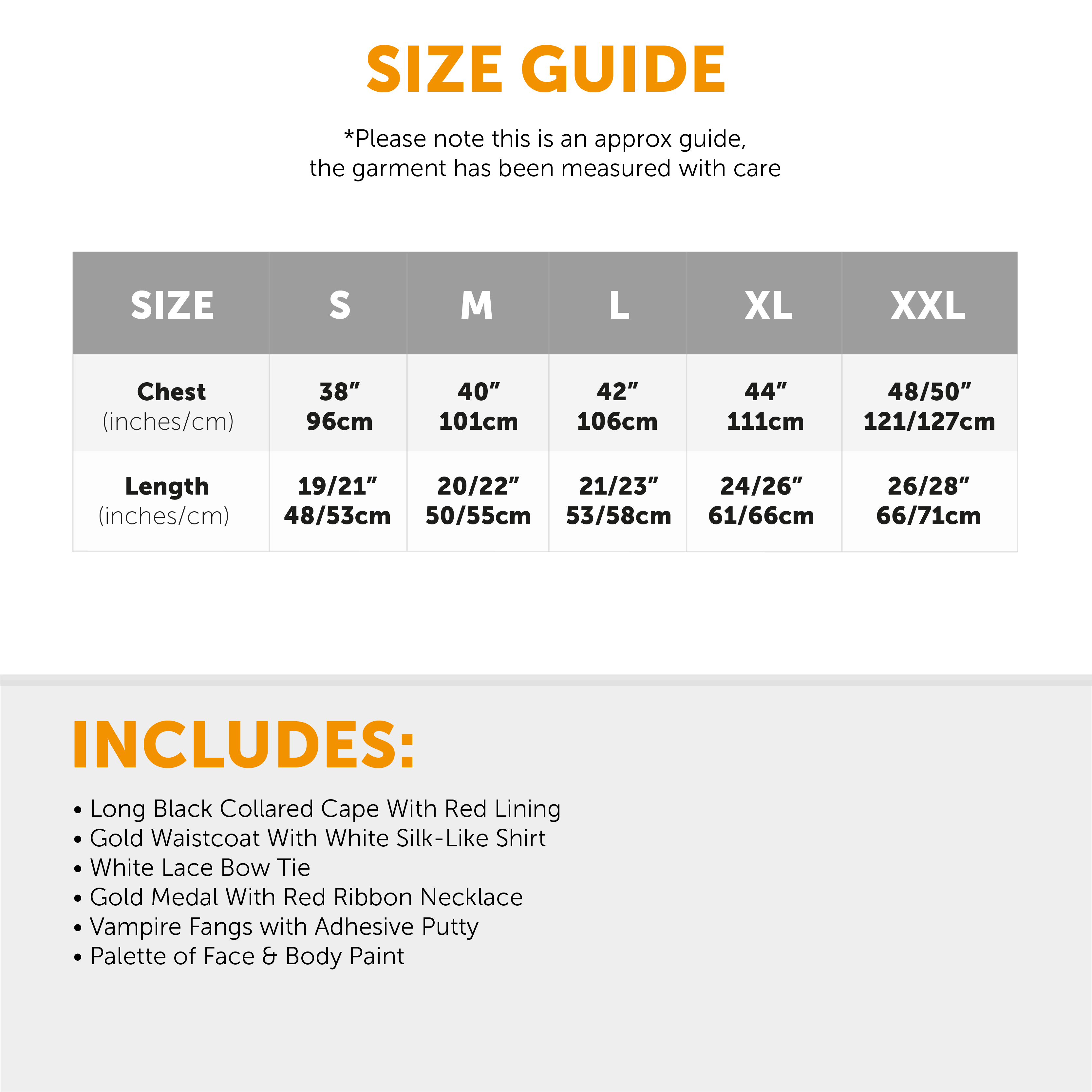 AVAILABLE IN MULTIPLE SIZES: Your Men’s Vampire Costume is available in multiple sizes from Small to XX-Large: Small - Chest 38” (96cm), Length 19/21” (48/53cm) | Medium - Chest 40” (101cm), Length 20/22” (50/55cm) | Large - Chest 42” (106cm), Length 21/23” (53/58cm) | X-Large – Chest 44” (111cm), Length 24/26” (61/66cm) | XX-Large – Chest 48/50” (121/127cm), Length 26/28” (66/71cm)